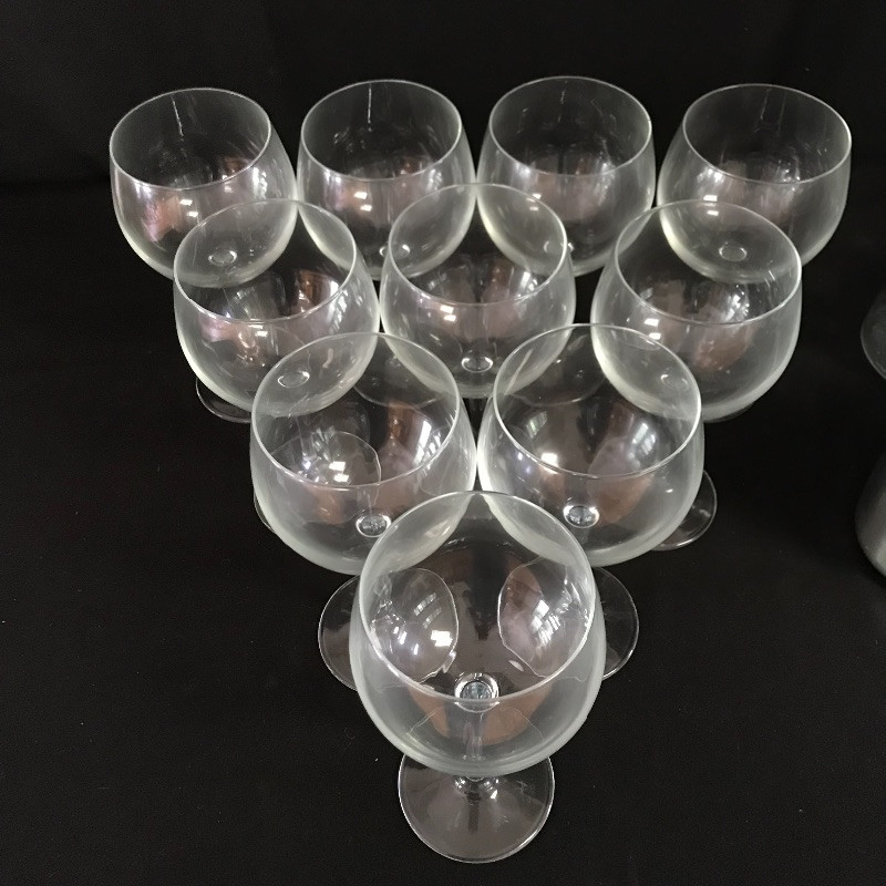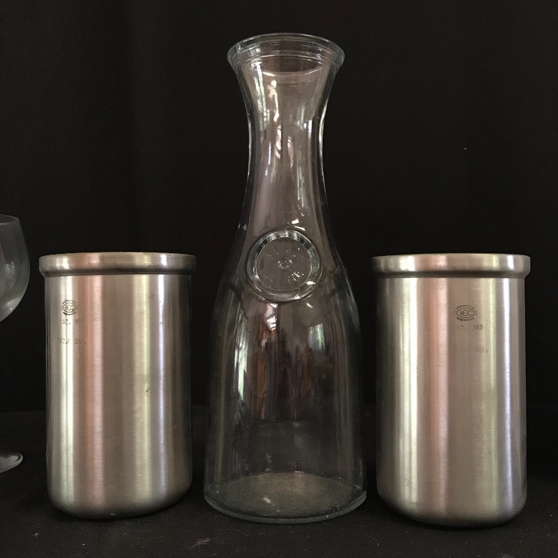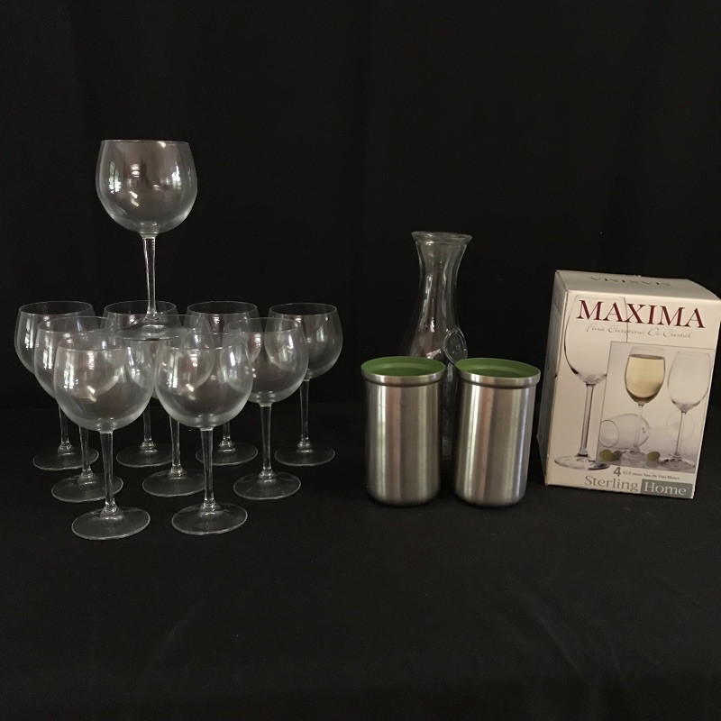 New in box, Maxima tall four glass set with a smaller mouth perfect for white wine. Lot also includes ten Bormioli Rocco red wine glasses that have a great heavy weight to them without a thick mouth feel. These are 8” tall with a 3.5” diameter mouth. Two metal and chartreuse chillers and a glass liter carafe for all wines, see images.