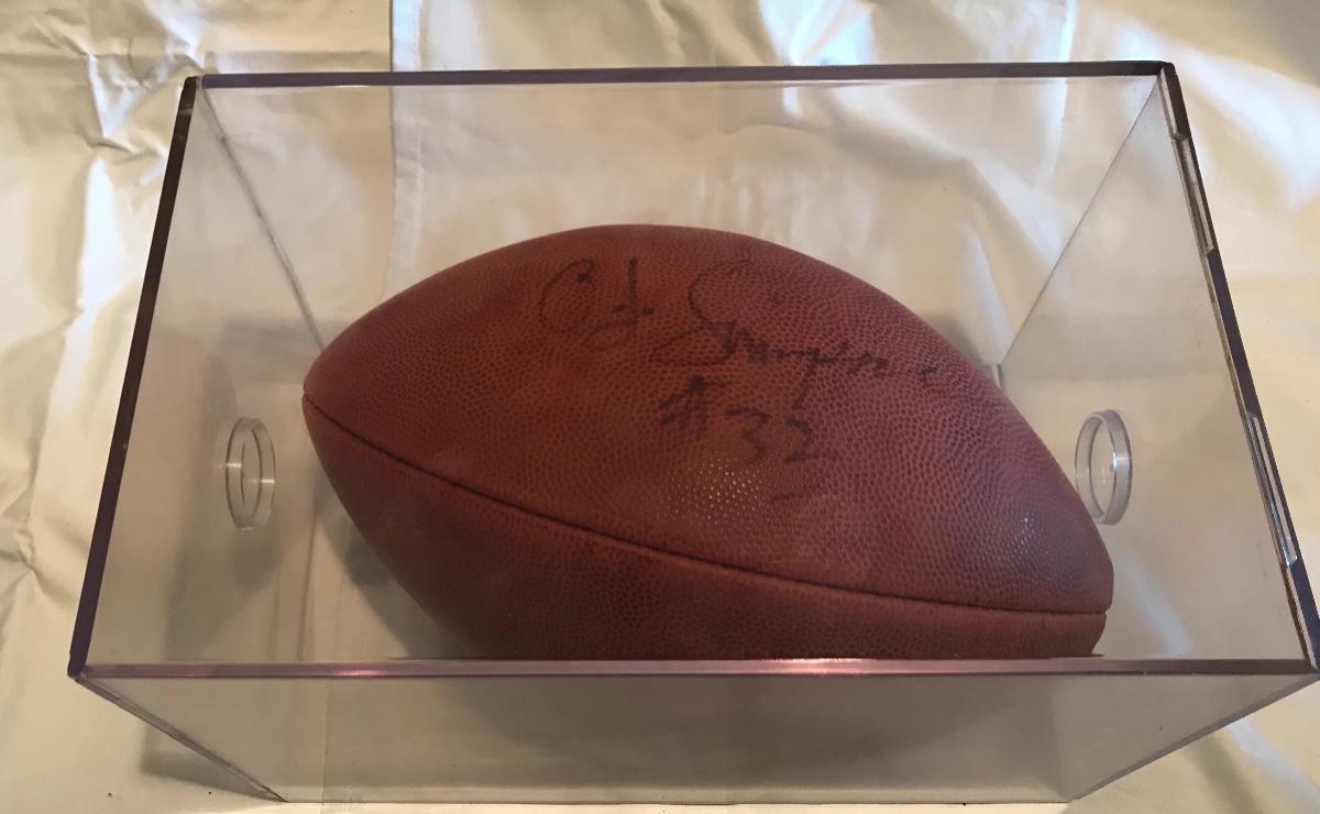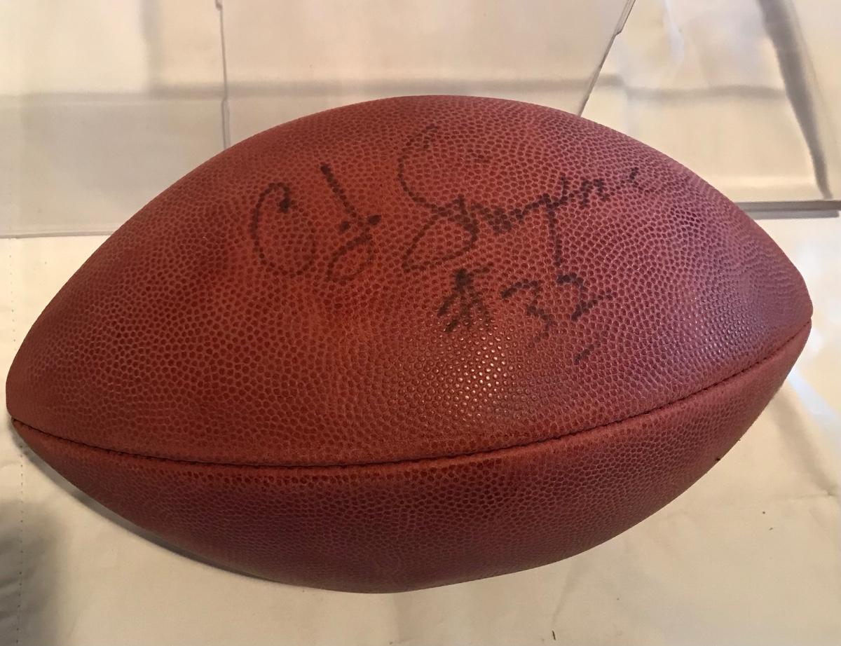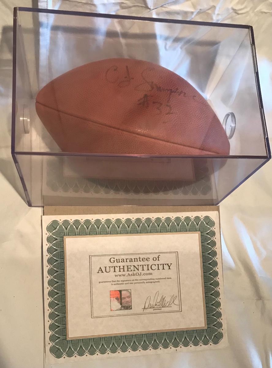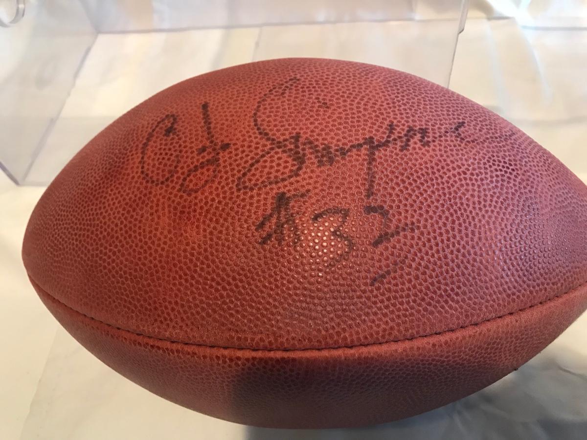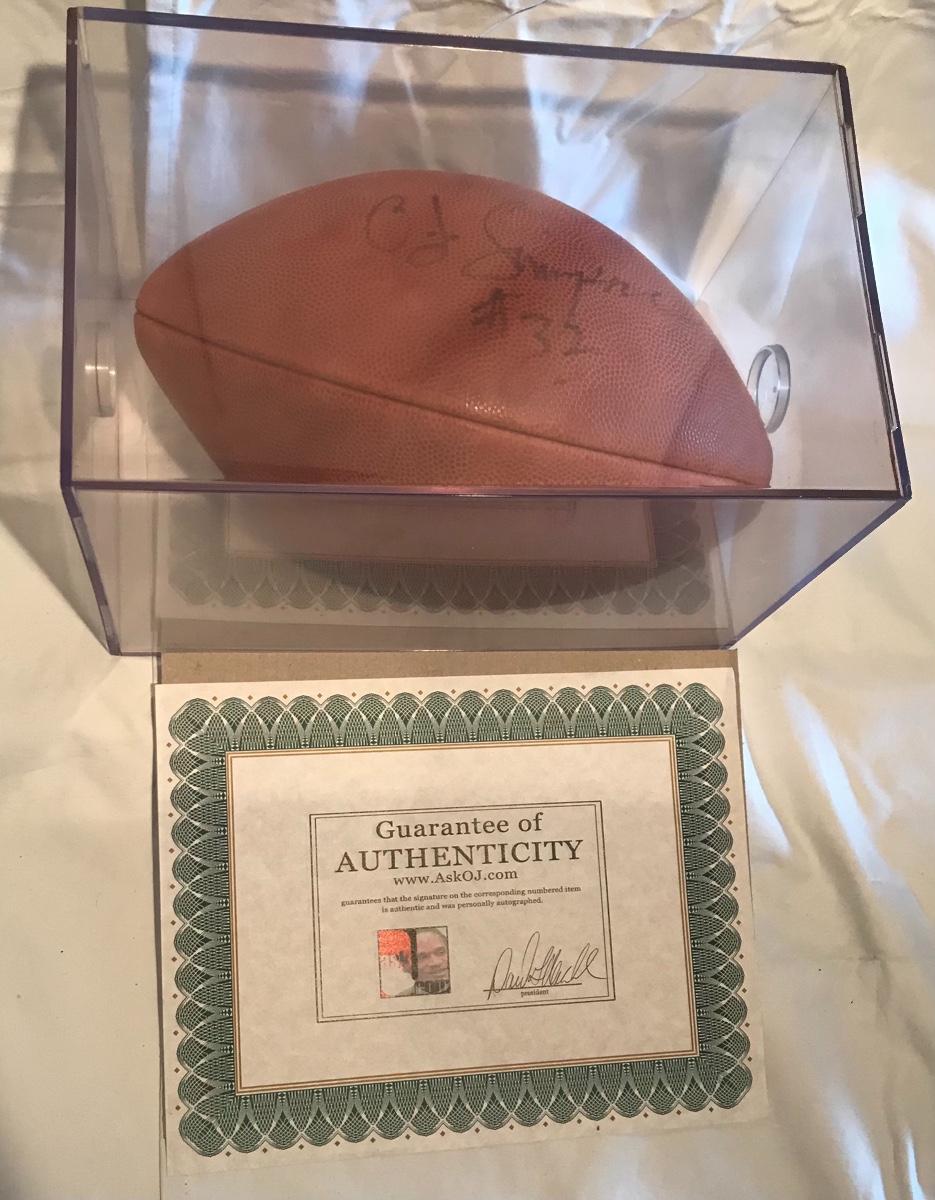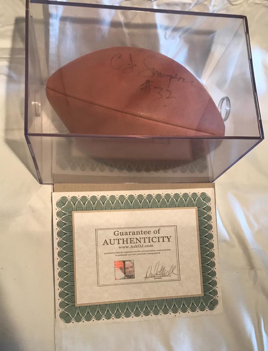 Official NFL football autographed by O.J. Simpson, includes plastic case and certificate of authenticity. The pictures show condition, measurements if taken, and what is included in the lot. Due to the large amount that we photograph and the time frame, we are not always able to take measurements. All items unless noted, are pre-owned and have been used. If you purchased furniture, you must bring help. We do not allow one person to carry large furniture out on their own. Bring help, tools and a truck for the safety of our client’s homes, and your personal safety. Company policy. Thank you.