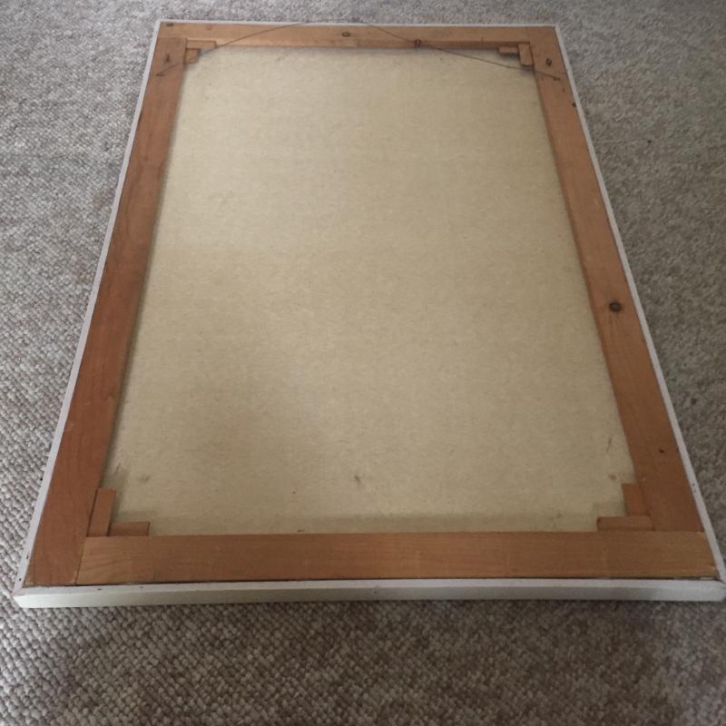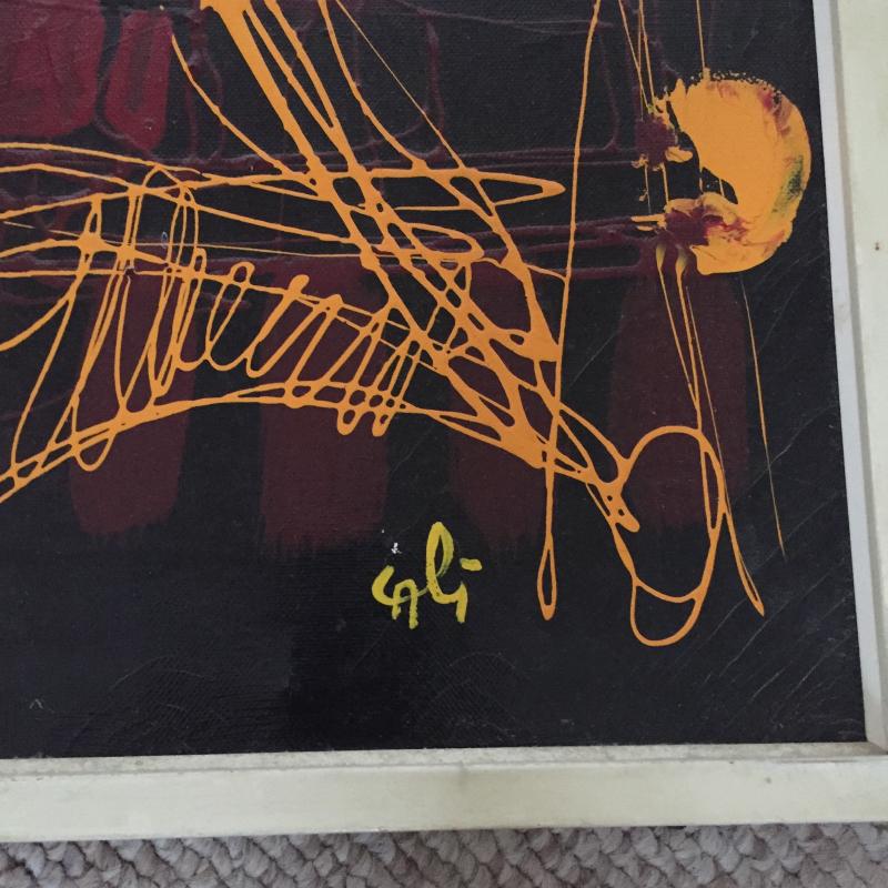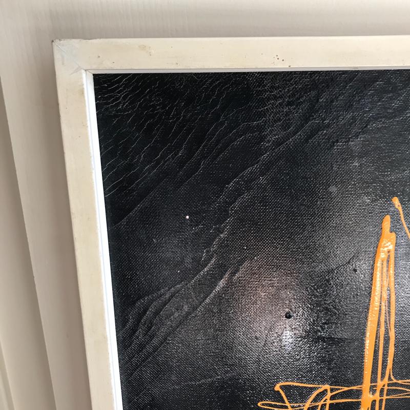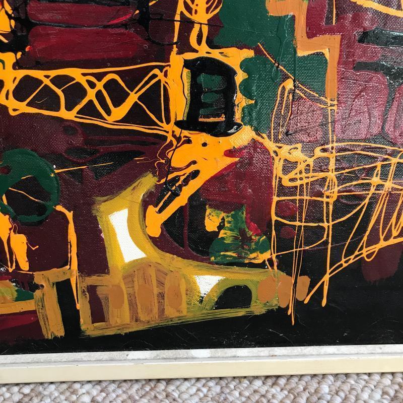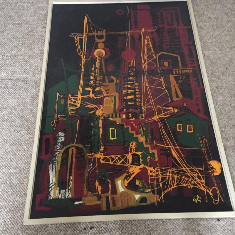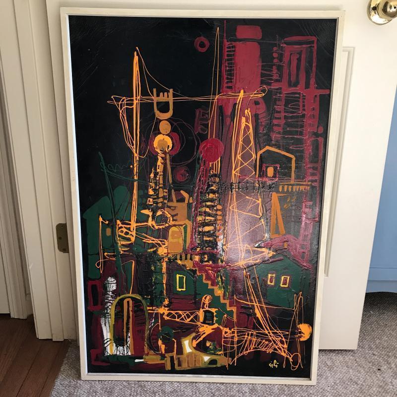 Lovely Painting of a colorful city. Signed and framed canvas. Painting has small hole that is only noticable on back. The whole on the dog on front but can’t notice. Can be repaired if needed. Paint has dried a bit on top edges and shows some crackling. See pictures. Measures 24” x 36” Local Pickup Only