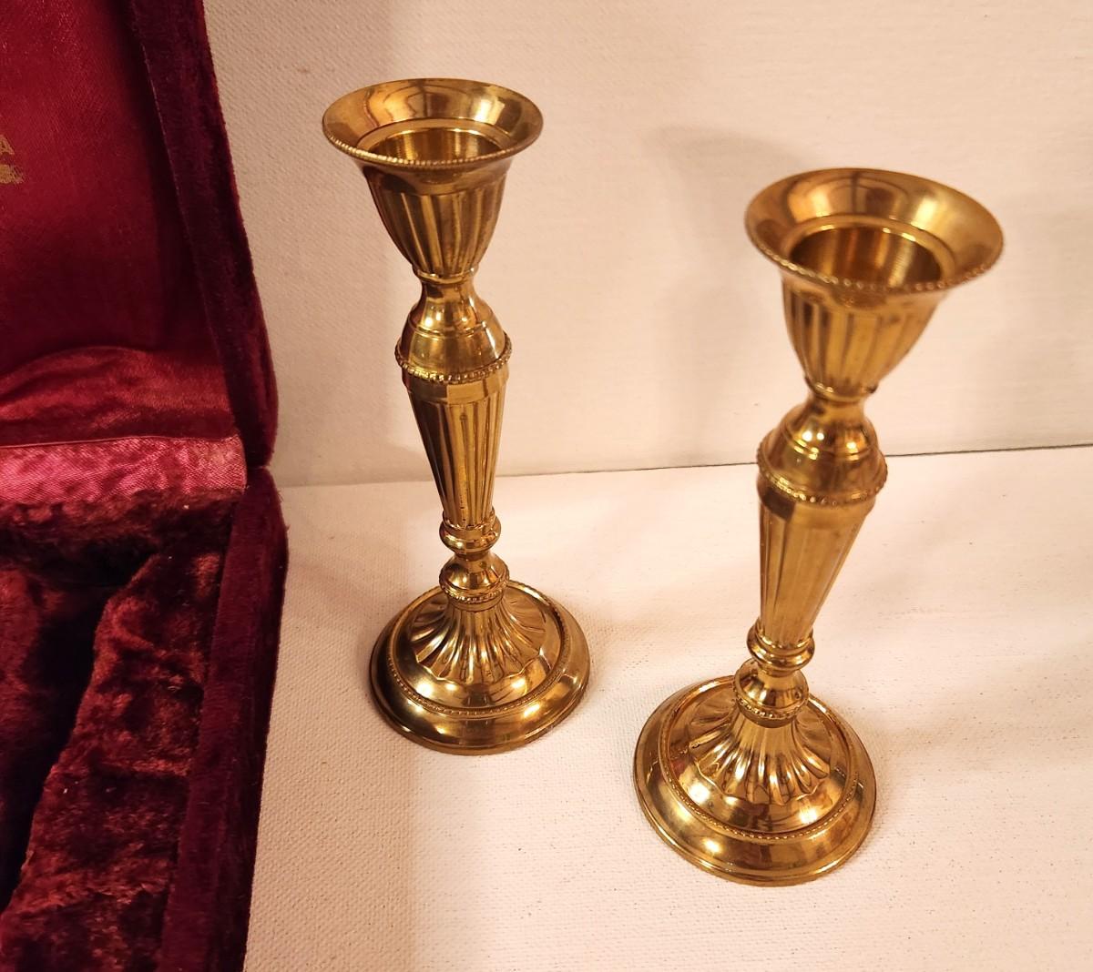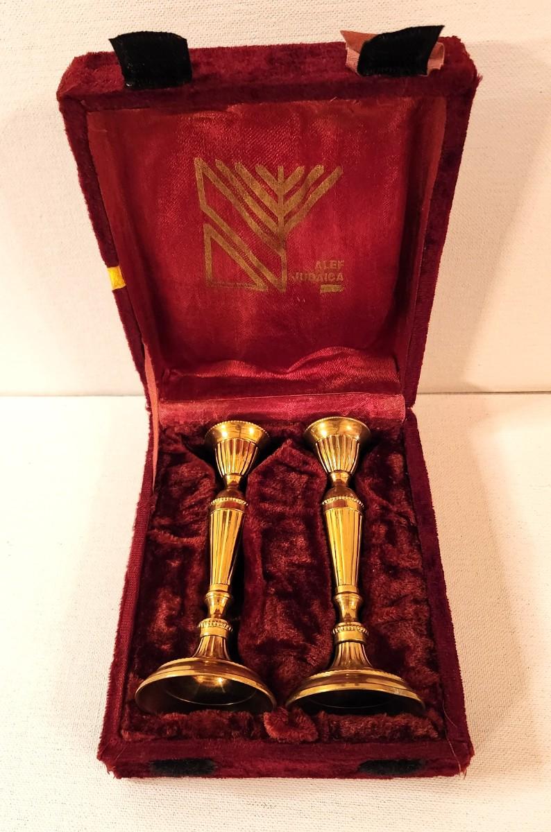 Lot #25 Pair of Brass Shabbat Candles in original case - Judaica
