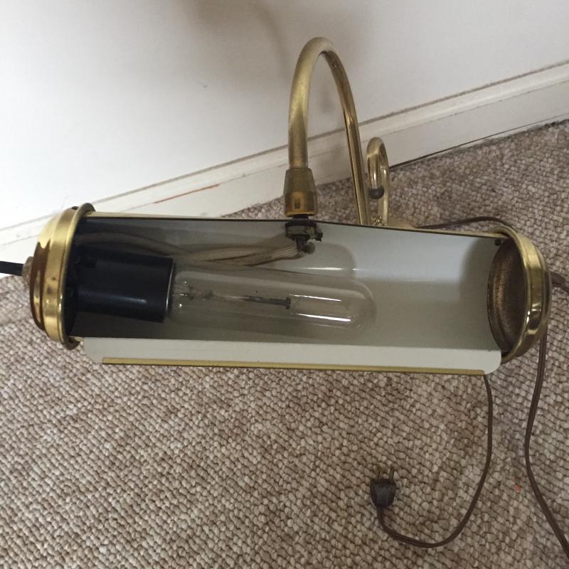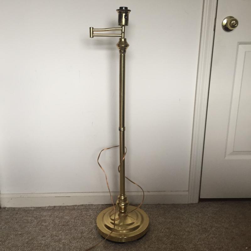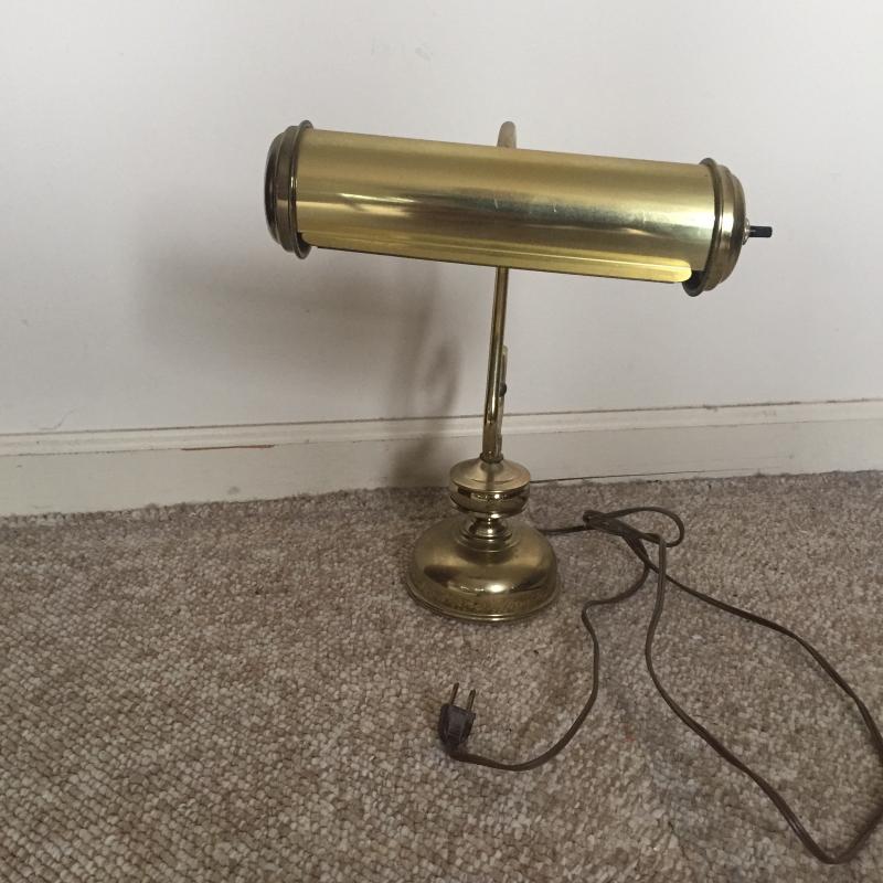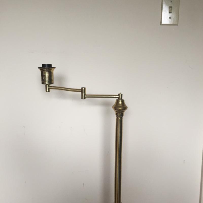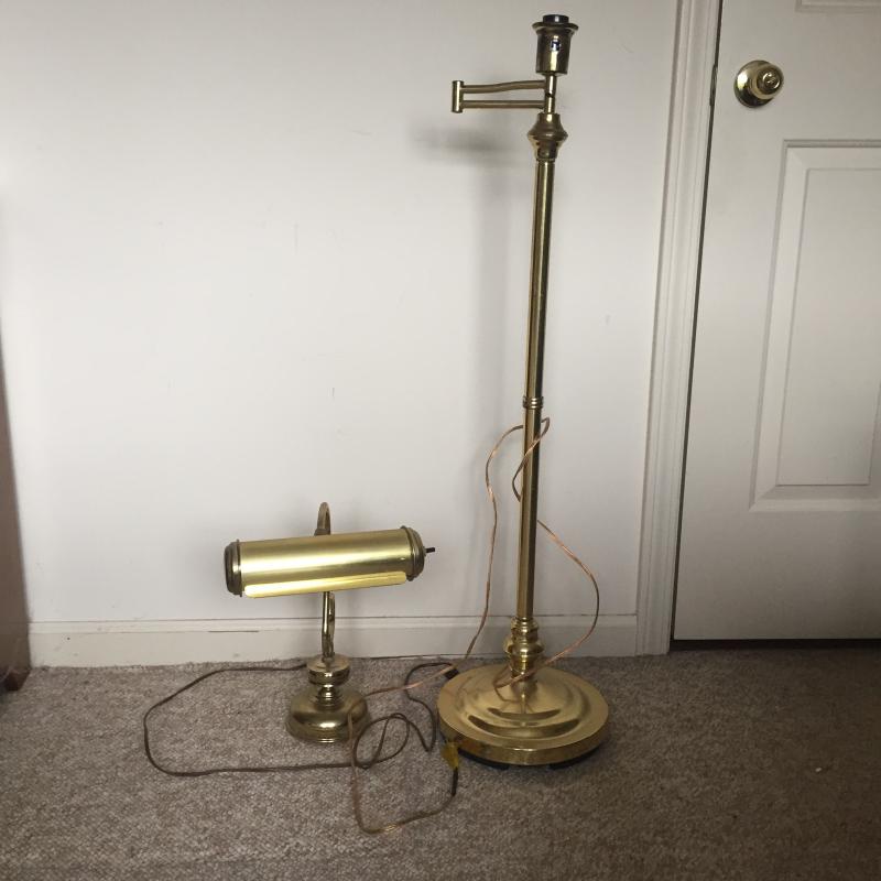 Brass Bankers Lamp works fine and makes a handsome addition to your work space. Floor lamp also works and has adjustable arm. Does not appear to be real brass. It’s missing switch knob and has tape on plug. Floor lamp Measures 39” Tall. Local Pickup Only