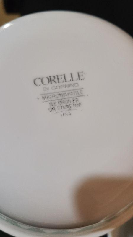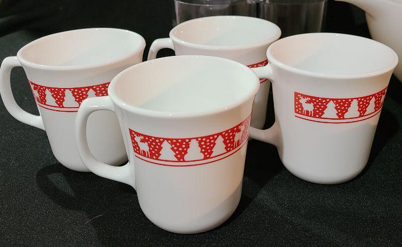 Fun lot of kitchen items: Pyrex 444 4qt, 443 2.5 qt, 441 1.5qt, and 4 Corelle Christmas mugs with 3 matching bowls.