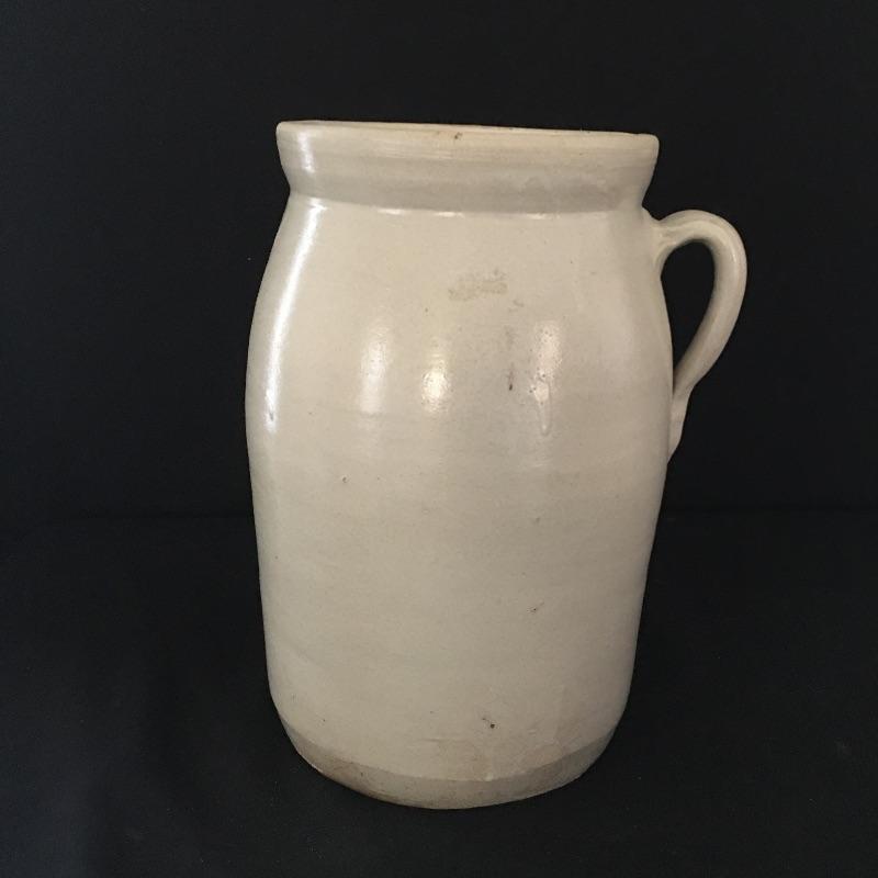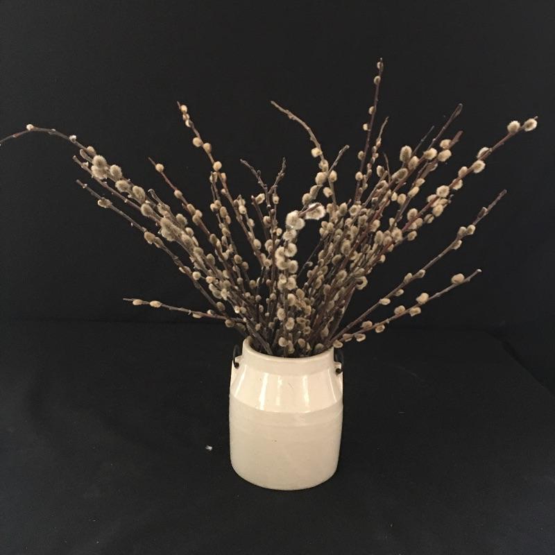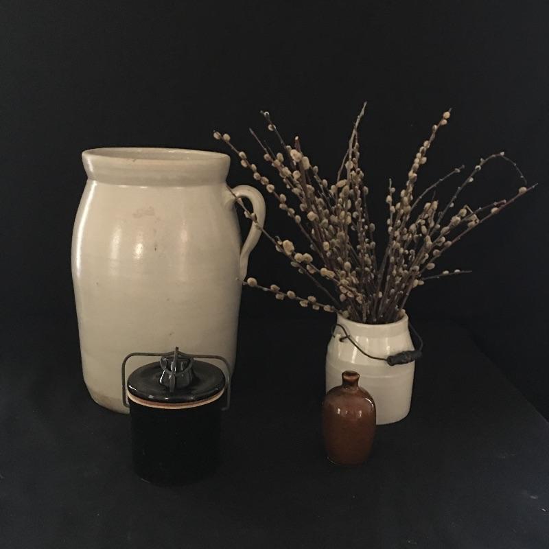 Quartet of crocks. Increase your country decor with this eclectic group. Featuring a crock with lid, crock with handle and pussy willow accents, a small crock with metal handle and small brown jug.