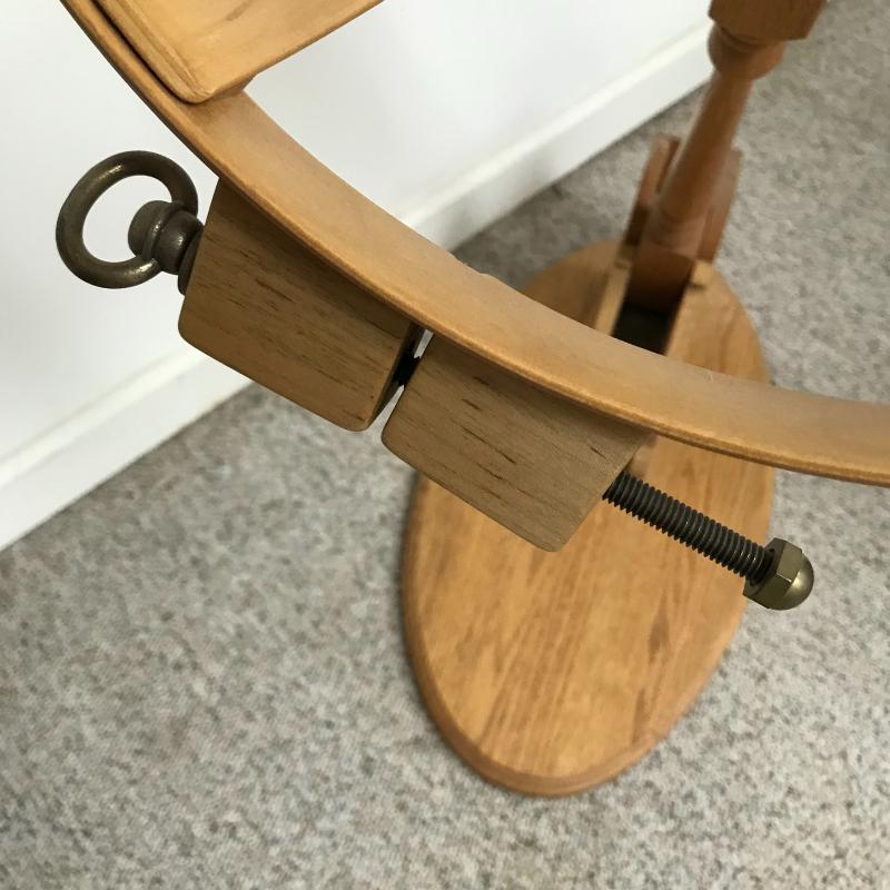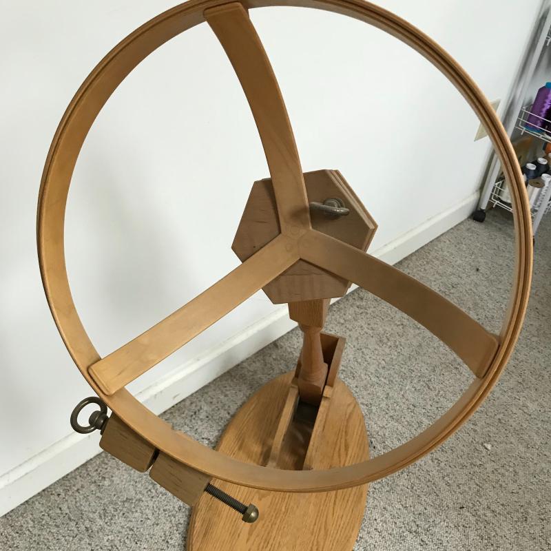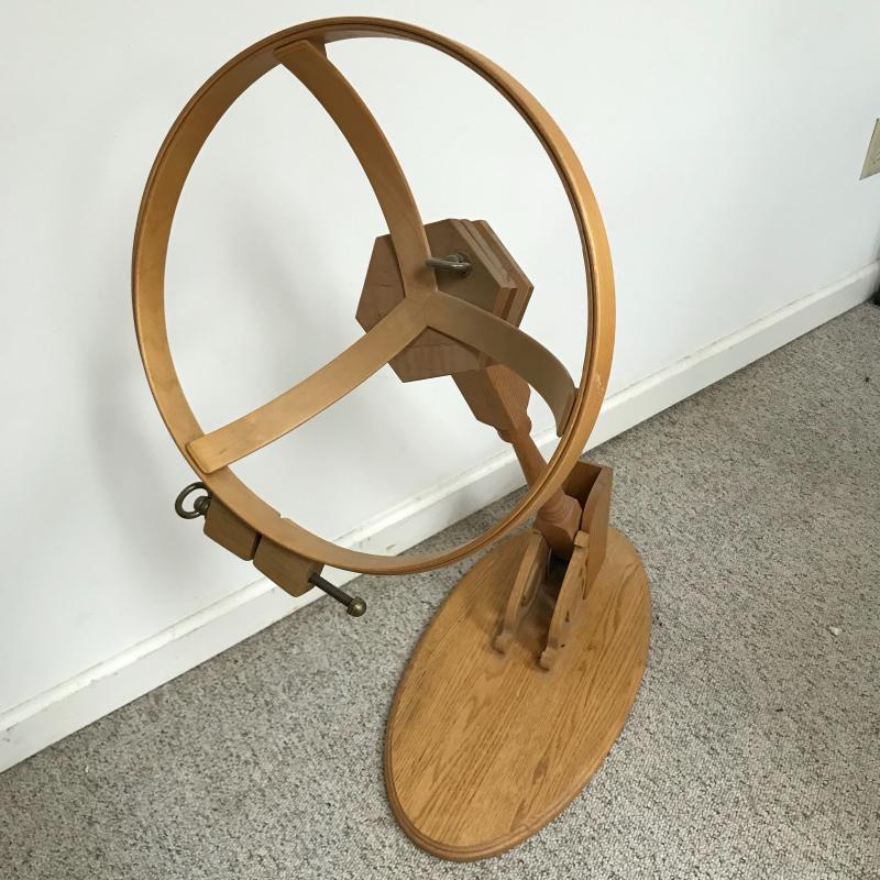 This quilting frame is on an adjustable stand for ease in hand quilting from a chair at various heights. Brand is Jasmine Heirlooms. Adjusts smoothly and easily. Approx. 38” tall. Local pickup only.