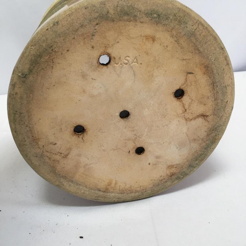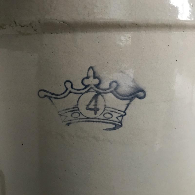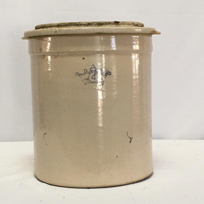 Substantial Blue Crown #4 Robinson Ransbottom Roseville Crock in fantastic shape. This 4 gallon stoneware piece has a lid, but lid has one handle piece broken off and scuff on underside. There is a pain splatter on front side of crock. Crackling throughout piece. There are five holes in the bottom with remnants of potting soil inside. Crock stands approximately 12”d x 14” (15” height with lid). See photos. Shipping available. Piece is large and heavy, please call UPS with dimensions at 828-252-6930 for a shipping quote prior to bidding.