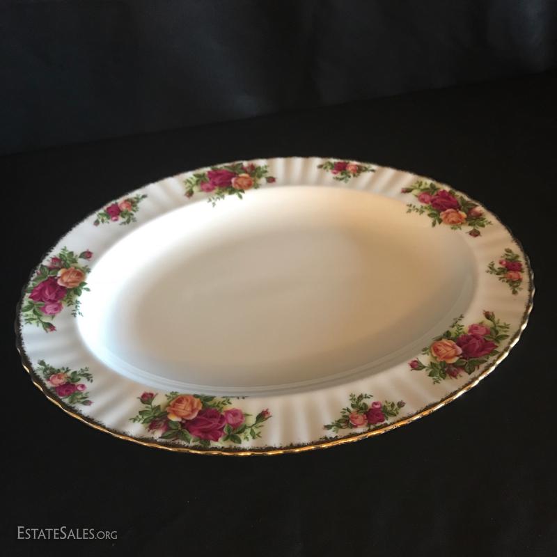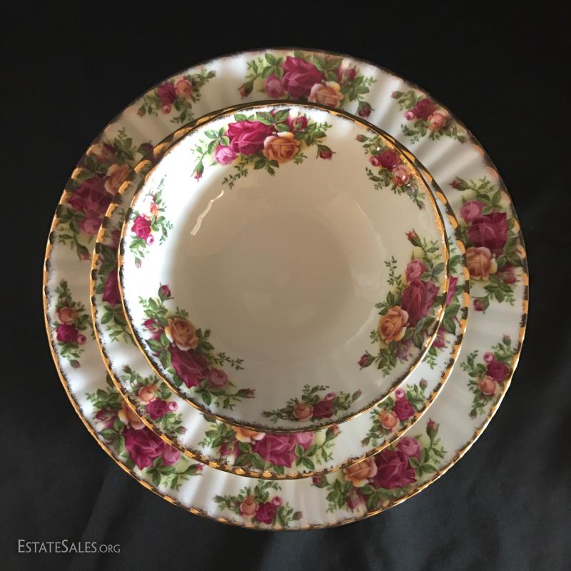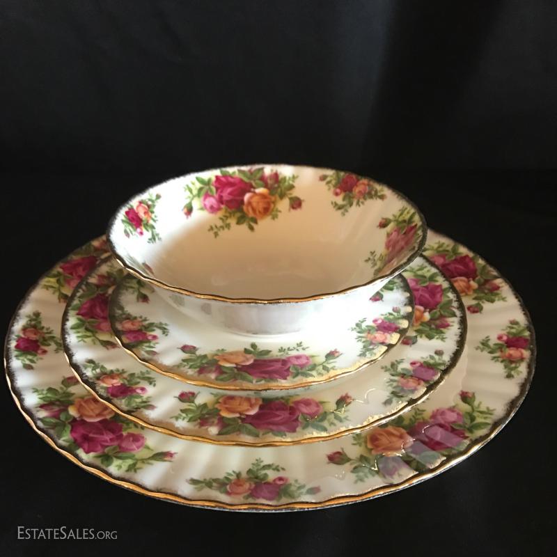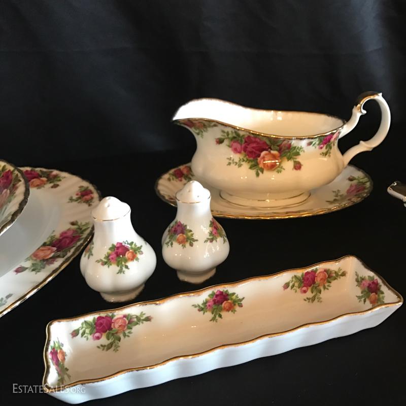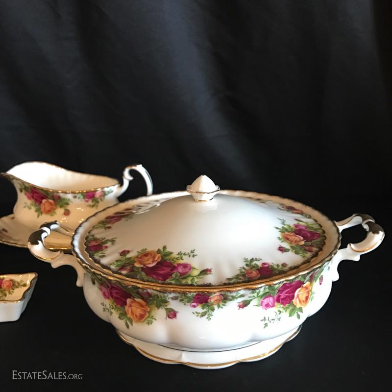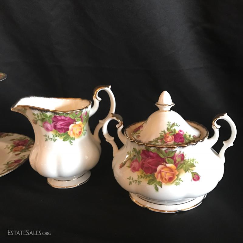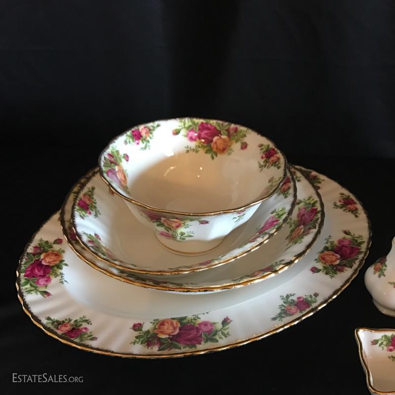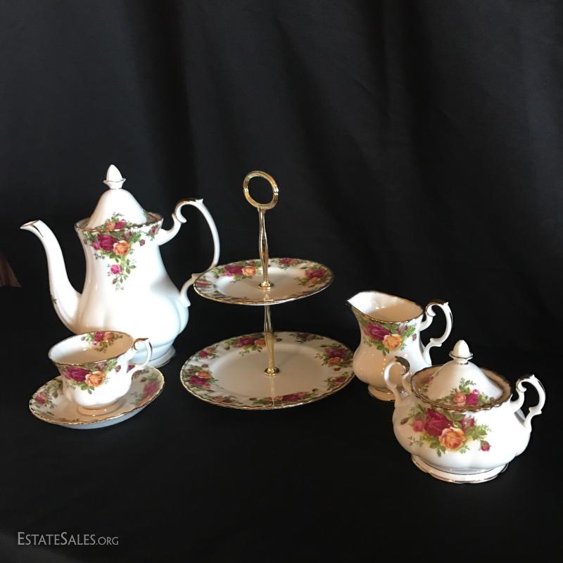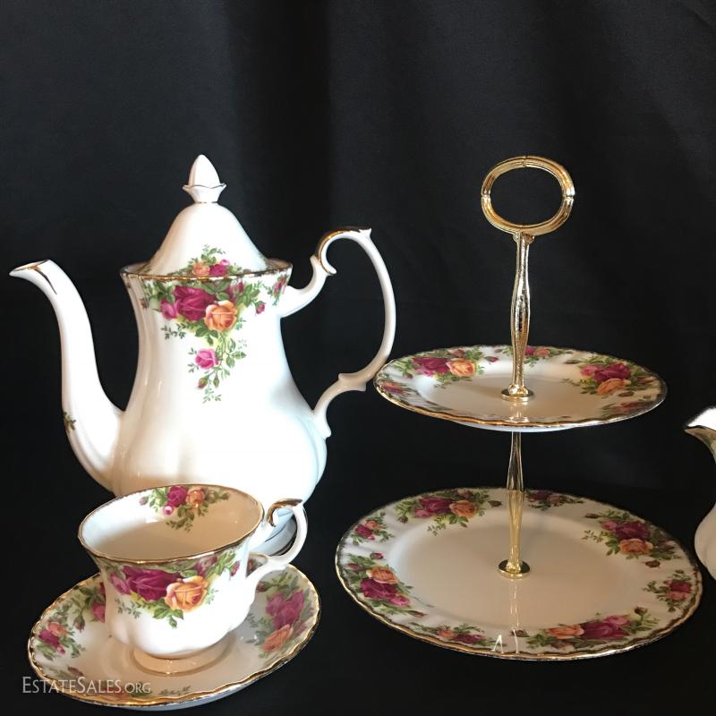 Teapot, 2 tier cake stand, cream and sugar set, gravy boat and saucer, salt and pepper shakers, serving bowl with lid, 12 dinner plates, 8 salad plates, 18 desert plates, 12 cereal/soup bowls, 12 tea cups, 12 saucers, 1 mint tray, 5 misc. serving bowls and platters. Item available for local pick up in Columbus, NC or shipping. Tallest piece is 10.5" tall