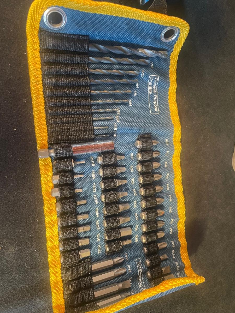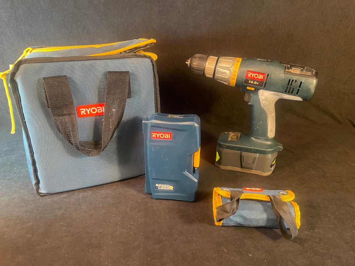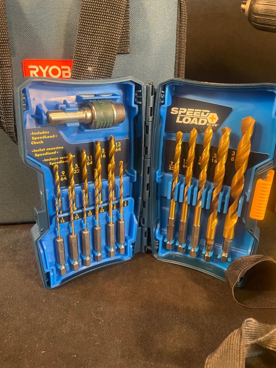 Ryobi 18v cordless drill comes with battery, carrying case, complete speed-load bit set in case and set of screwing bits and general purpose bits in case