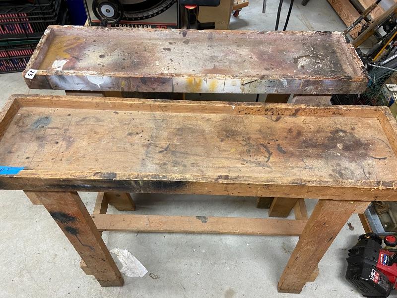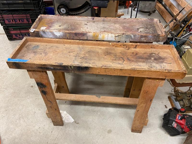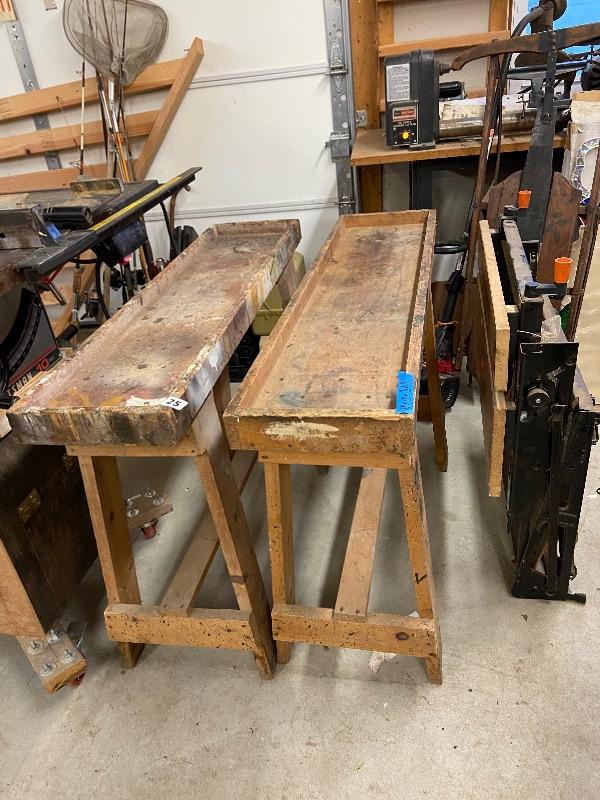 Two handcrafted, wooden saw horses and a Black and Decker Workmate 400.
