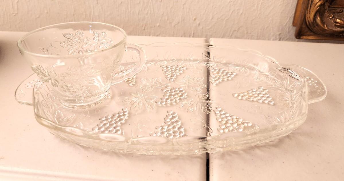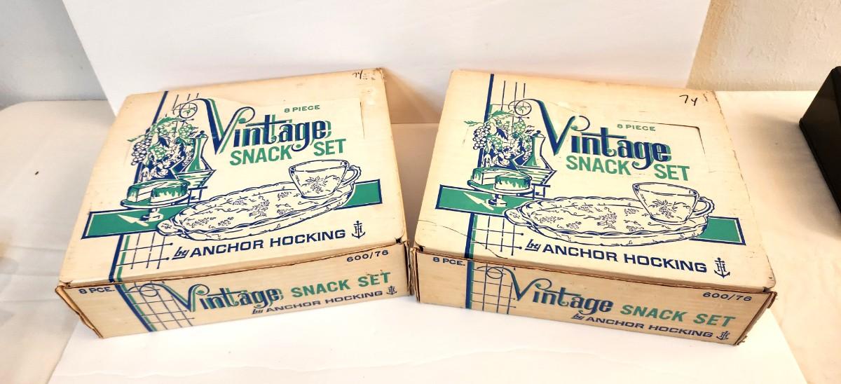 Not one, but two Vintage Anchor Hocking snack sets in original boxes - complete. Only gently used. Service for 8. each is 11" long, 6.75" across, cups are 2" tall. Good condition. You never see the box - never!