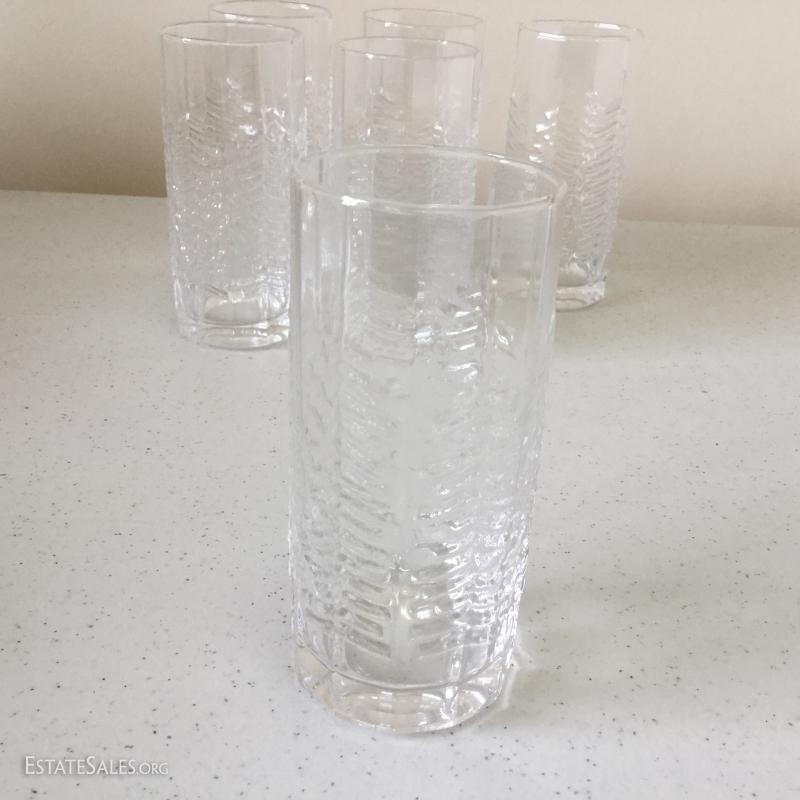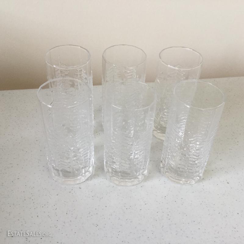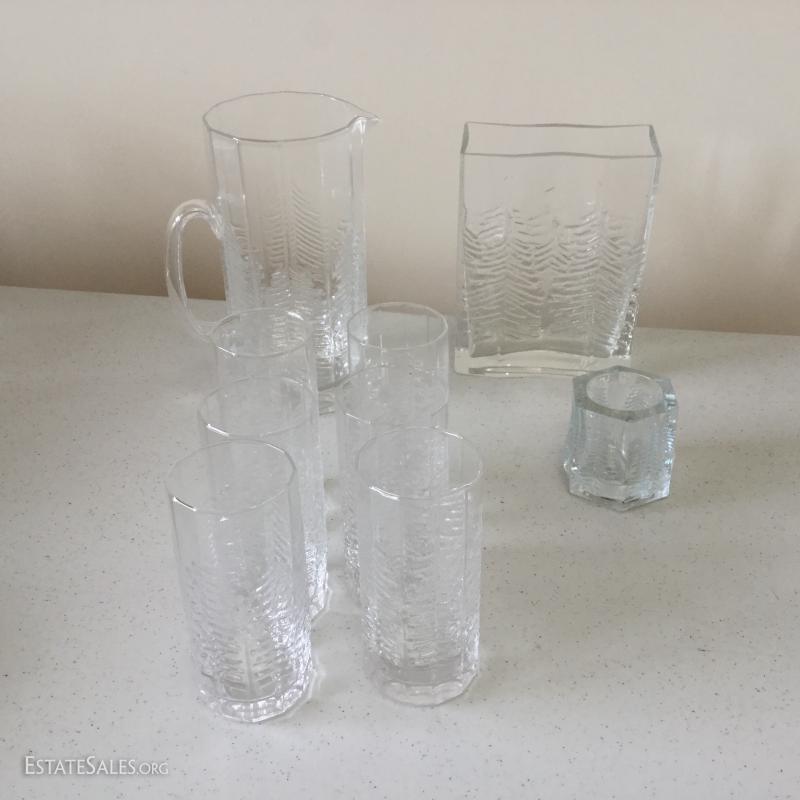 Set of drinking glasses with pitcher. Also includes matching vase and candle holder. Candle holder marked Beacon Hill, Inc.