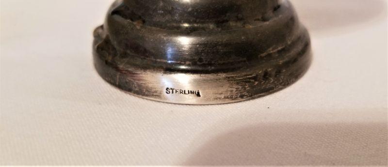 Vintage set of 6 - one base is missing the screw-in liner. Marked Sterling. With liner, each is 4.5" tall. These are NOT weighted. None of the liners have chips. I would estimate there is at least 2 ounces of silver here. Obviously they could use a polish.