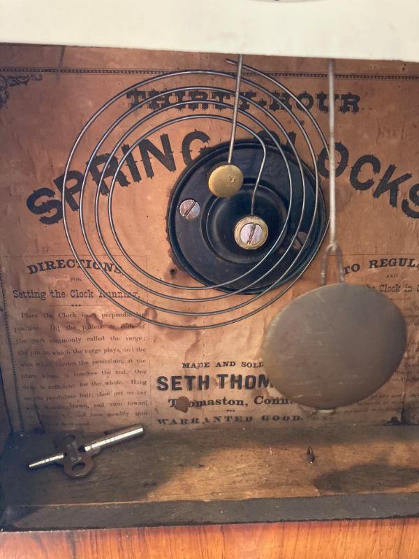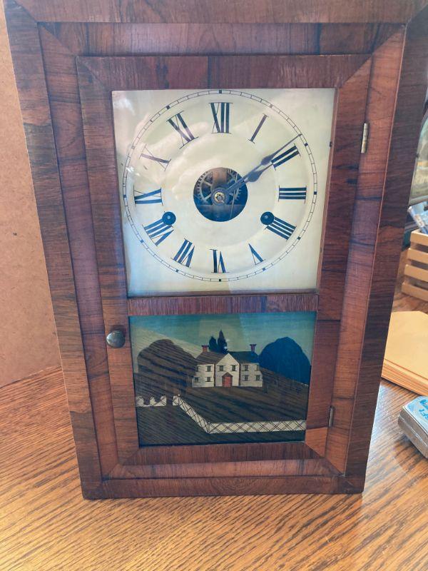 16" tall. 30 hour movement. Orig tablet. w/ key & pend. Runs.