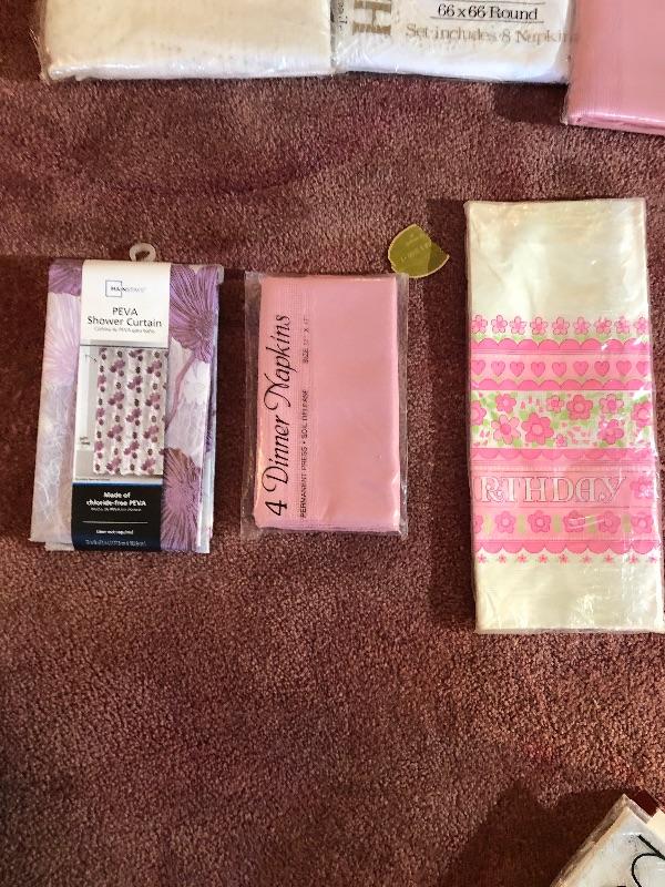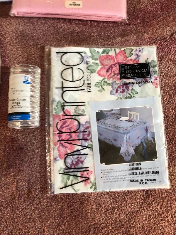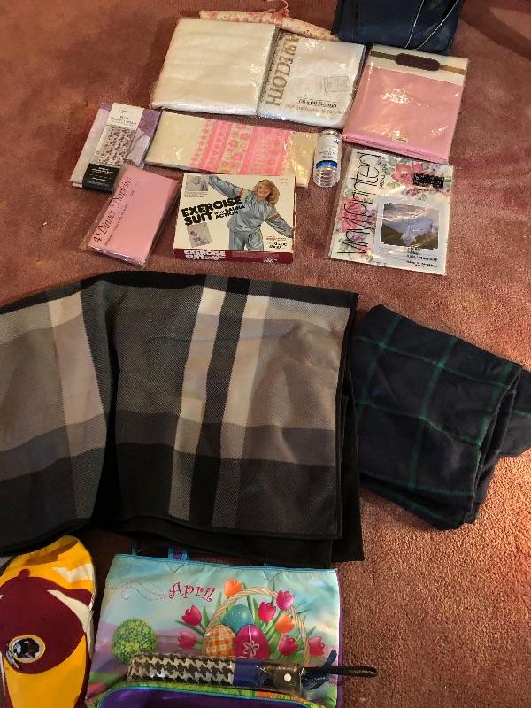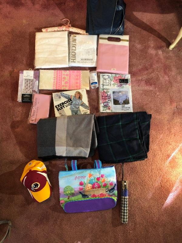 Lot 25 - Table Clothes, Blanket, Exercise Suit, Red Skins Hat, Tote, Dust Cover, Shower Curtains, etc!