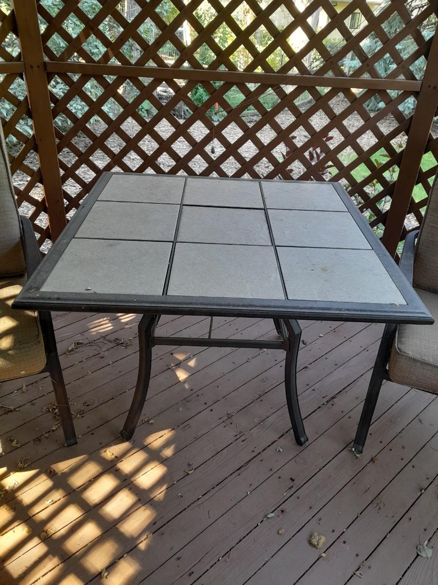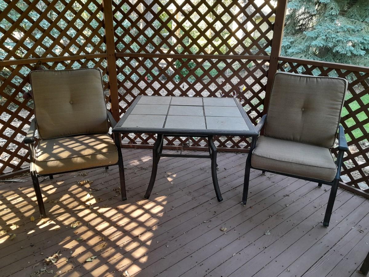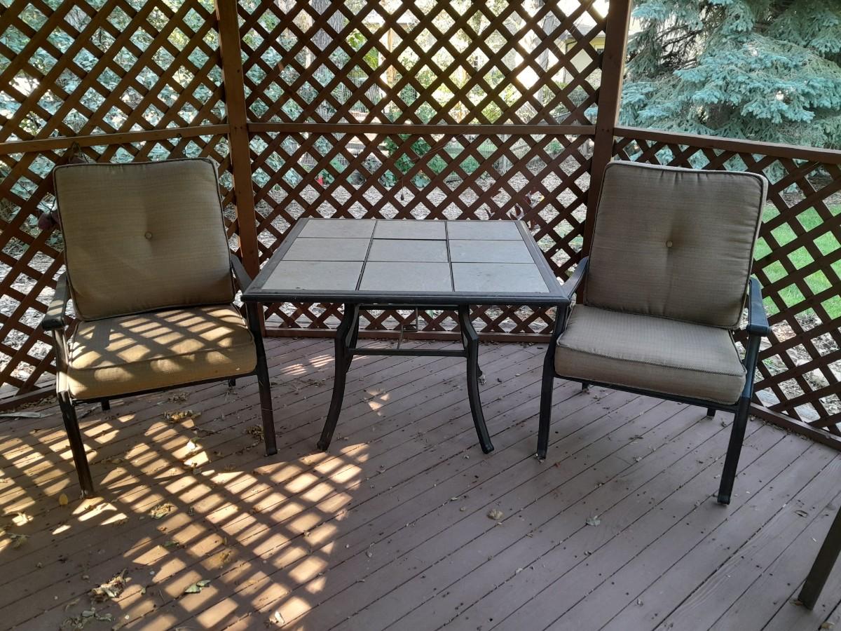 TWO CUSHIONED PATIO CHAIRS AND TILE TOPPED PATIO TABLE 27.5" X 40" X 40"