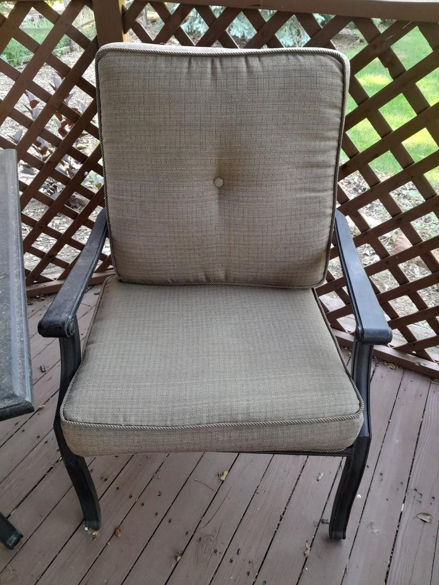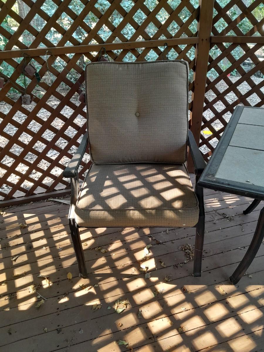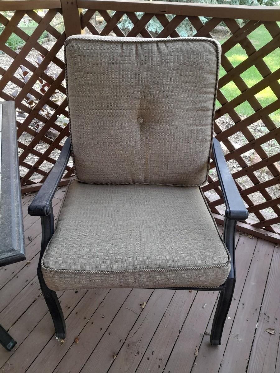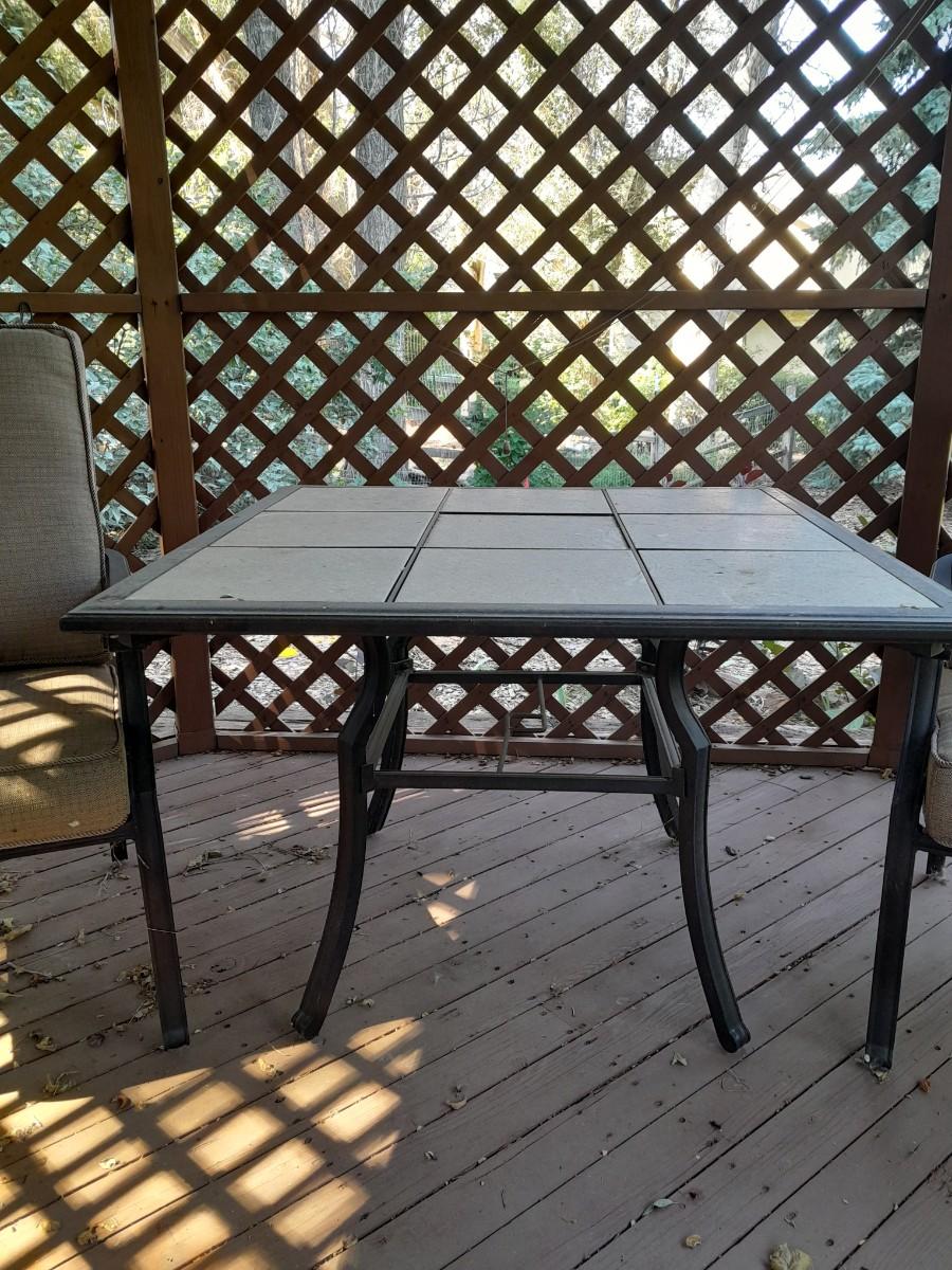 TWO CUSHIONED PATIO CHAIRS AND TILE TOPPED PATIO TABLE 27.5" X 40" X 40"