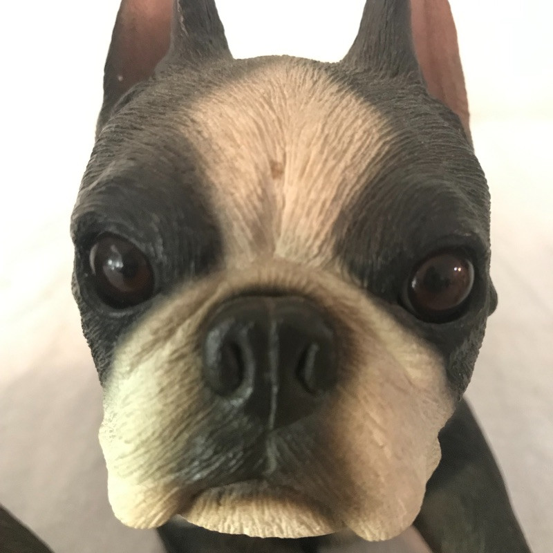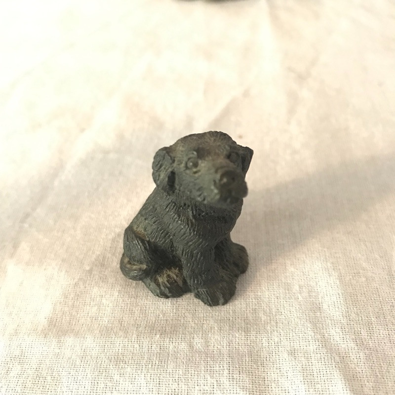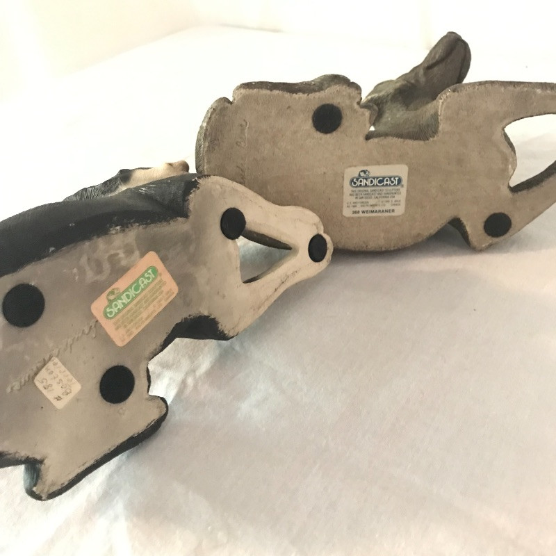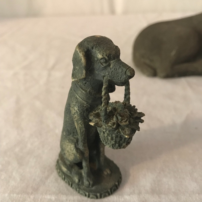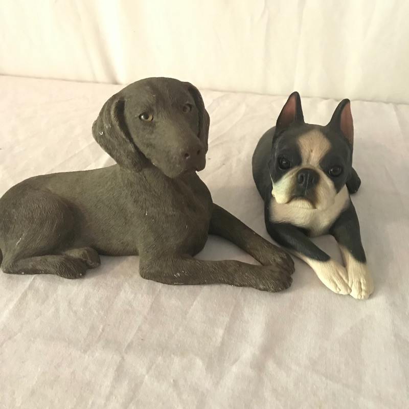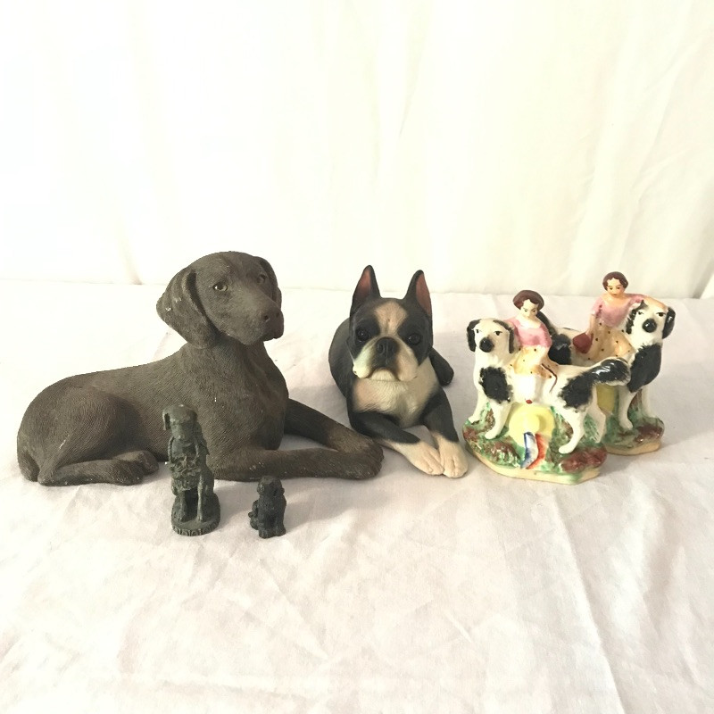 Calling all dog lovers! Two Sandicast lifelike Sandra Brue creations, with glass eyes and stamped Sandicast Boston Terrier 1985 is approximately 9.5” x 5.25” and a 1990 Weimaraner that measures approximately 10.5” x 6.5”. These pieces are remarkably lifelike and full of character. Also included here is a pair of 5.5” Old Staffordshire Ware rare figurines in great condition. A T Wyatt Ltd. Boston pooch with a flower basket and an unmarked 1.75” pup complete the collection. Shipping available.