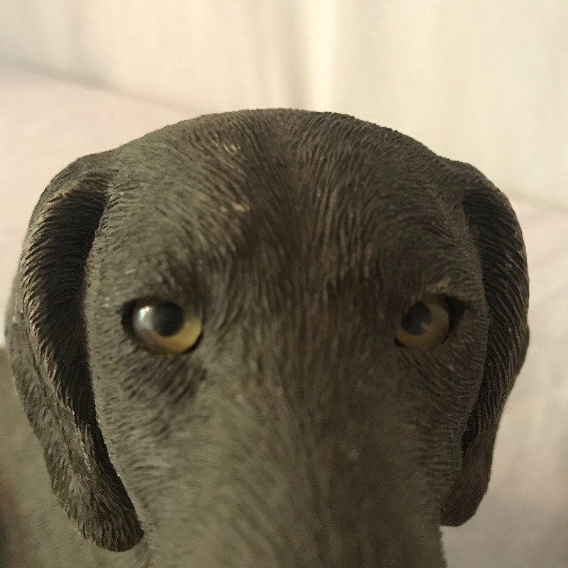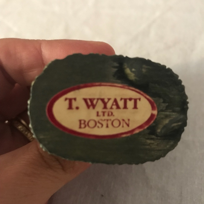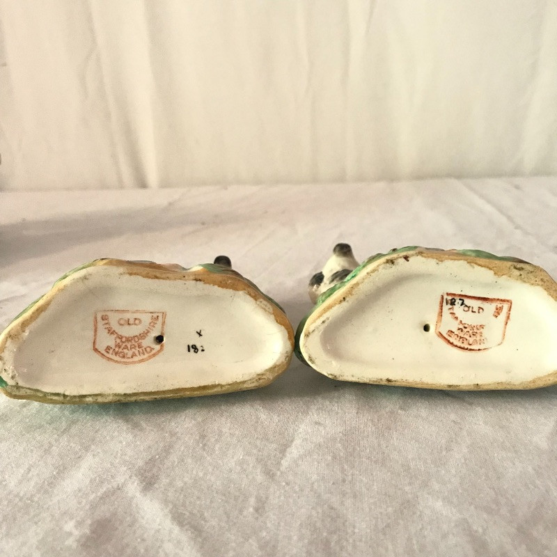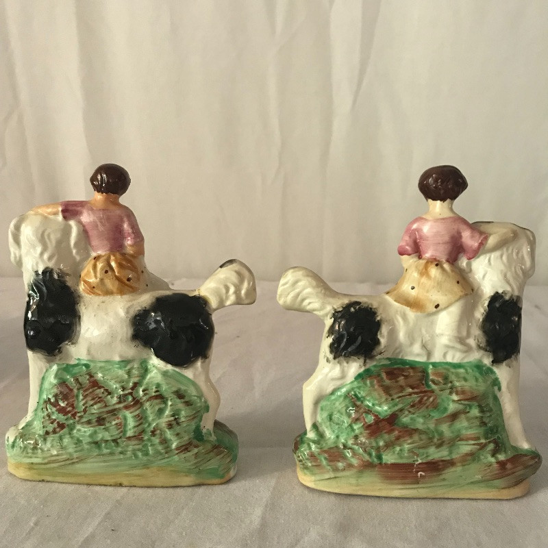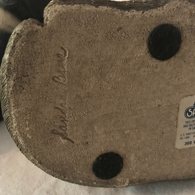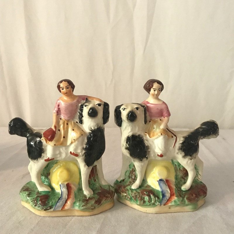 Calling all dog lovers! Two Sandicast lifelike Sandra Brue creations, with glass eyes and stamped Sandicast Boston Terrier 1985 is approximately 9.5” x 5.25” and a 1990 Weimaraner that measures approximately 10.5” x 6.5”. These pieces are remarkably lifelike and full of character. Also included here is a pair of 5.5” Old Staffordshire Ware rare figurines in great condition. A T Wyatt Ltd. Boston pooch with a flower basket and an unmarked 1.75” pup complete the collection. Shipping available.