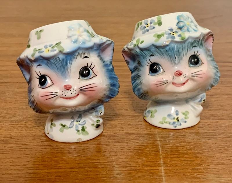 2 sets of Enesco anthropomorphic Cat /Kitten Salt and Pepper shakers. One blue set and one yellow set. Stoppers present (yellow has one stopper that fell inside). One yellow shake has chip at bottom, Typical wear. Measure 3 - 3 1/4" tall.