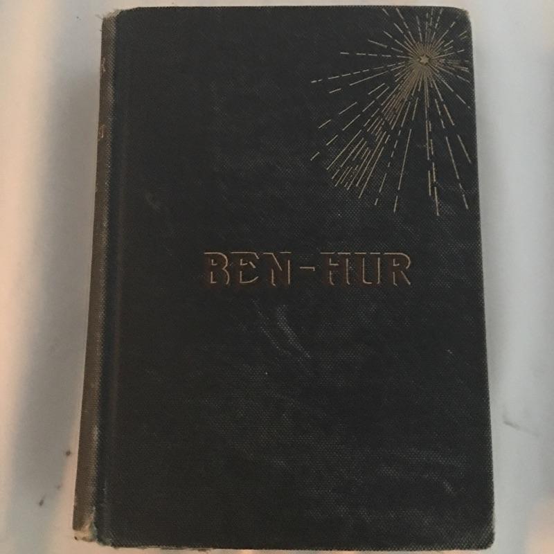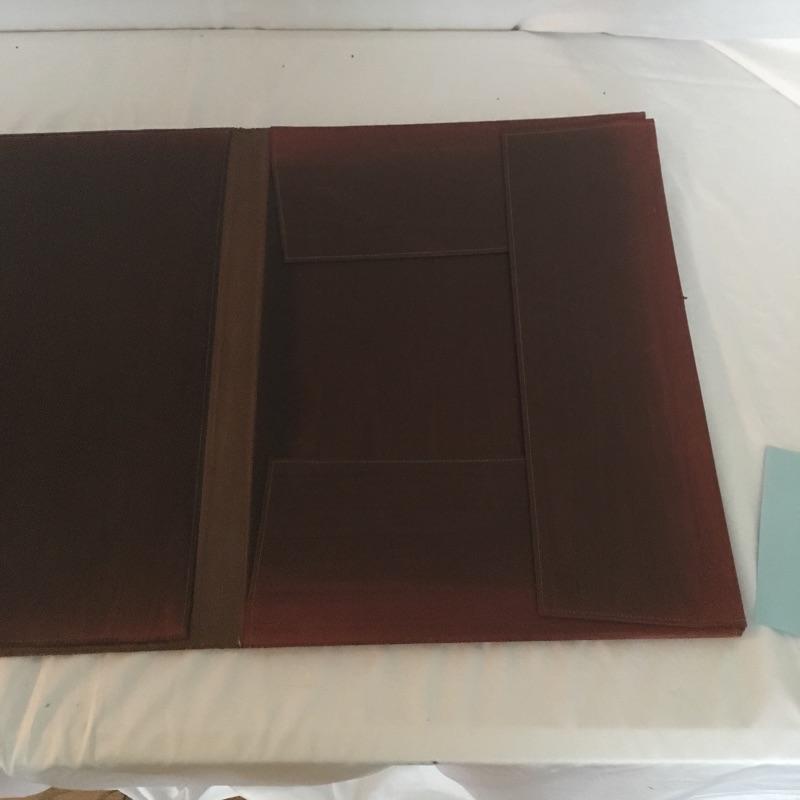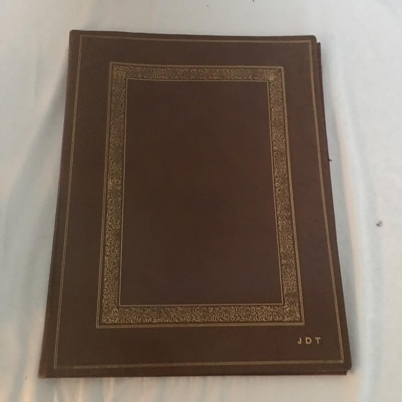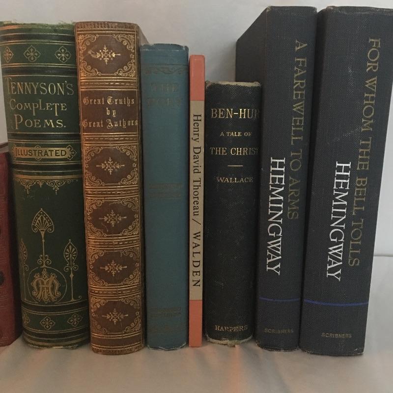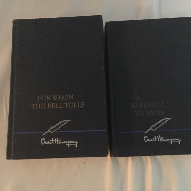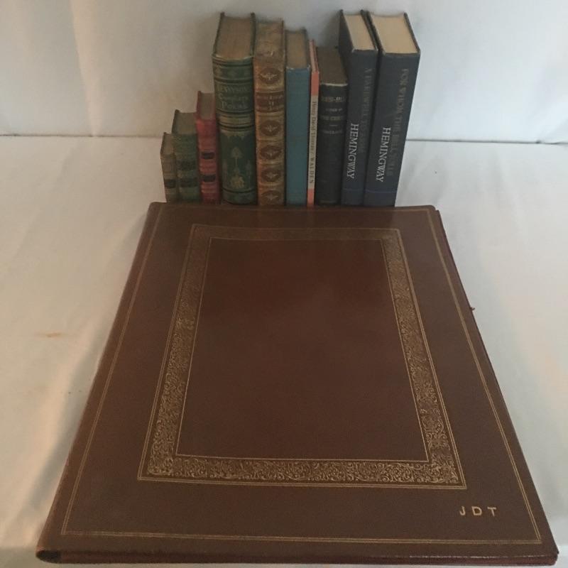 Assortment of vintage books including For Whom the Bell Tolls, Farewell to Arms, Ben Hur and more also includes large portfolio and one bookend. Portfolio measures 15” x 19”.