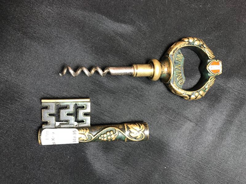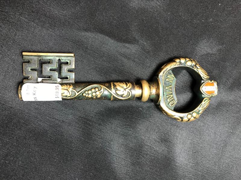 Very heavey bronze bottle opener in the shape of a skeleton key. Overall grape design. Bottle opener end has enameled Kaiserslauterin sheild crest, and also says "In Vino Veritas". Pulls apart to reveal corkscrew. 5 1/2" H
