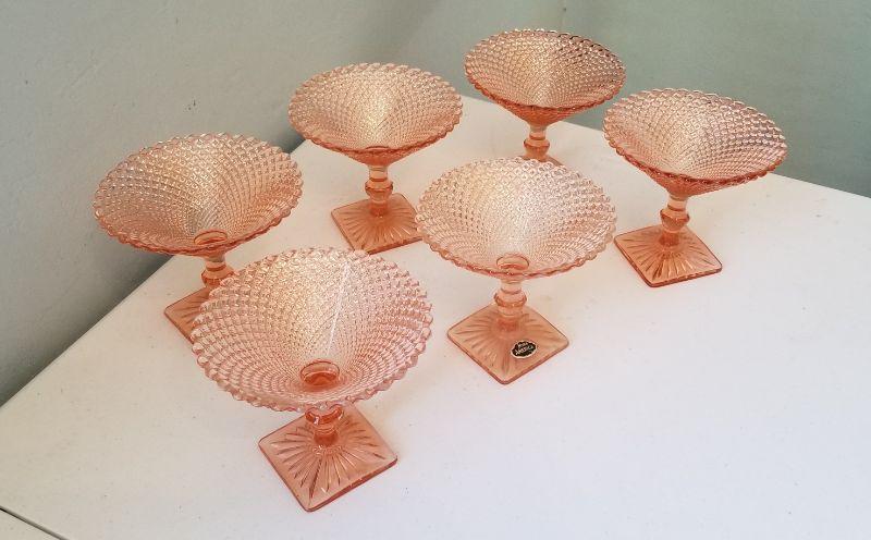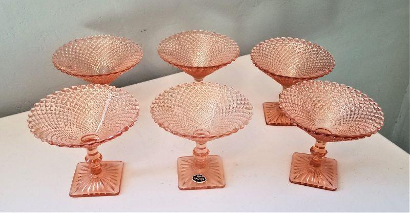 Set of 6 depression glass compotes in the pink Miss America pattern. One still have the foil label. Very good condition. Each stands 5" tall.