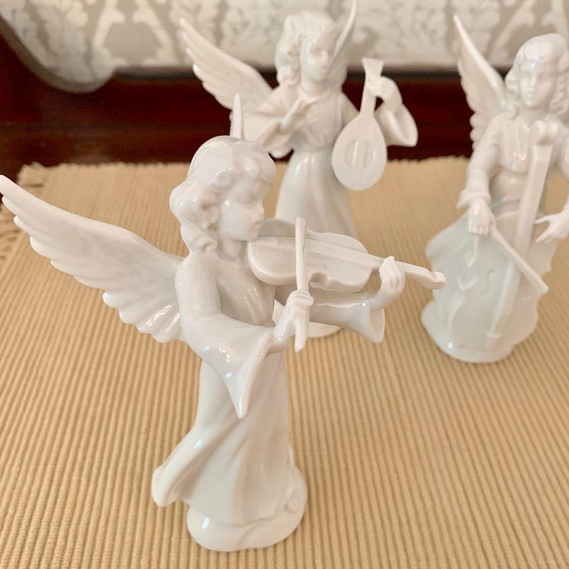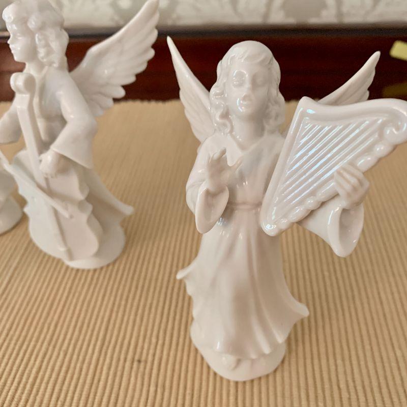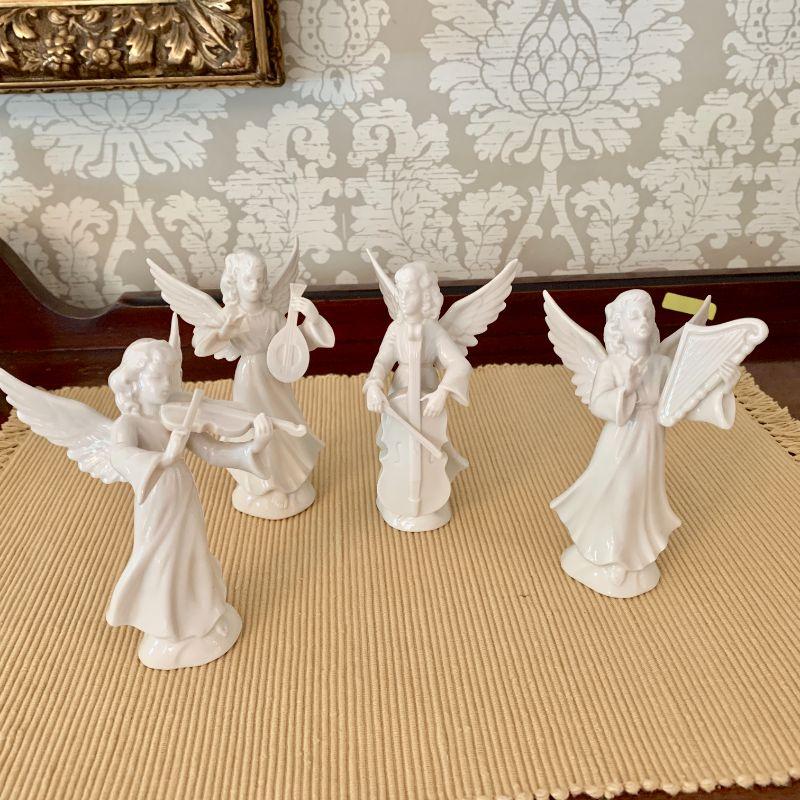 Set of 4 Dresden Angel Figurines Playing Instruments, Violin, Mandolin, Harp Cello. 5.5" tall