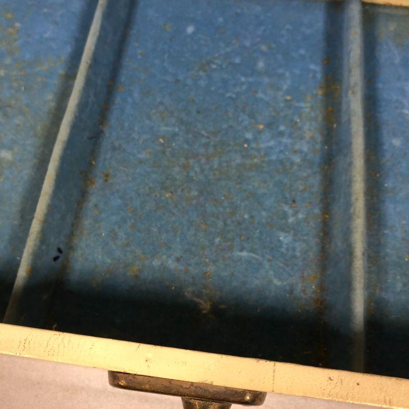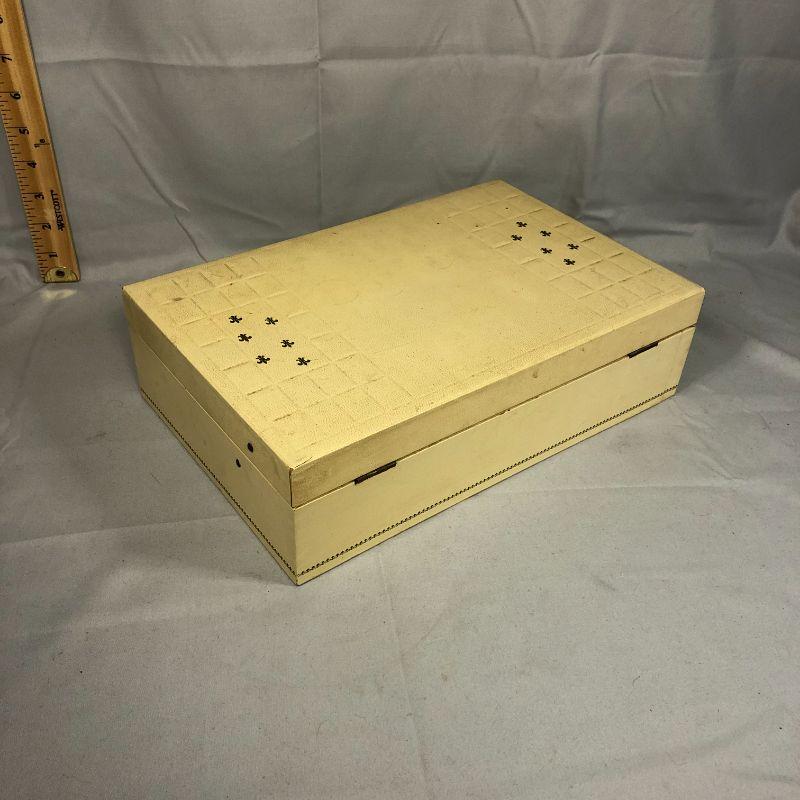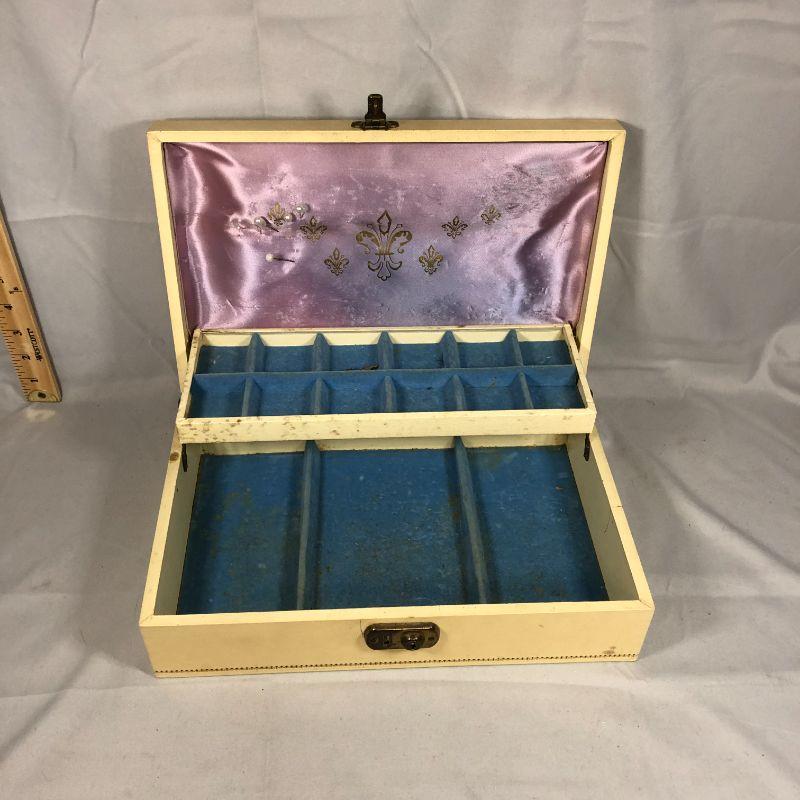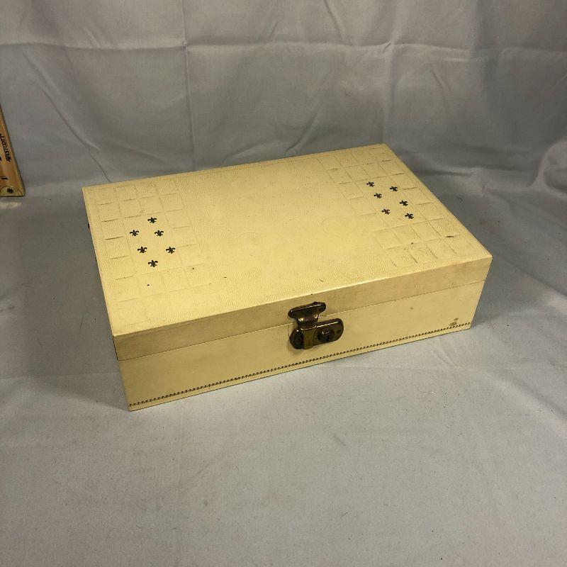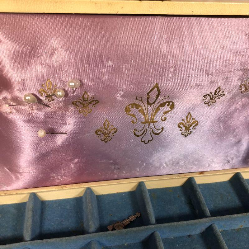 There is a key that is in this box, but I wasn't able to get it to work so I don't know if I'm having issues or the key isn't the correct one. It is 3.5" tall and 12.5" wide by about 8" deep. The exterior is in very good condition, but the inside has spotting on the velvety bottom and the top piece of satin has a lot of holes from where treasures were pinned.