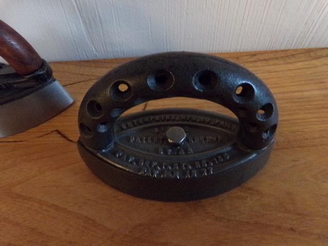 VINTAGE ENTERPRISE MFG. STAR SAD IRON WITH PERFORATED COLD HANDLE. ANTIQUE ASBESTOS SAD IRON WITH HANDLE.