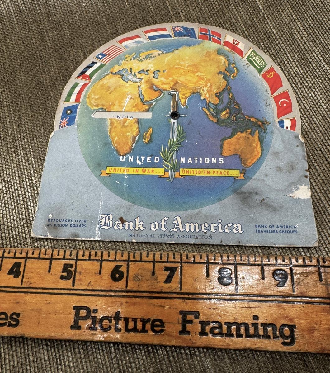 LOT 25 - Vintage Moveable Bank of America United Nations "United in War - United in Peace". It has stains and wear. It's a little darker than in the photo. Some creases as well. Very cool piece overall. Measurements are in the photos.