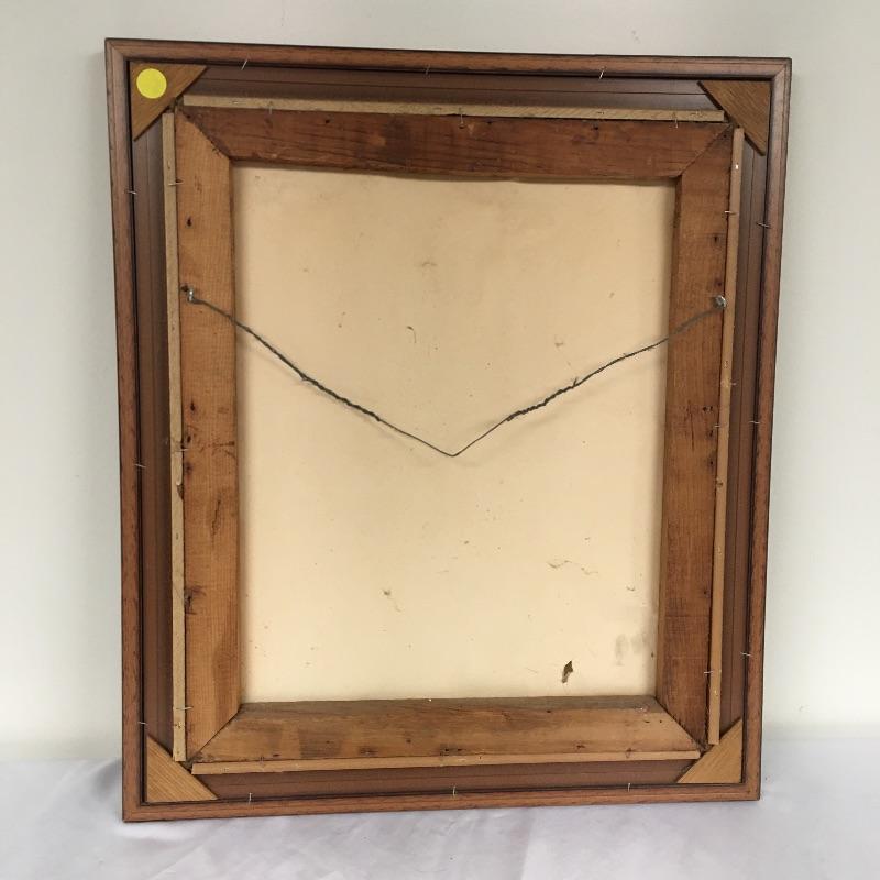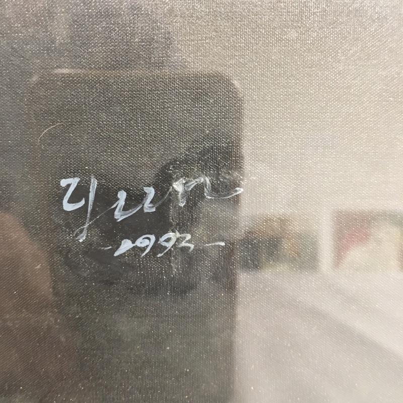 A wooden framed and signed piece of art by Yun Chan Kyung. Comes with artist's business card.