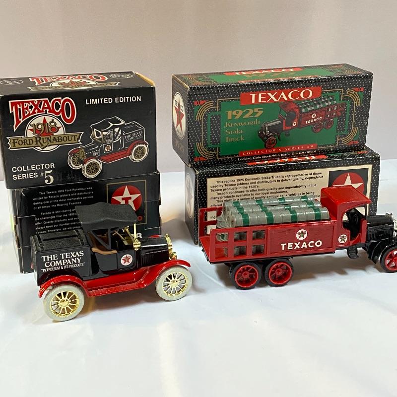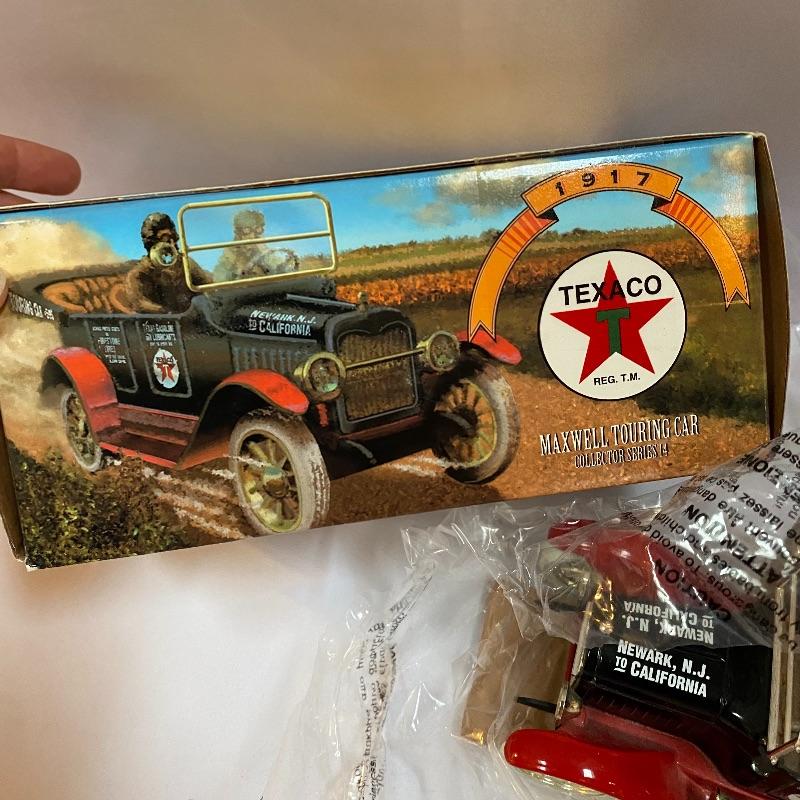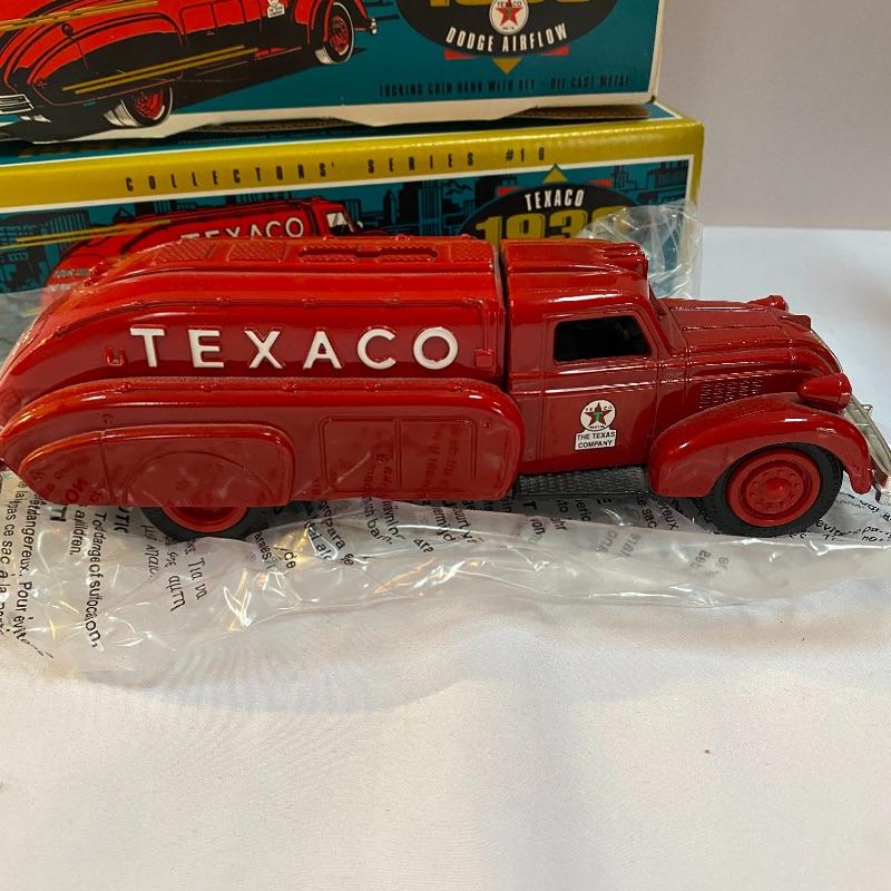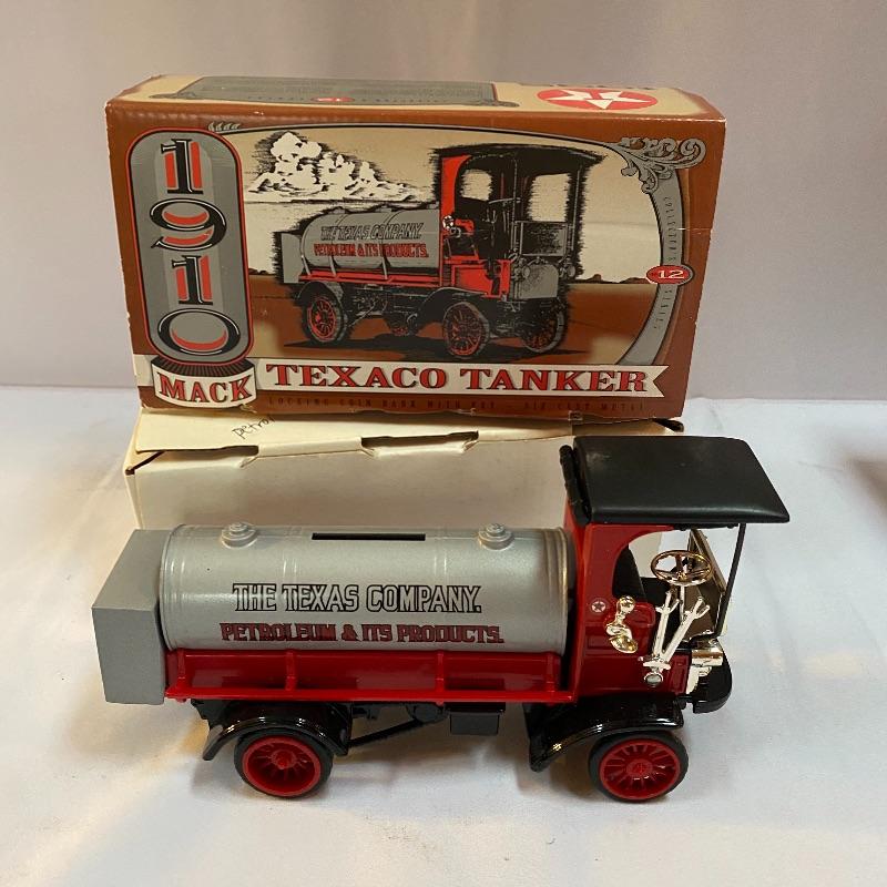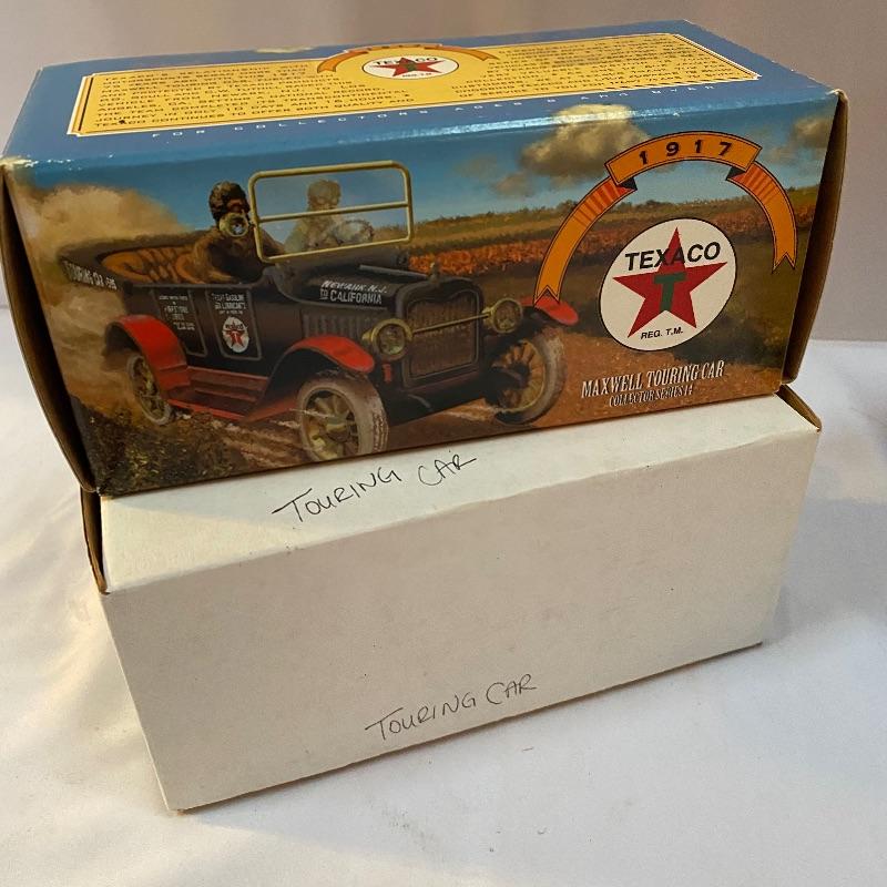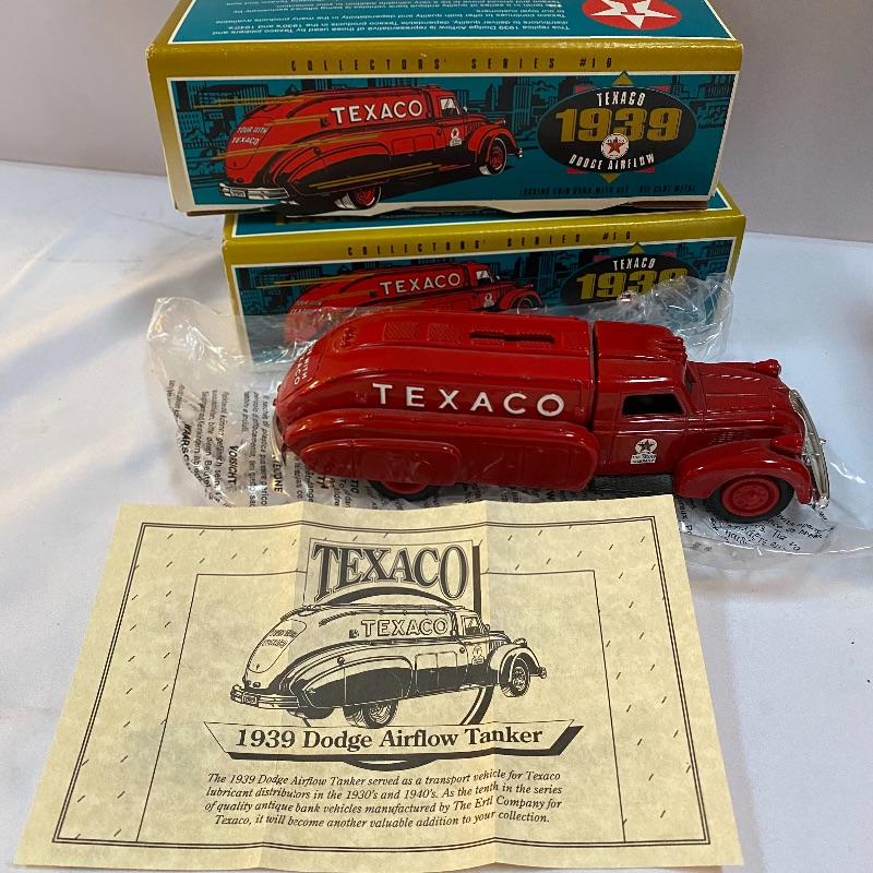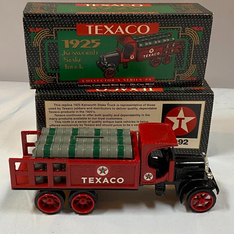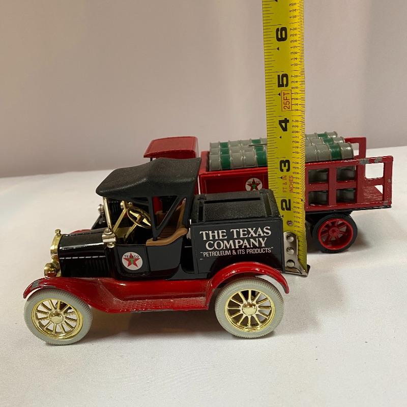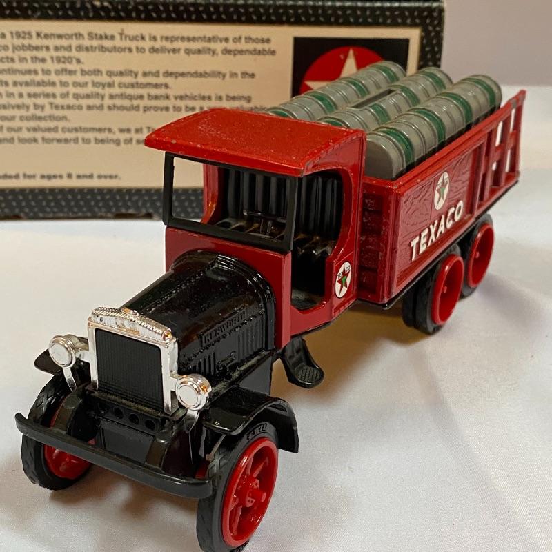 Most of these fun collectible banks have their original packaging. Seventeen total Texaco banks in a variety of styles. They include three 1918 Ford Runabout (two in original box, one without box“”it has a little paint missing from bumper), three 1925 Kenworth Stake Trucks (two in original boxes, one without box), two 1917 Maxwell Touring Cars (two boxes -one of which is original), two 1910 Mack Texaco Tankers (two boxes-one of which is original), two 1939 Dodge Airflows (both in original boxes), two 1925 Mack Bulldog Lubricant Trucks (both original boxes) and three 1934 Diamond Tankers(all original boxes). The vehicles are mostly metal however do have plastic intermixed on most of the vehicles. See photo of measuring tape for size reference. Shipping available.