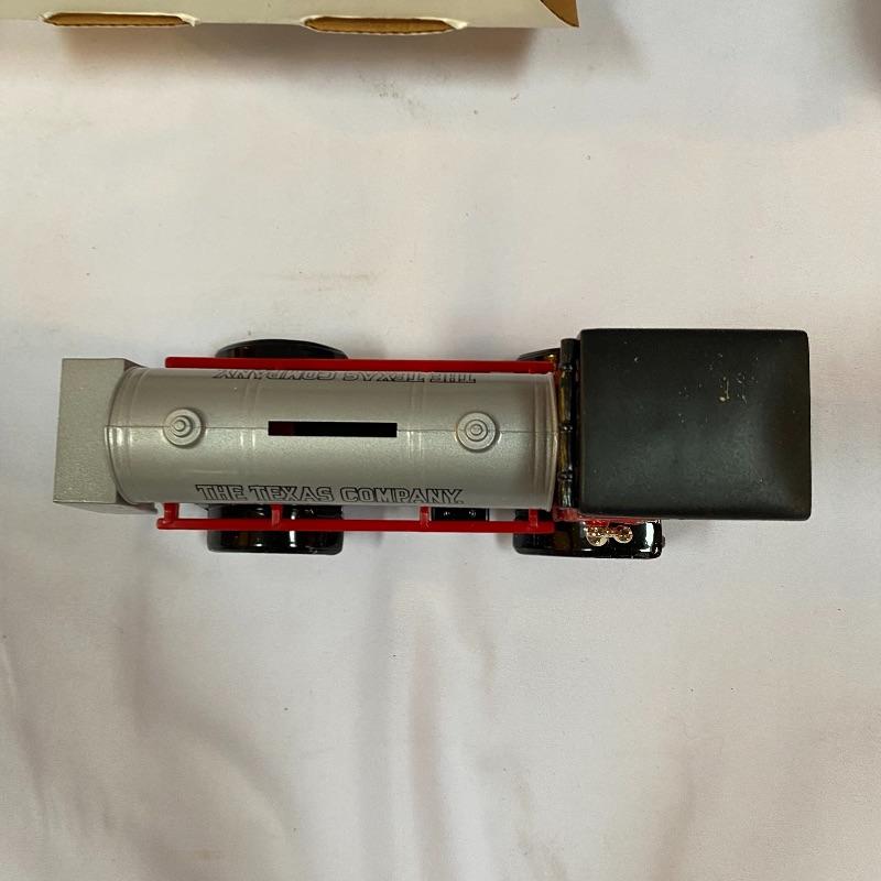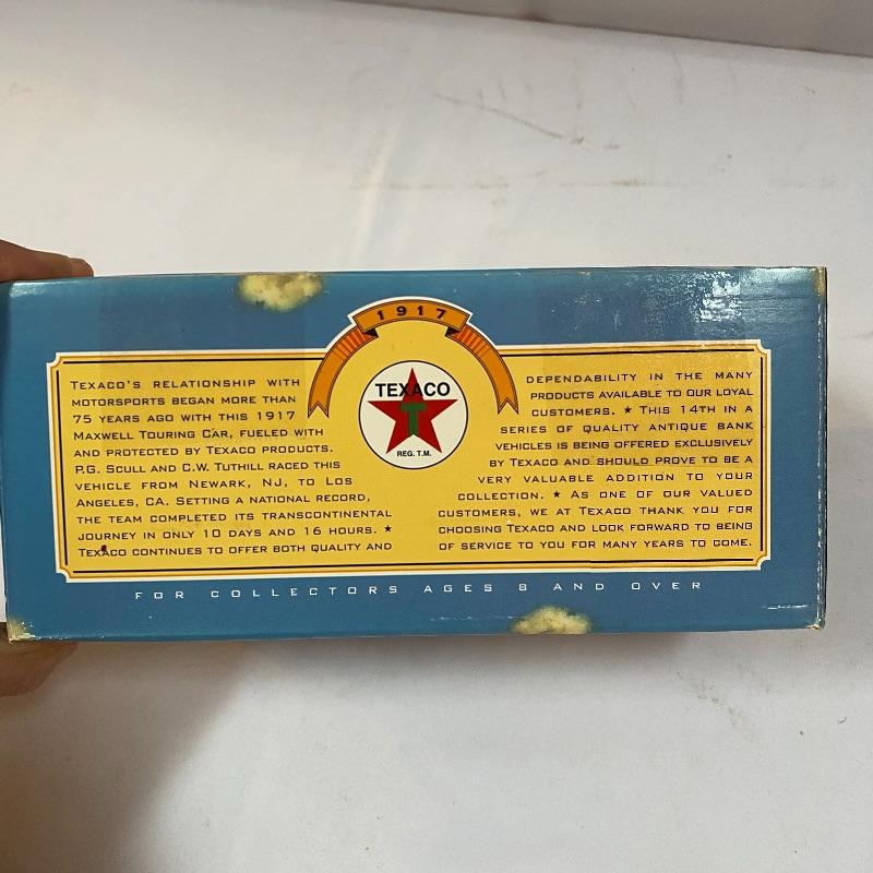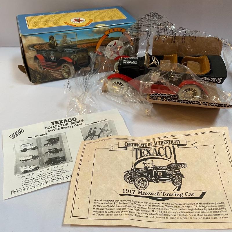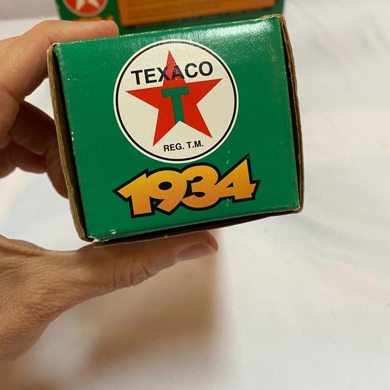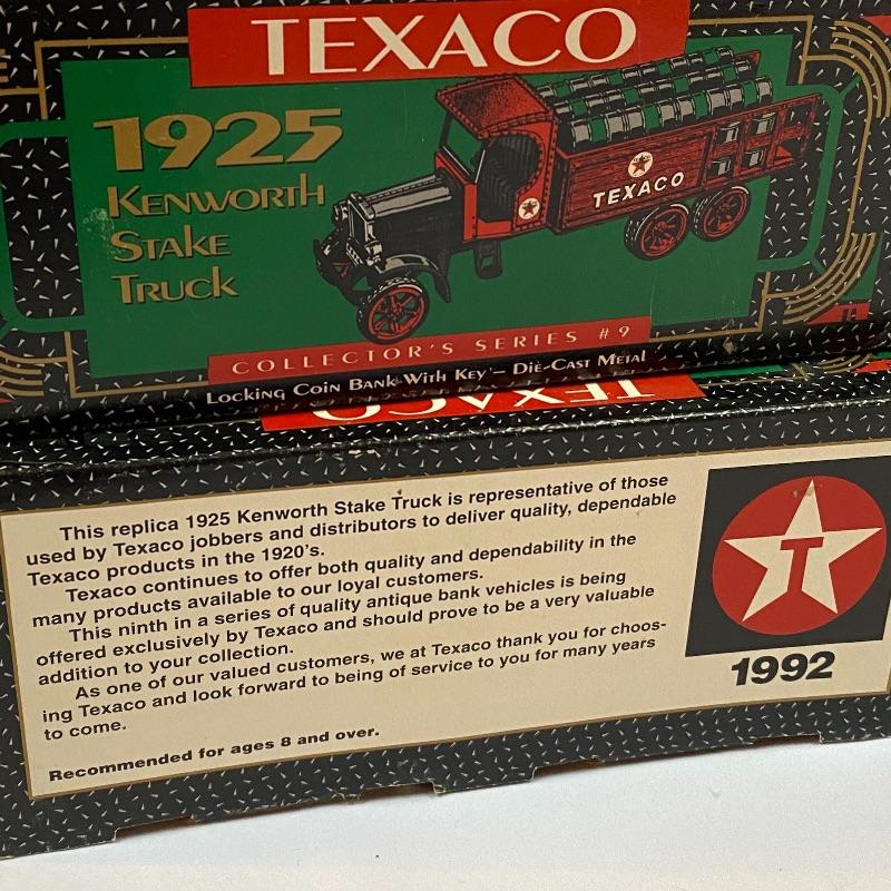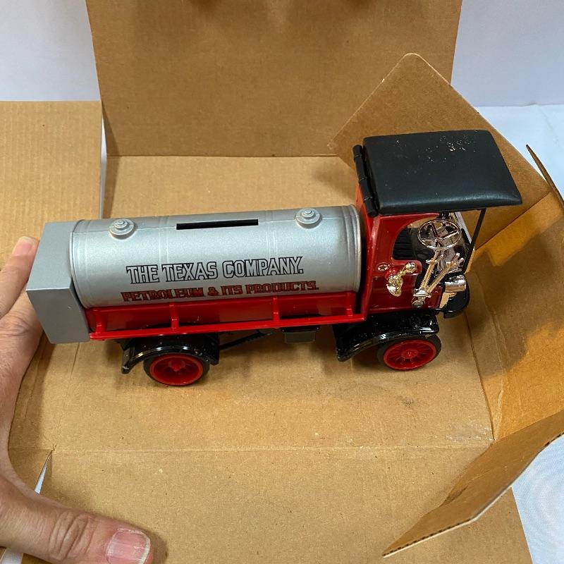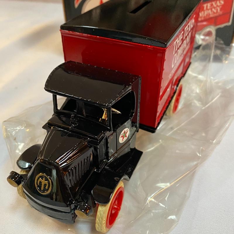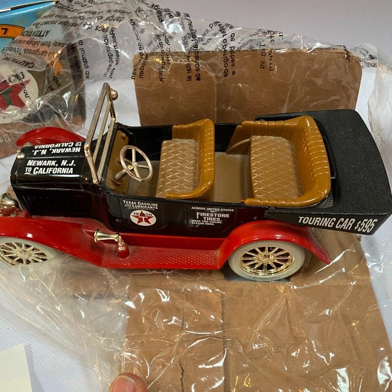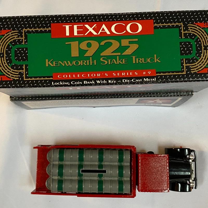 Most of these fun collectible banks have their original packaging. Seventeen total Texaco banks in a variety of styles. They include three 1918 Ford Runabout (two in original box, one without box“”it has a little paint missing from bumper), three 1925 Kenworth Stake Trucks (two in original boxes, one without box), two 1917 Maxwell Touring Cars (two boxes -one of which is original), two 1910 Mack Texaco Tankers (two boxes-one of which is original), two 1939 Dodge Airflows (both in original boxes), two 1925 Mack Bulldog Lubricant Trucks (both original boxes) and three 1934 Diamond Tankers(all original boxes). The vehicles are mostly metal however do have plastic intermixed on most of the vehicles. See photo of measuring tape for size reference. Shipping available.
