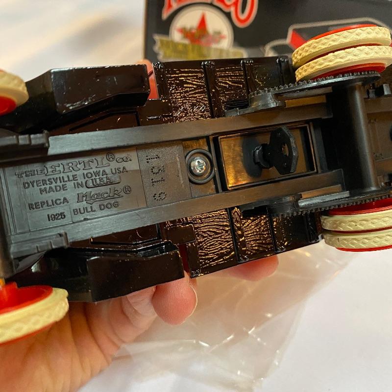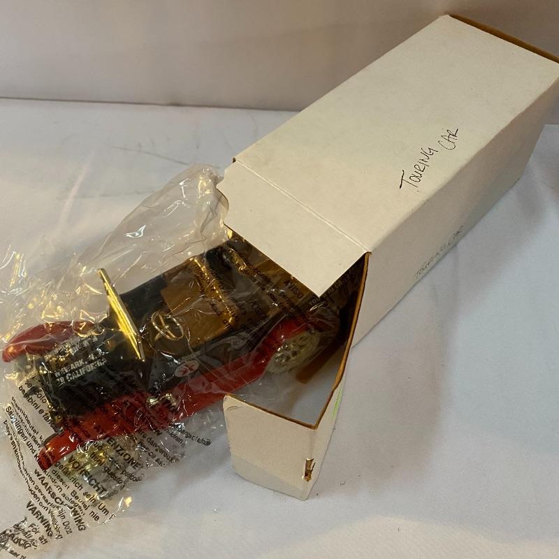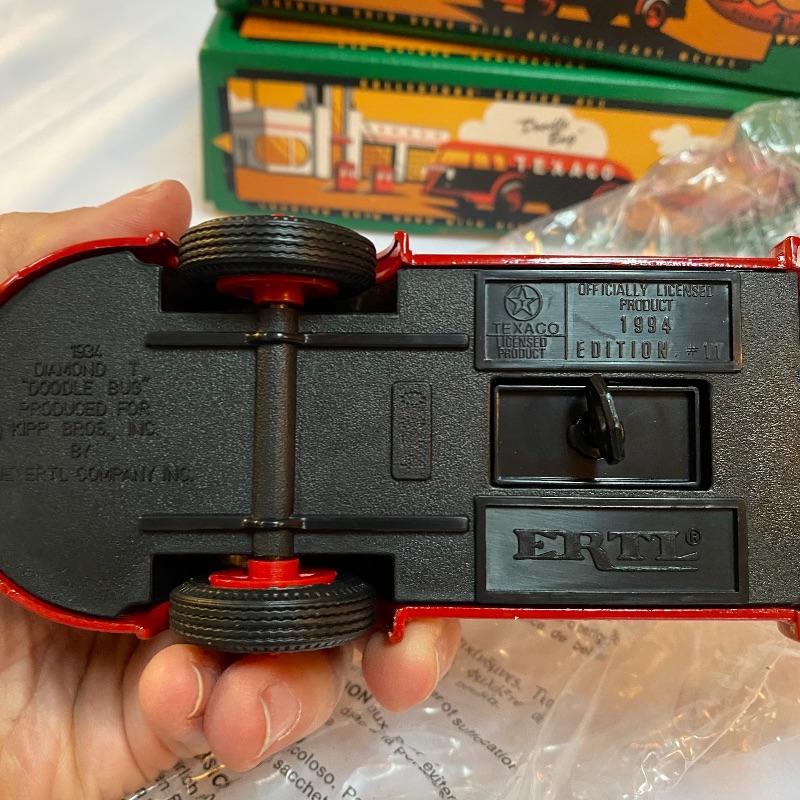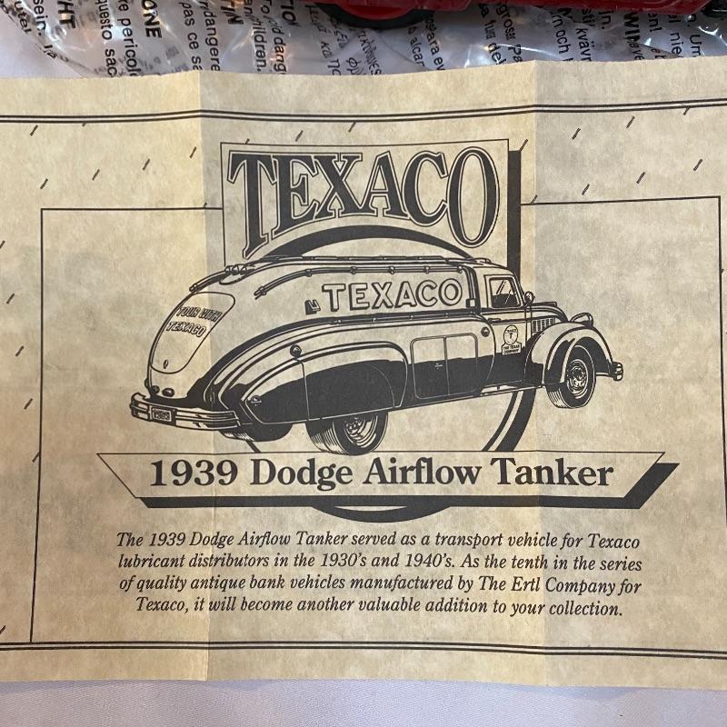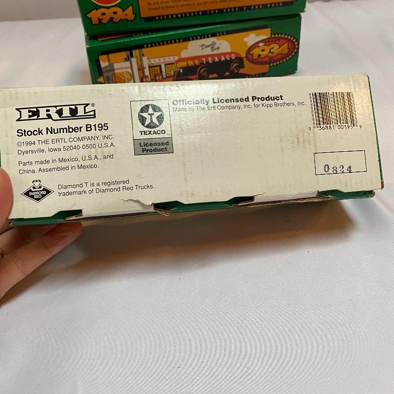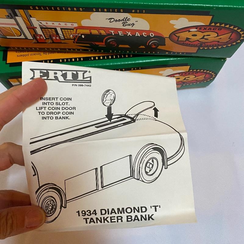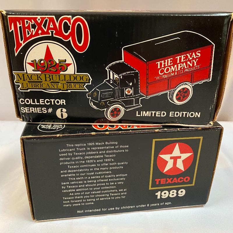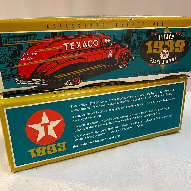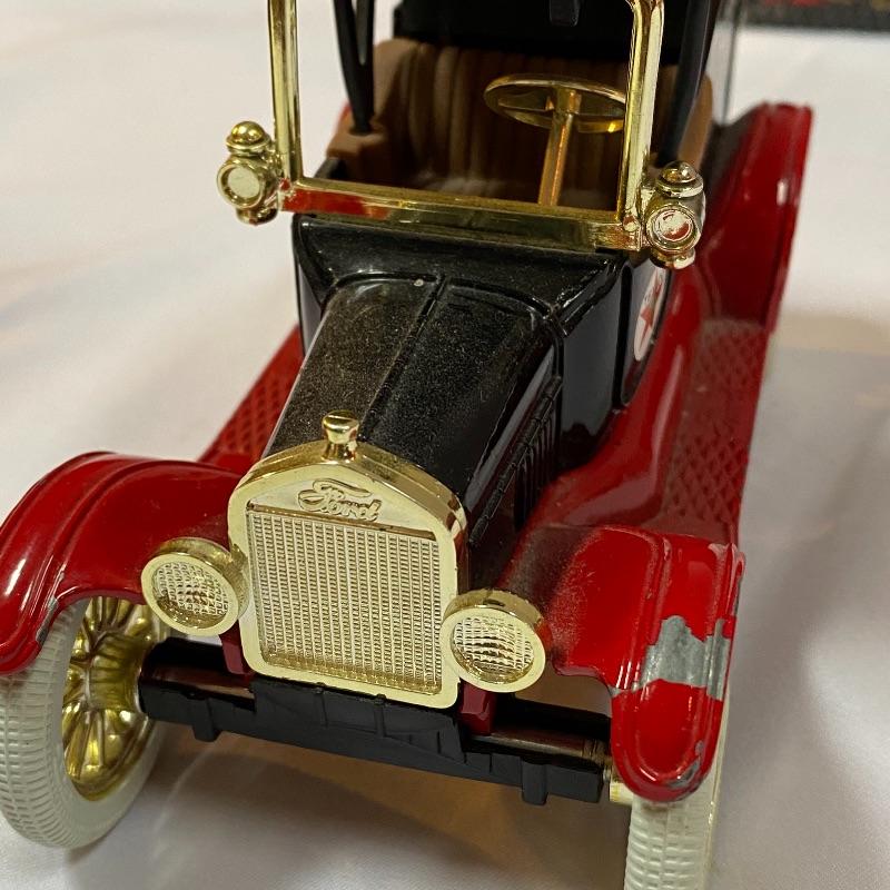 Most of these fun collectible banks have their original packaging. Seventeen total Texaco banks in a variety of styles. They include three 1918 Ford Runabout (two in original box, one without box“”it has a little paint missing from bumper), three 1925 Kenworth Stake Trucks (two in original boxes, one without box), two 1917 Maxwell Touring Cars (two boxes -one of which is original), two 1910 Mack Texaco Tankers (two boxes-one of which is original), two 1939 Dodge Airflows (both in original boxes), two 1925 Mack Bulldog Lubricant Trucks (both original boxes) and three 1934 Diamond Tankers(all original boxes). The vehicles are mostly metal however do have plastic intermixed on most of the vehicles. See photo of measuring tape for size reference. Shipping available.