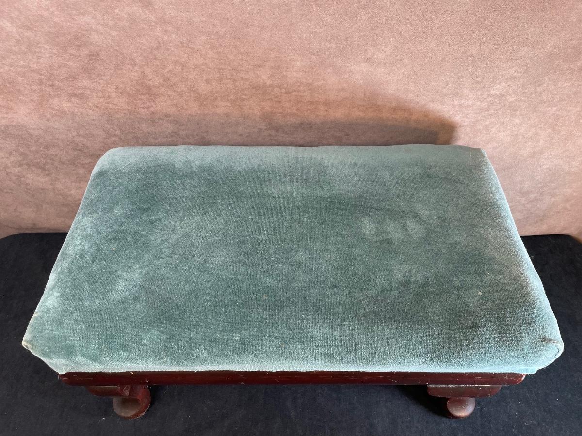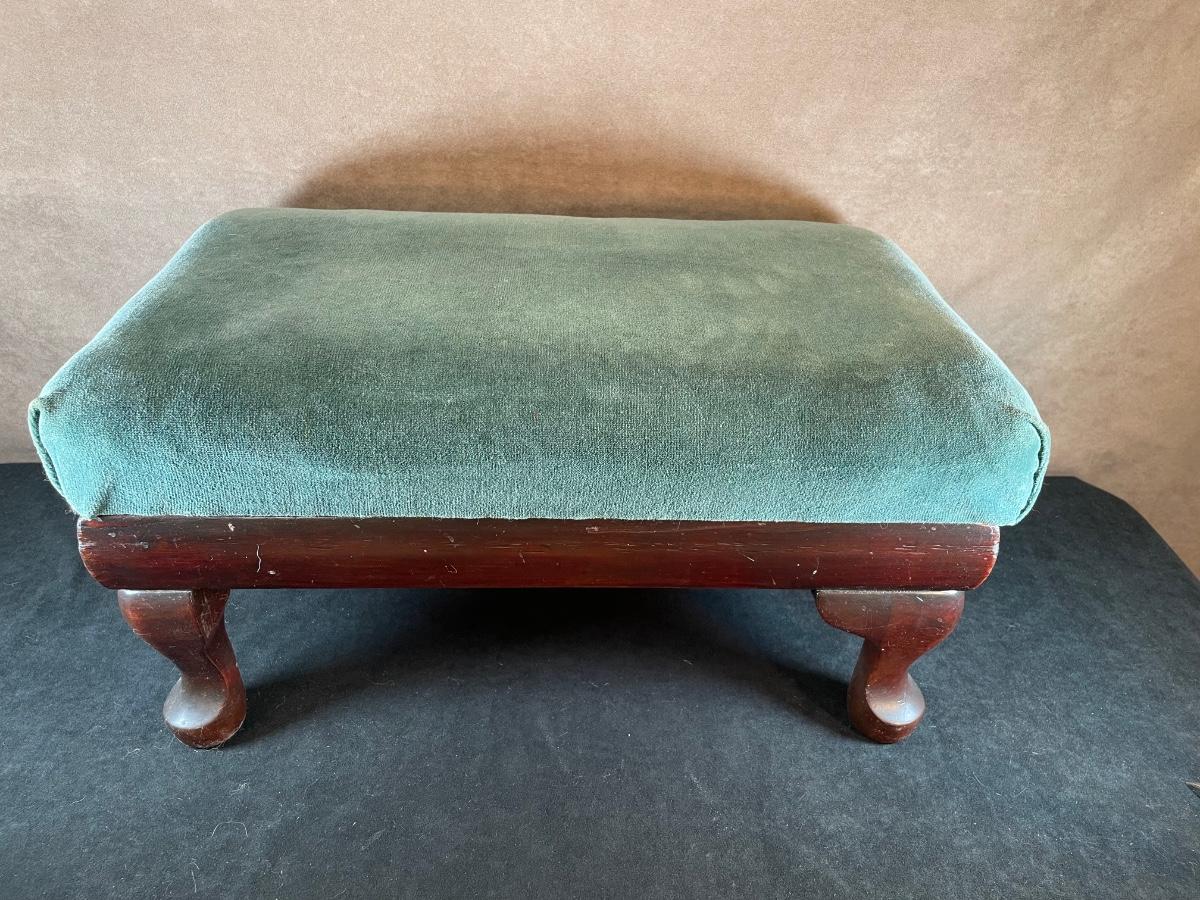 Upholstered in green velvet. Top lifts off to reveal storage. 22" x 12" x 12" high