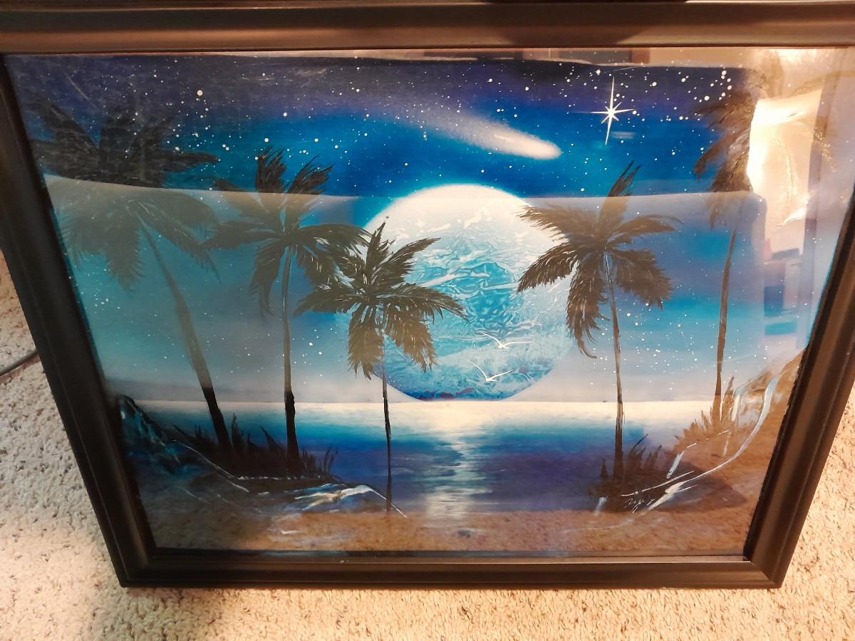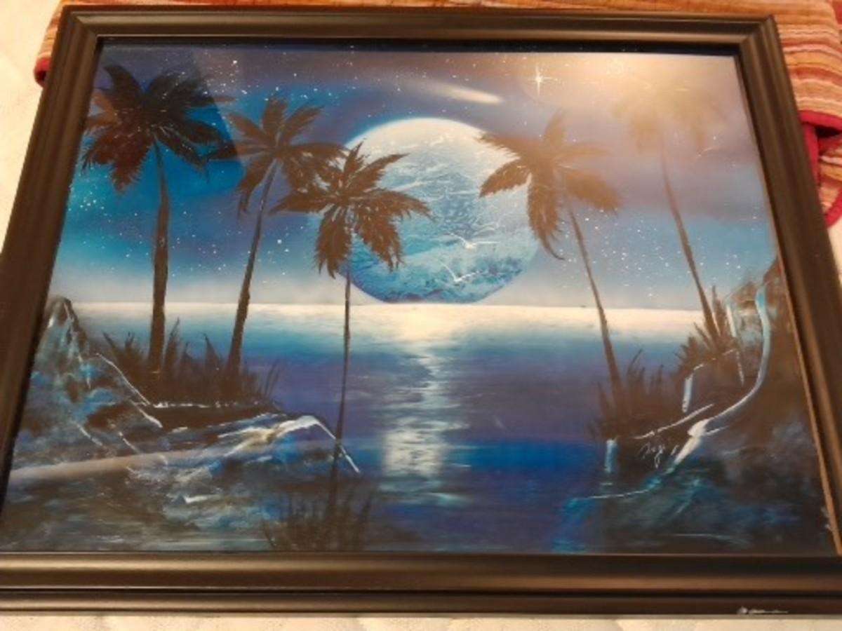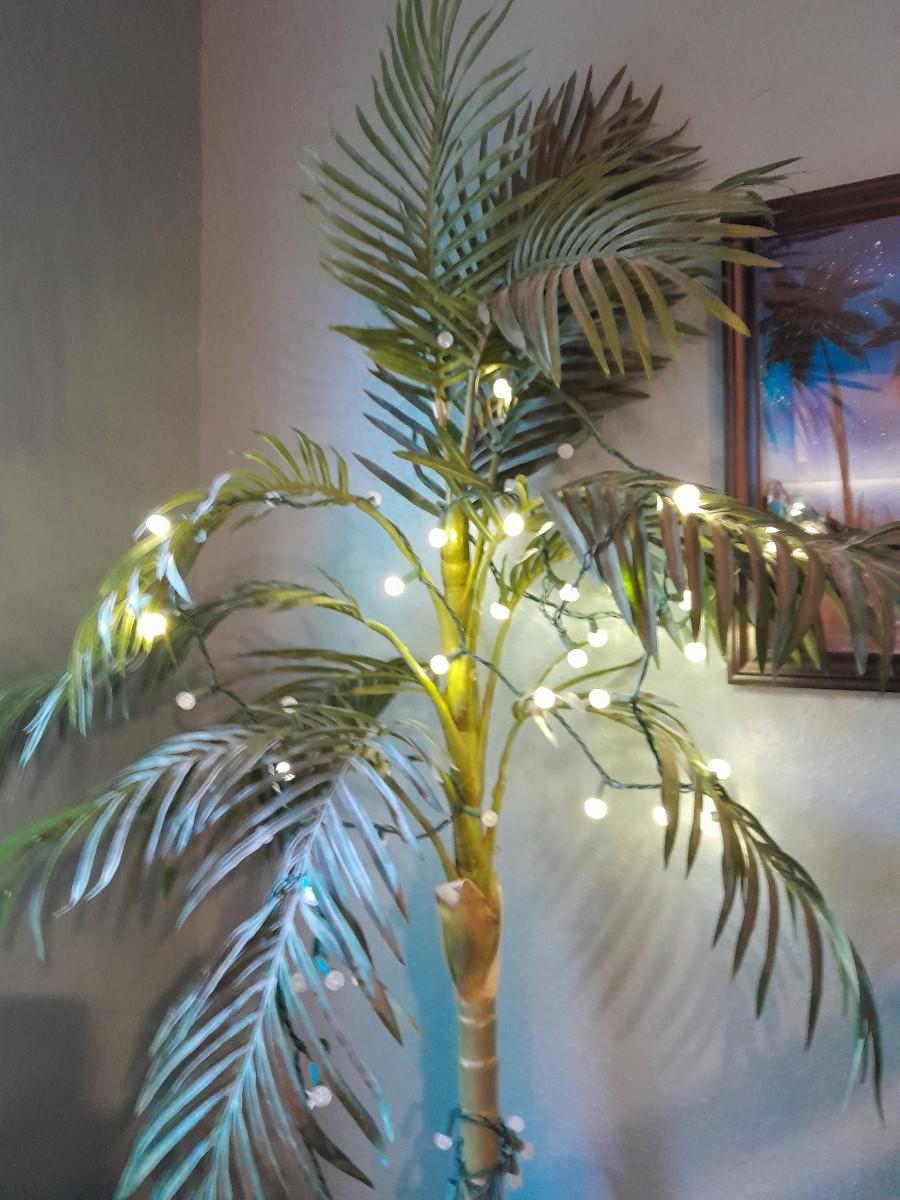 80" FAUX PALM TREE WITH LIGHTS, AND A 22" X 18" BEACH, MOON, PALM TREE FRAMED PICTURE