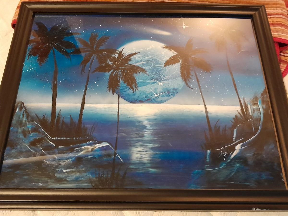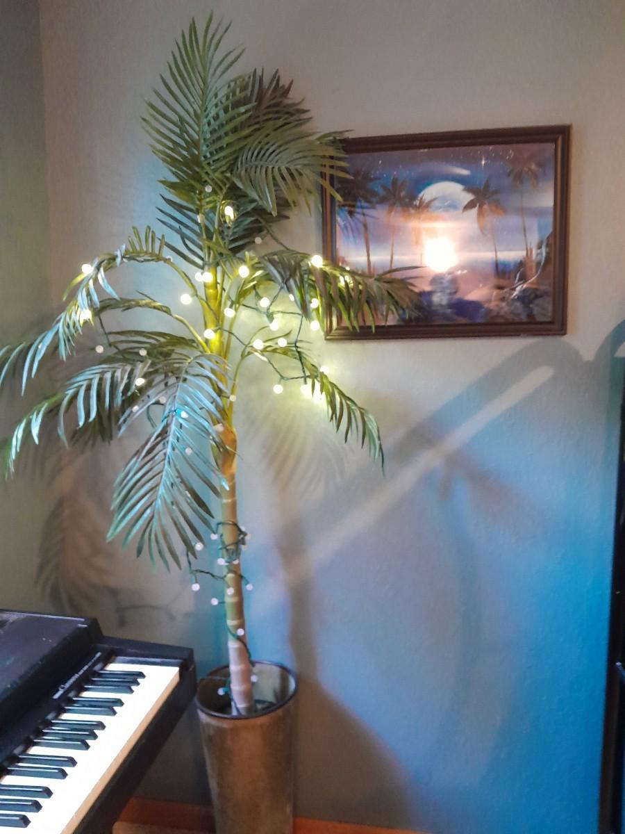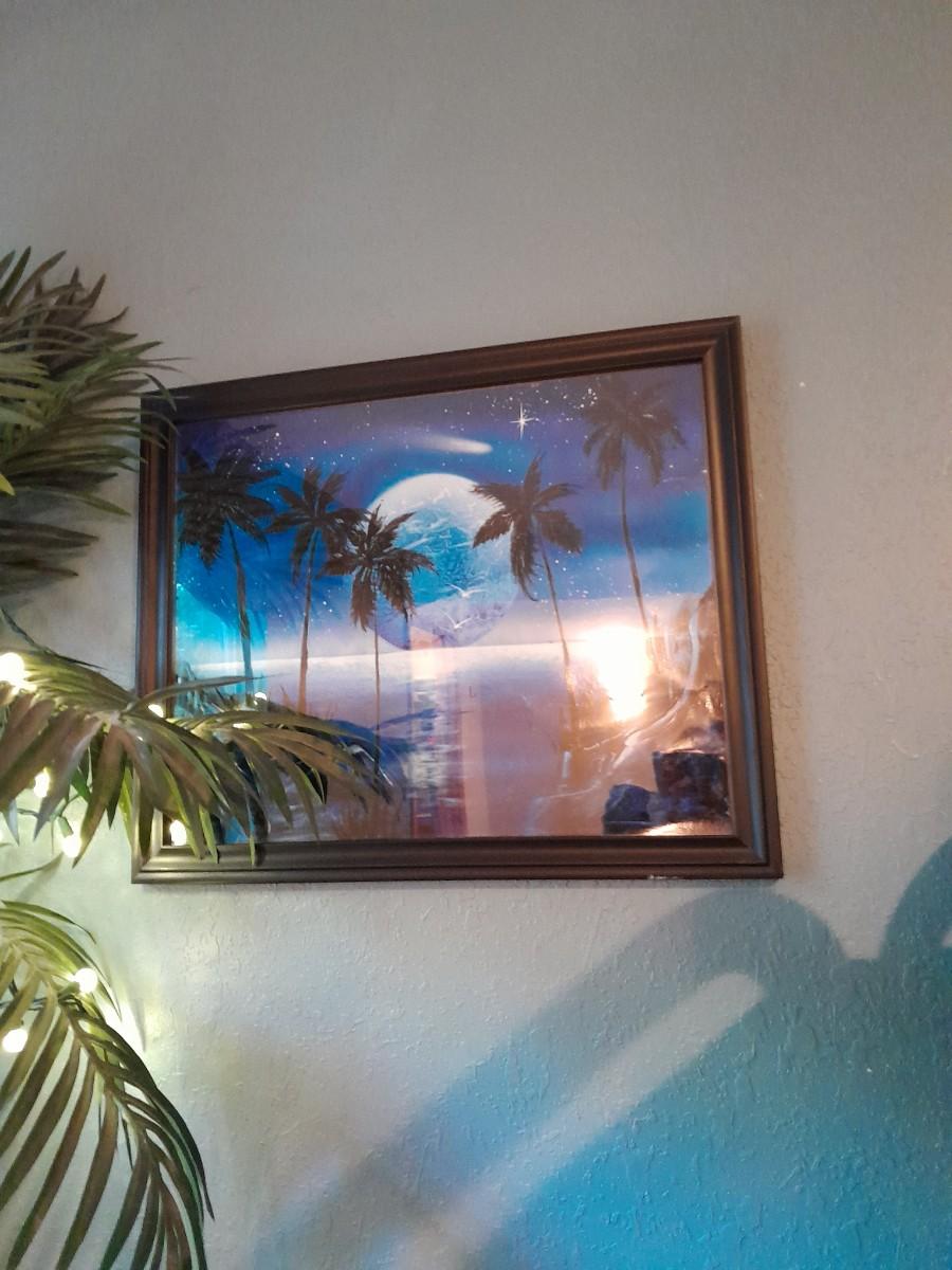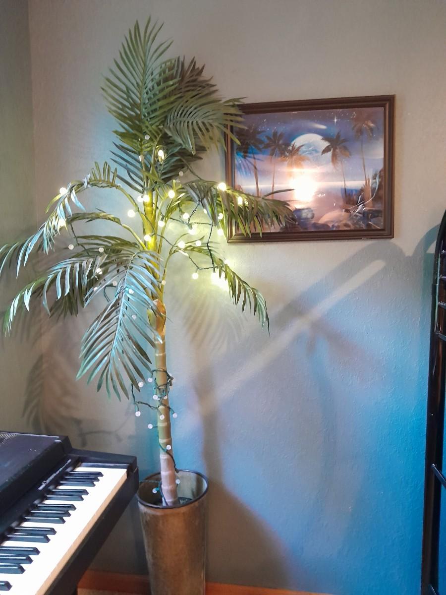 80" FAUX PALM TREE WITH LIGHTS, AND A 22" X 18" BEACH, MOON, PALM TREE FRAMED PICTURE