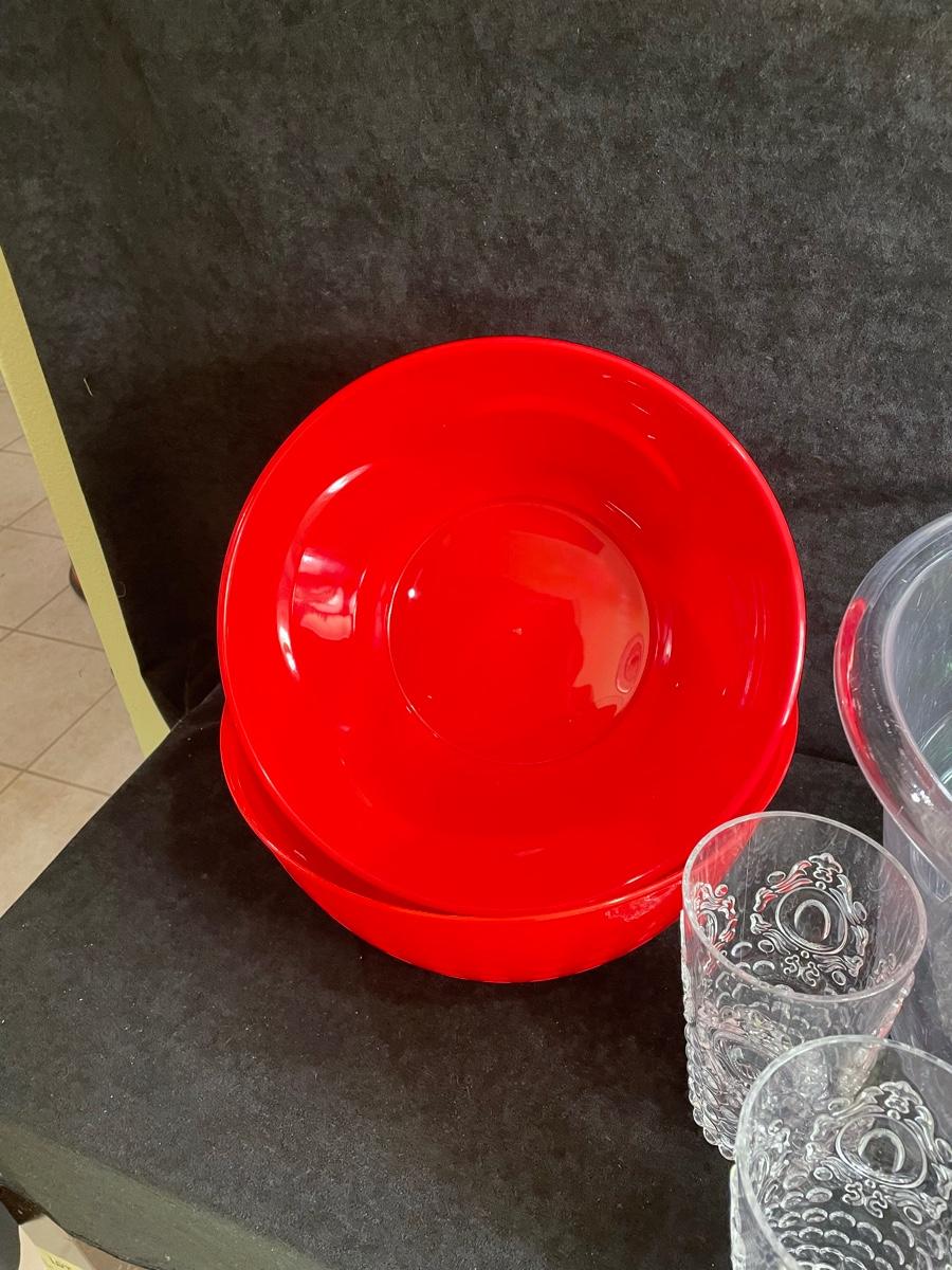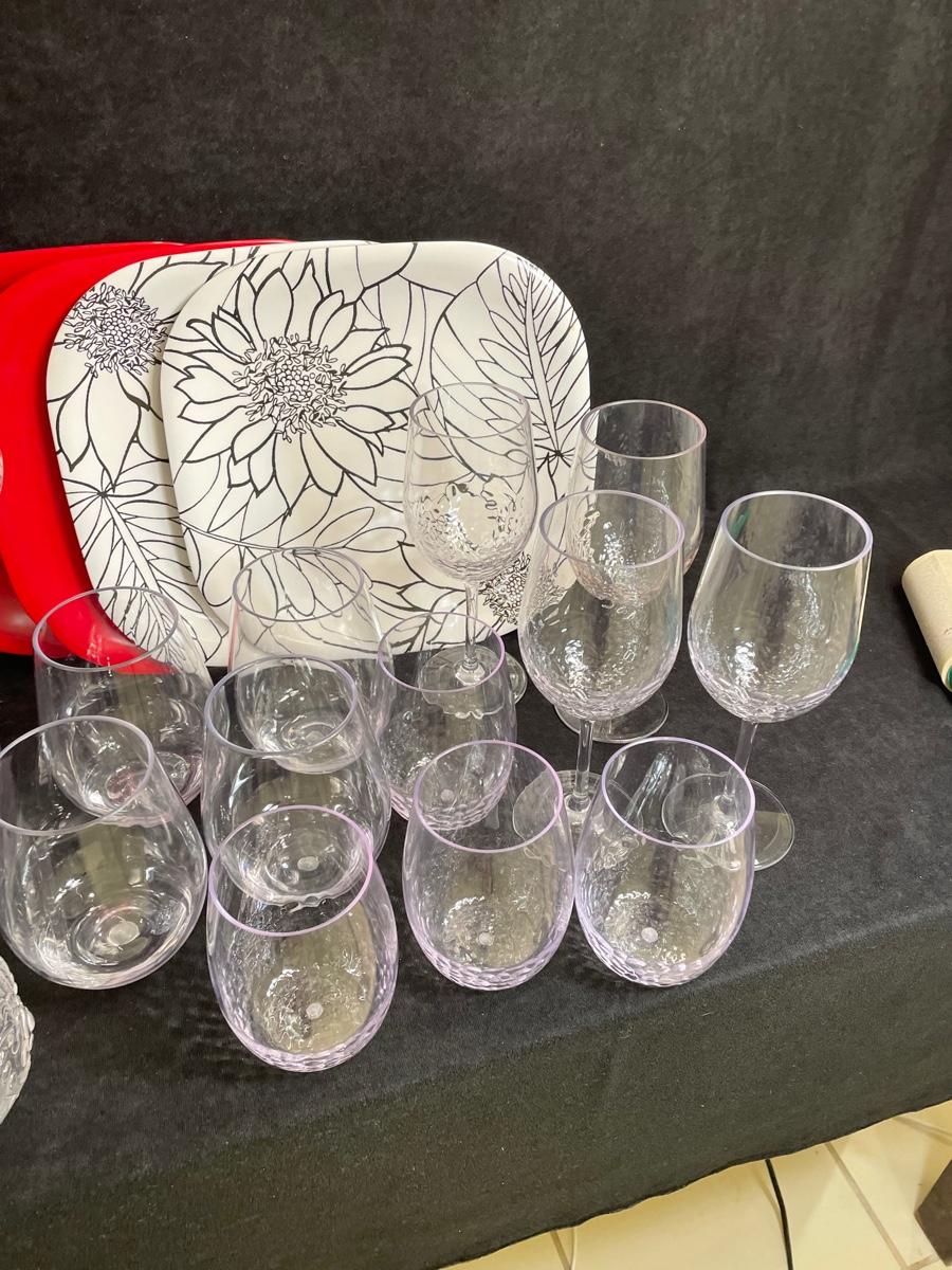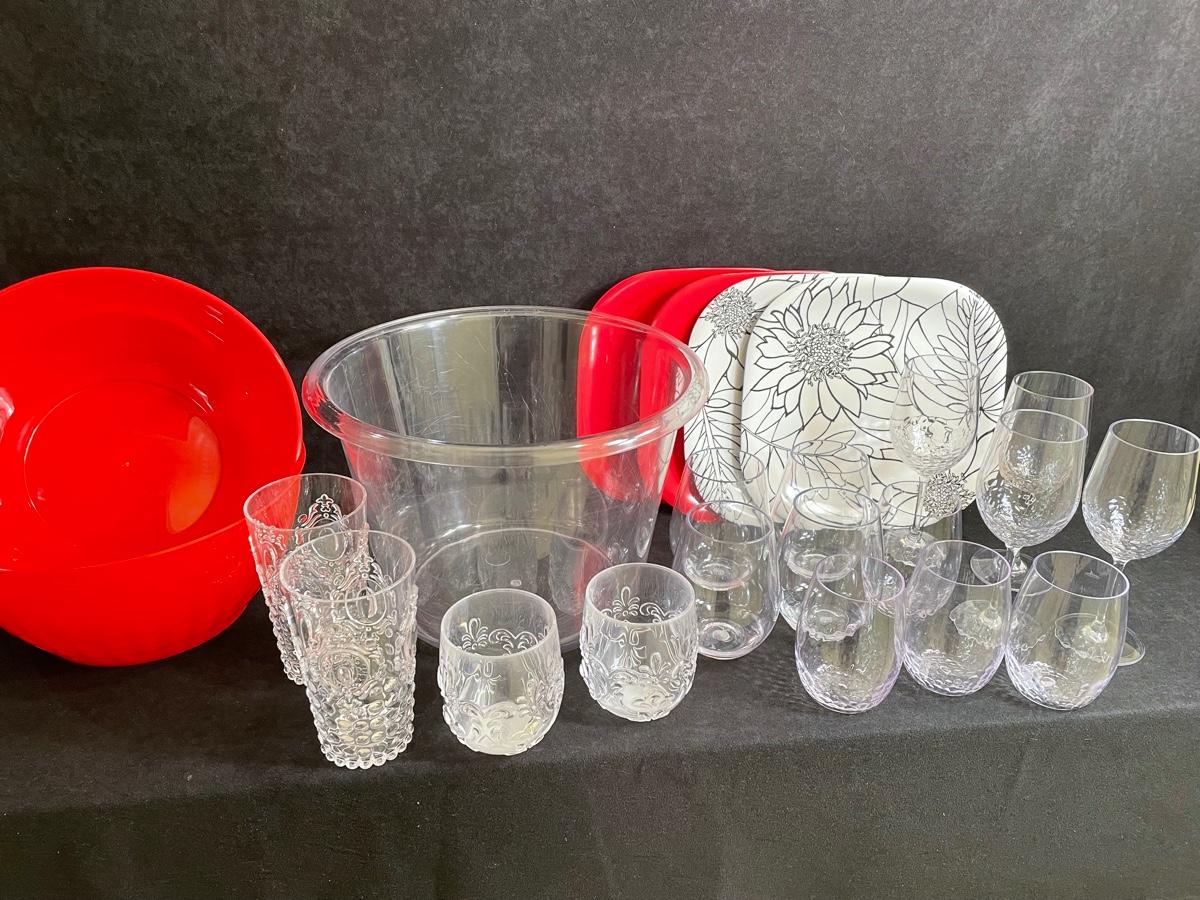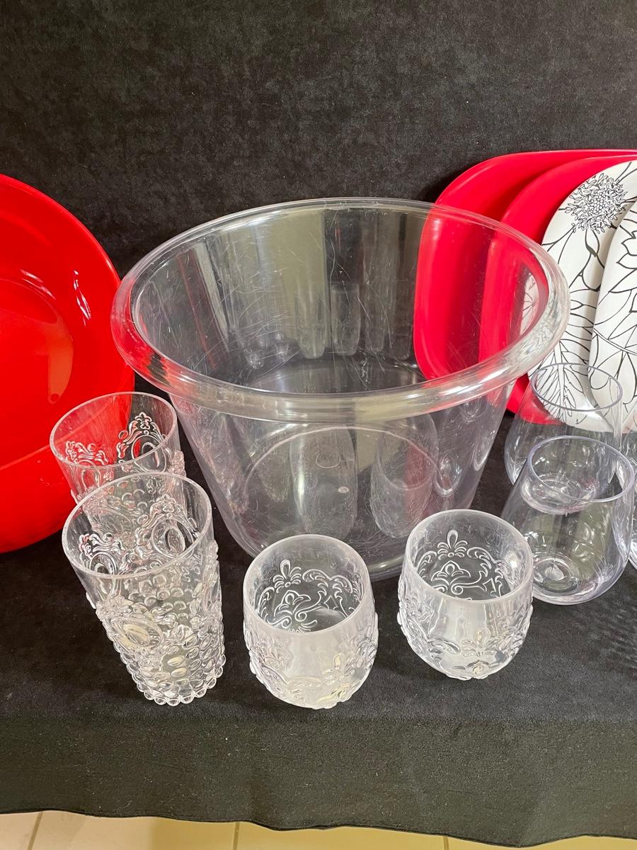 14 assorted glasses, 4 plates, t=2 large bowls, and a plastic bucket