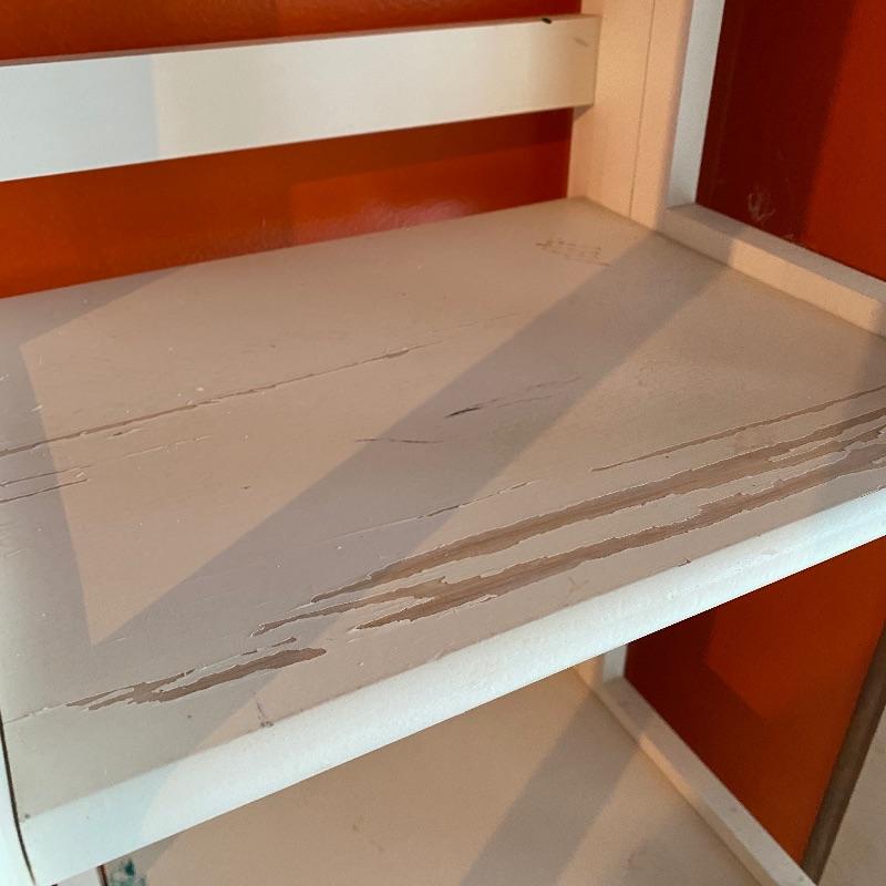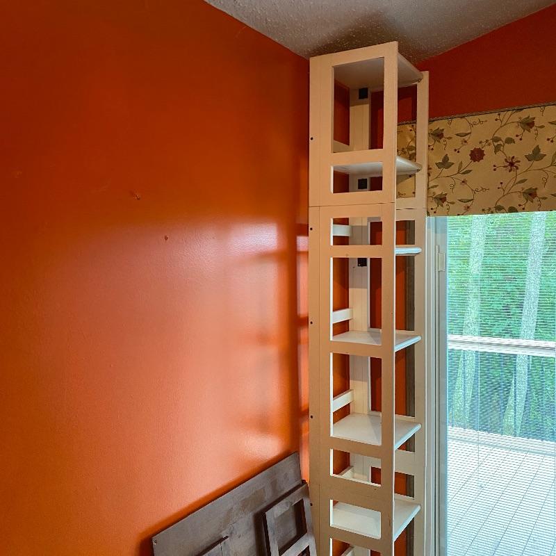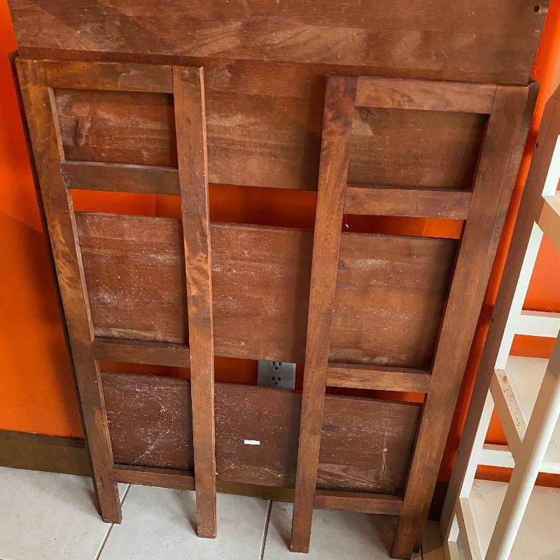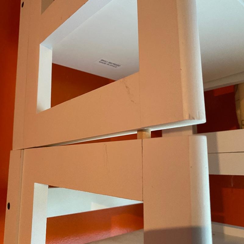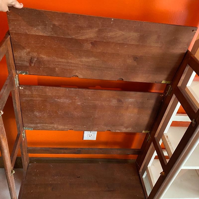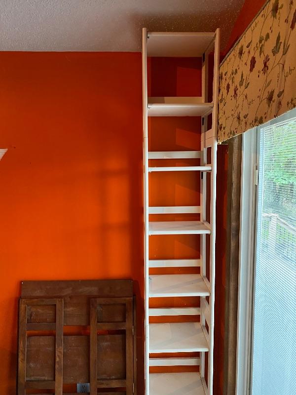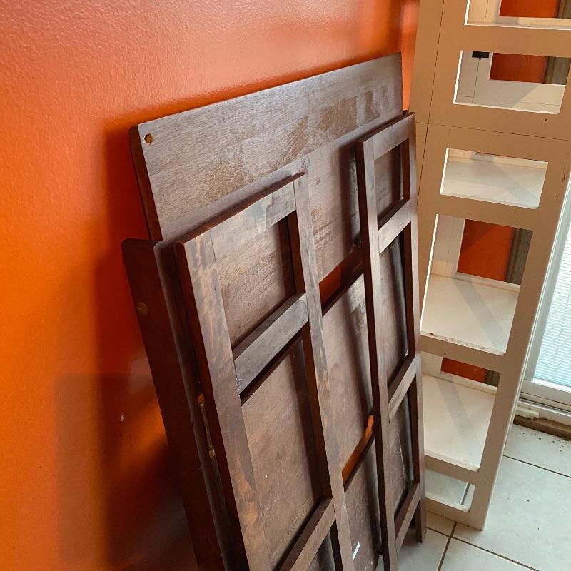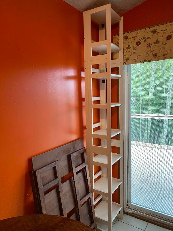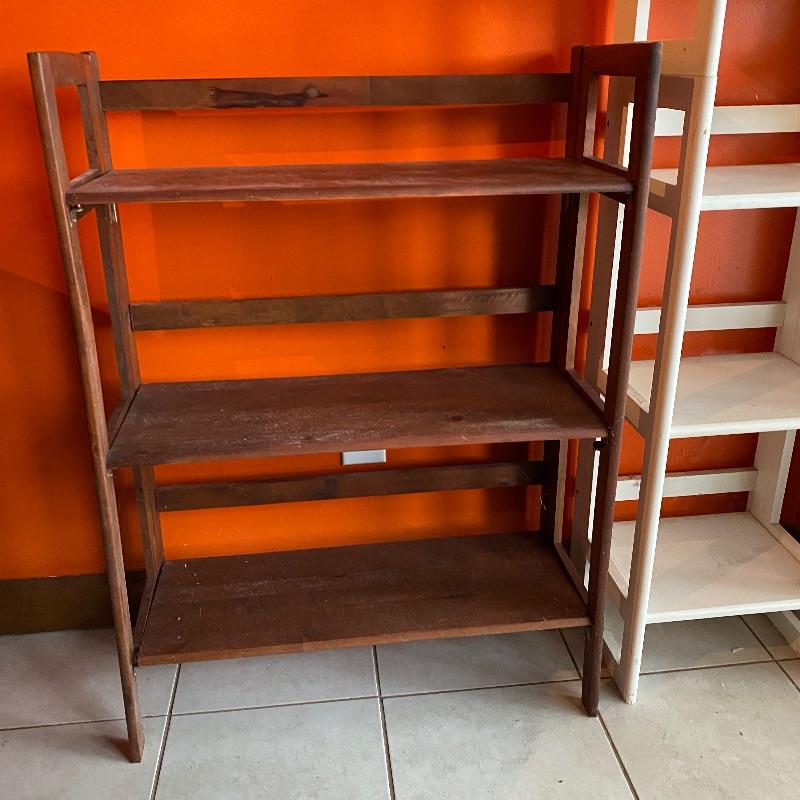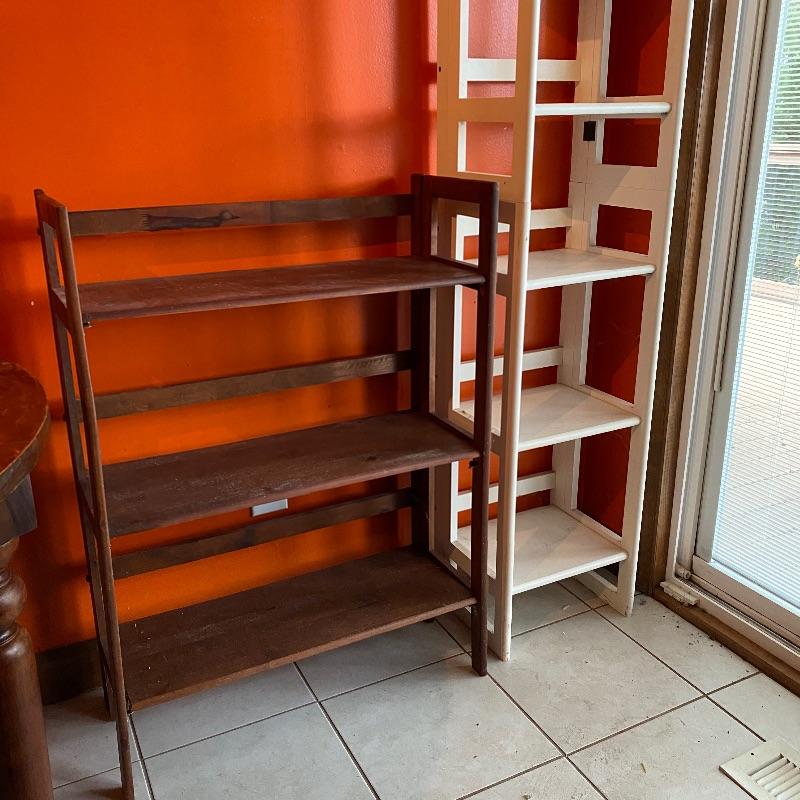 These two great storage pieces can be pulled out of a closet when you need some extra shelving. One is brown with three shelves that fold up and sides in to close. It is a bit dusty but in good condition. Measures 27.25” x 11.5” x 38.5” tall when fully open. The second shelving system is white and folds the same way as brown one. It appears to be 3 shelves stacked on top of each other with pegs holding them in place. See close up photo. A fresh coat of paint would do wonders as it has a few scuffs. All are 14” across by 12” deep. Top piece has two shelves and measures 19.5” tall. Middle piece and bottom piece are 37” tall with three shelves. All three together are 93.5” tall. Local pick up only.