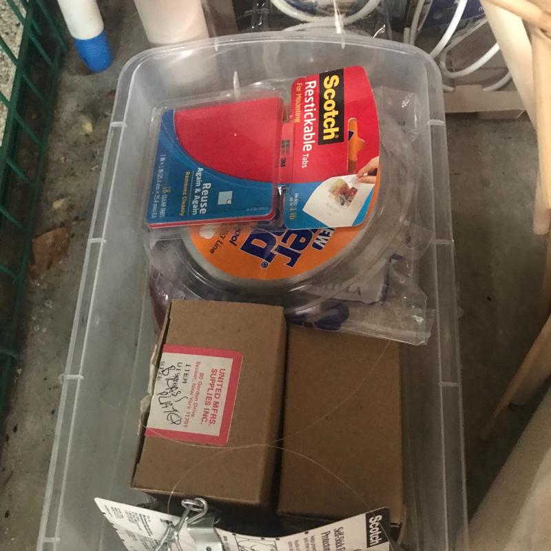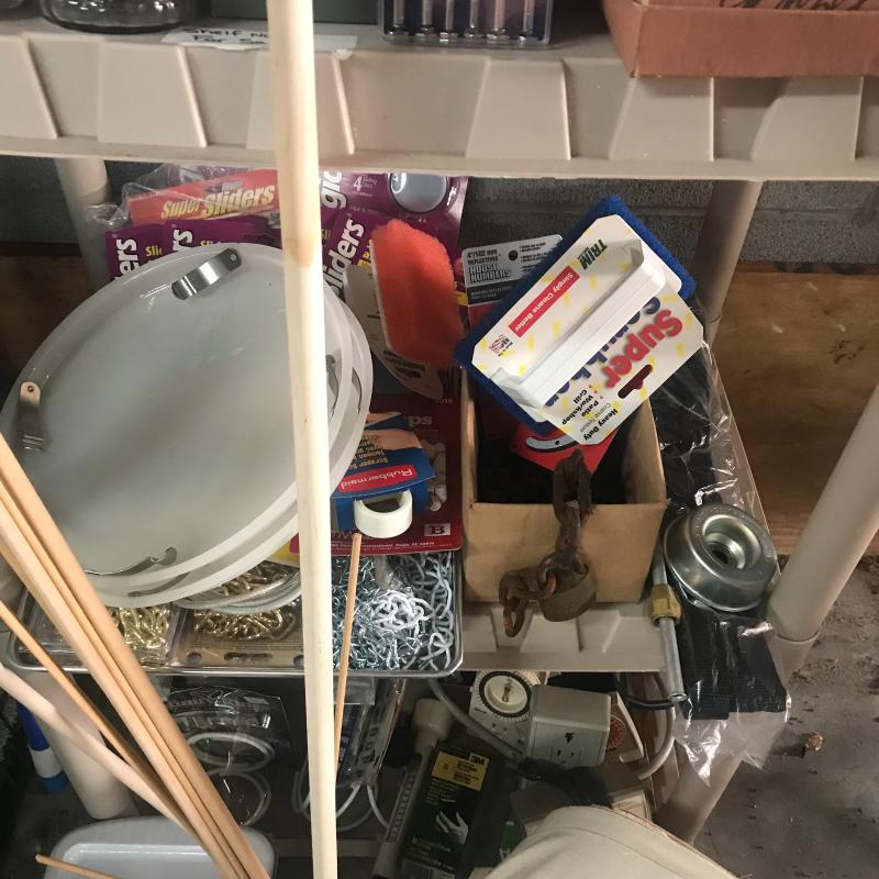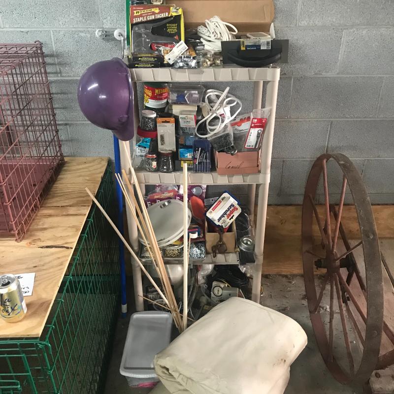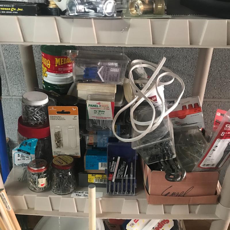 Items any homeowner needs. Screws, nails, staple gun with staples, drop cloths, roller heads, picture hanging accessories, electrical accessories, hard hats, extension cords, faucet connectors, carpet sliders, outlet timers, dowels and more. Shelf unit in pix not included in the lot. Local pick up only.