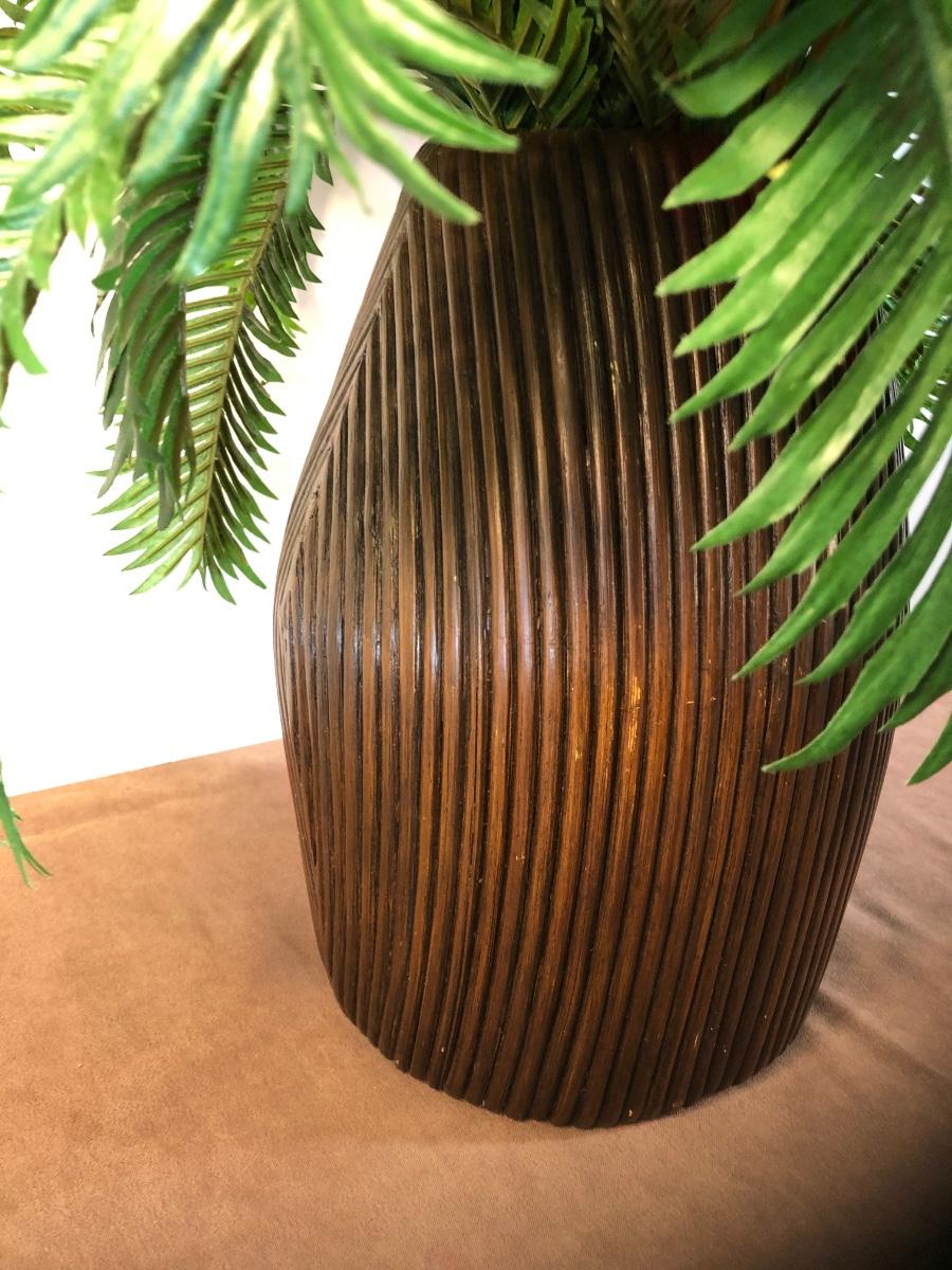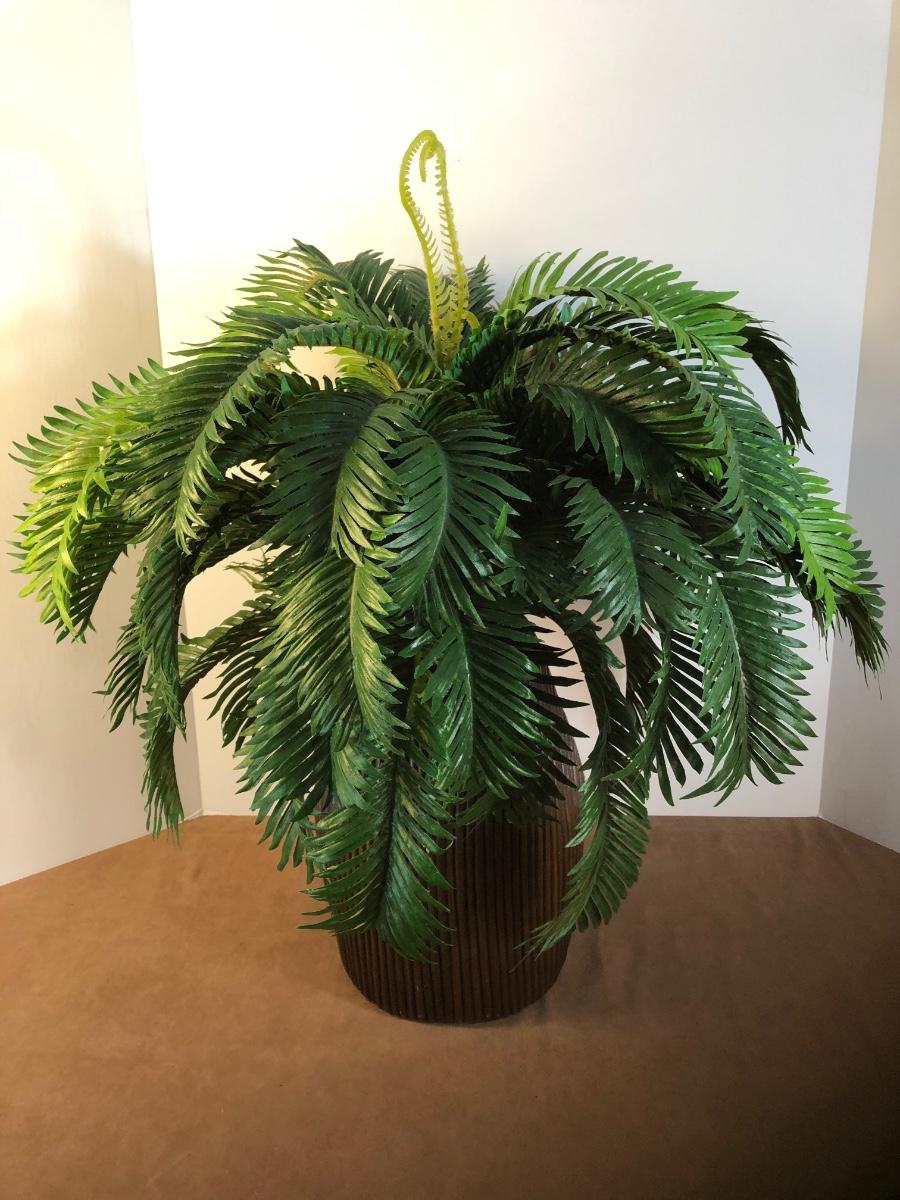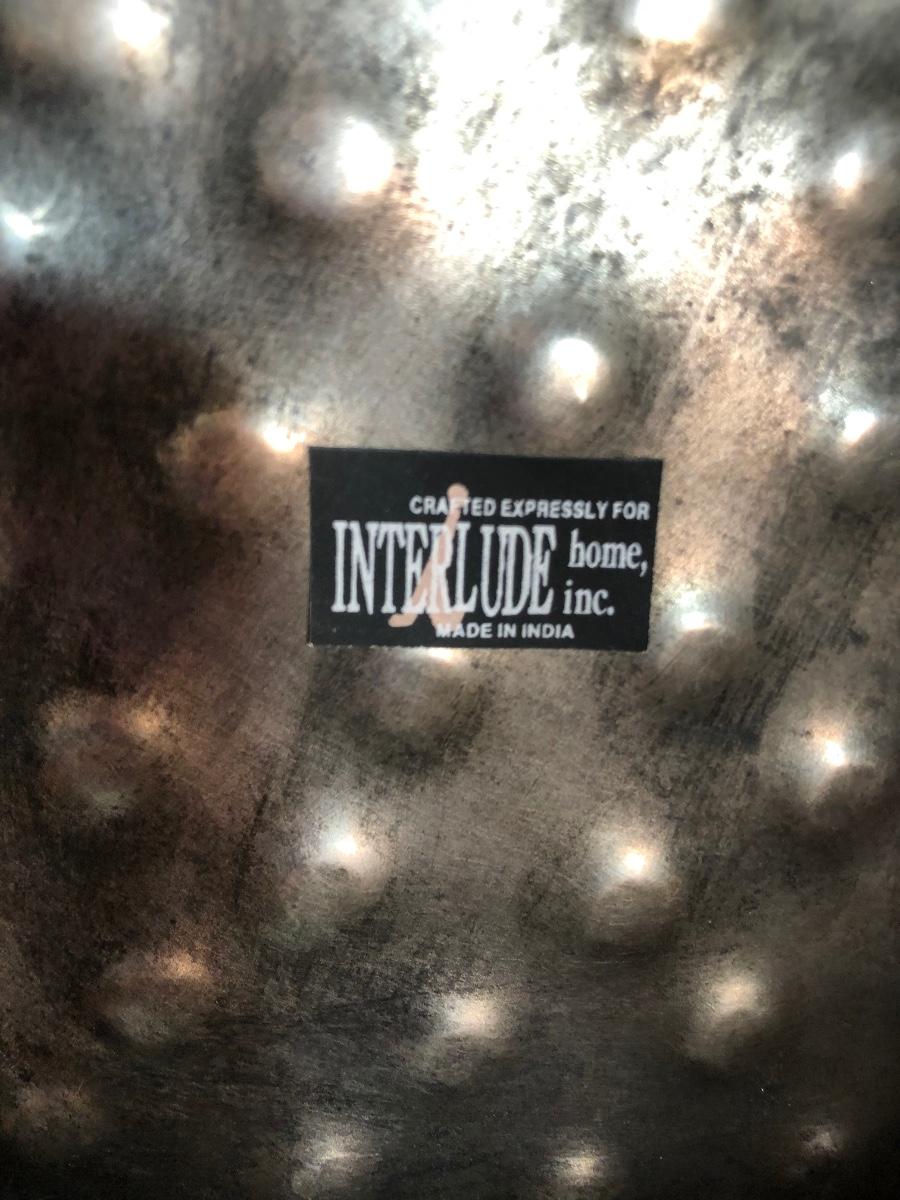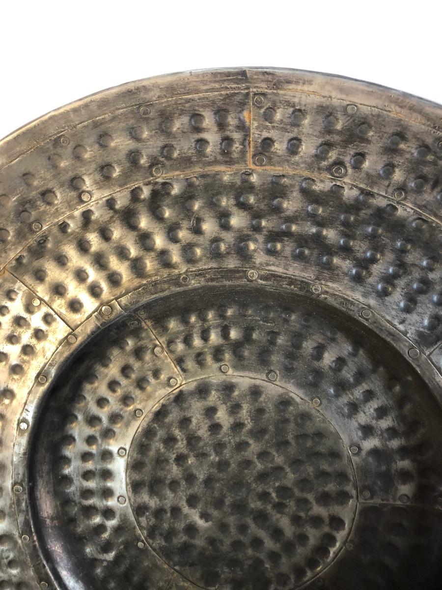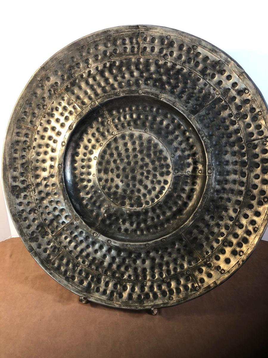 Hammered metal platter (24" dia.) on stand and silk palm in wood planter 23" tall