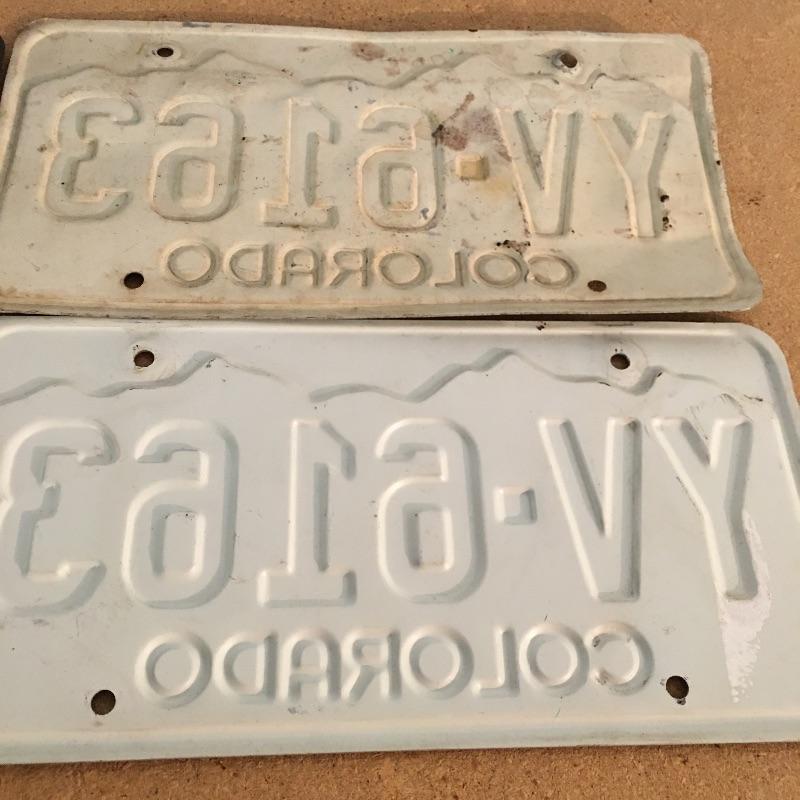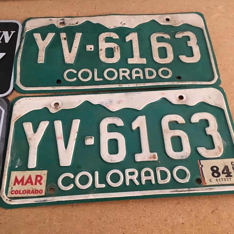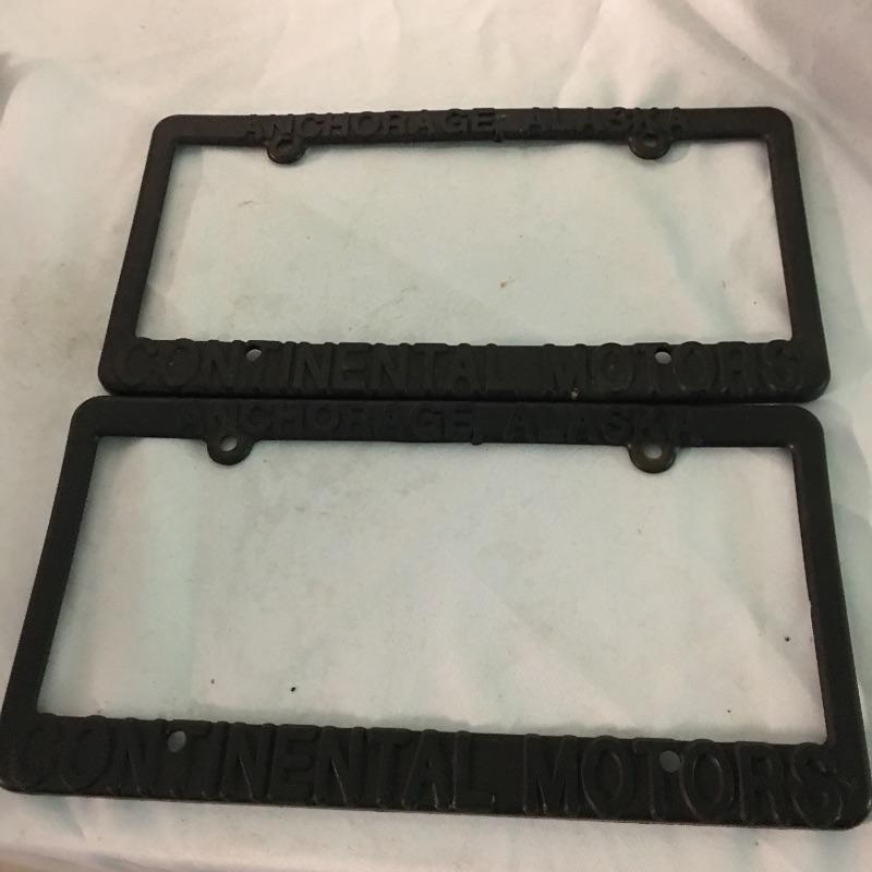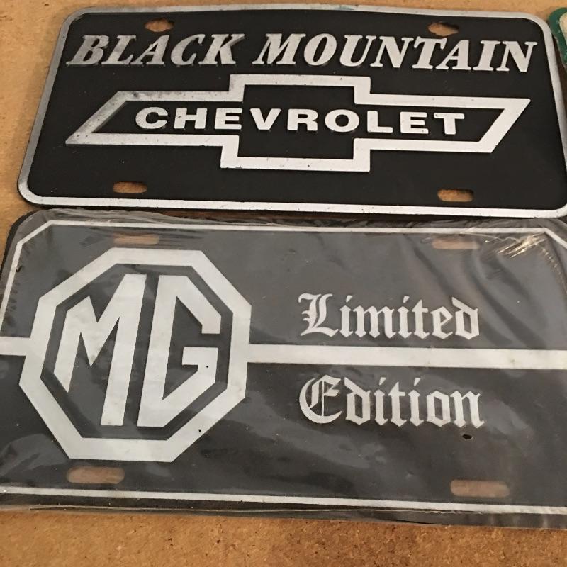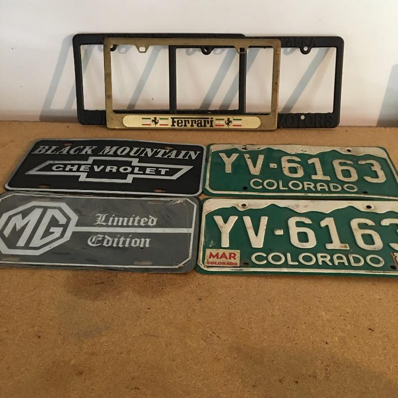Lot includes two matching vintage Colorado plates, Continental Motors frames, Ferrari frame, MG plate and a Black Mountain Chevrolet plate.
