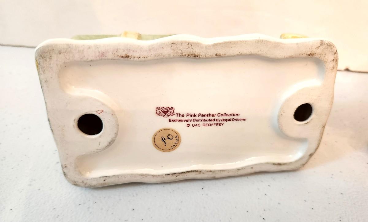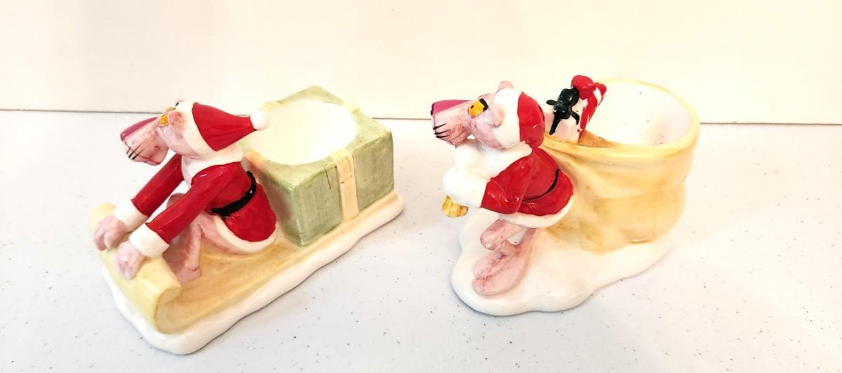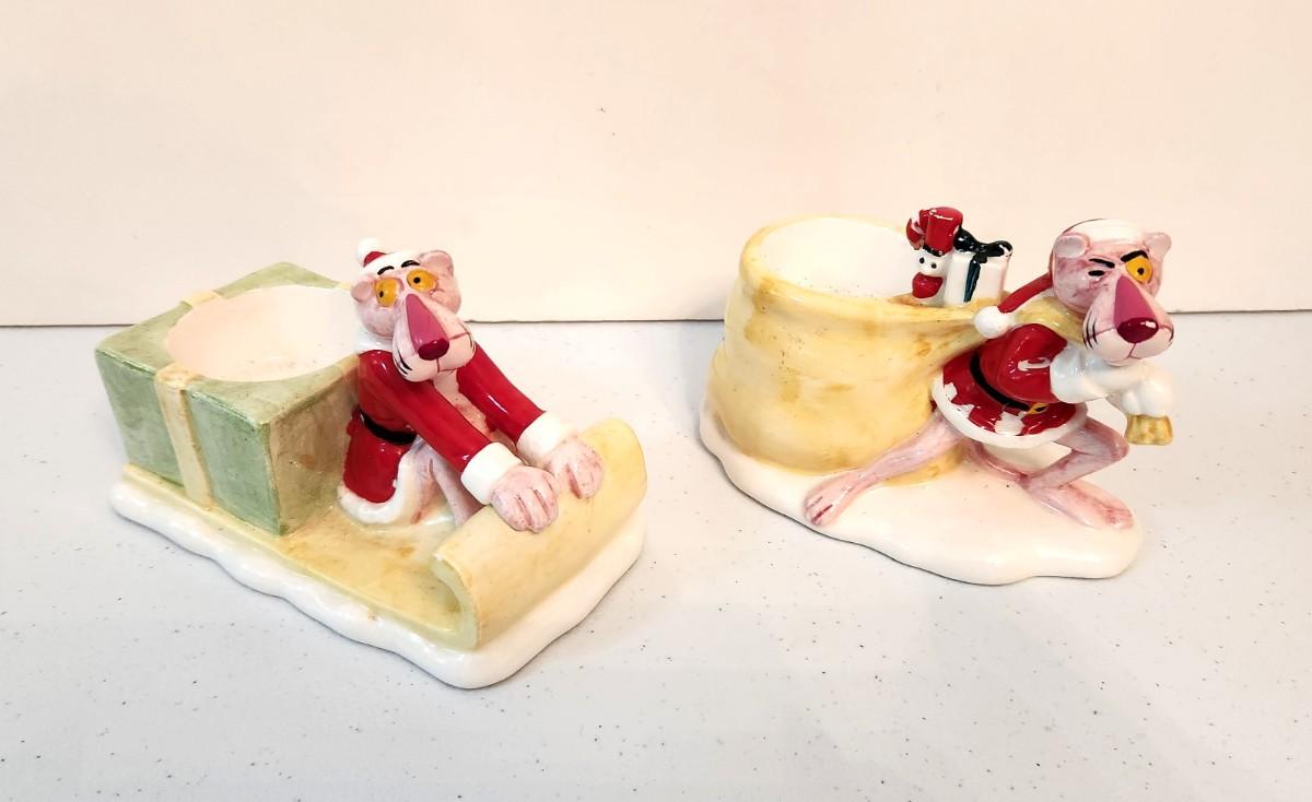 Lot of 2 scarce Pink Panther ceramic Christmas ornaments - 1980's - Japan sticker - one 5" tall, the other 4" tall. Good vintage condition. - hard to find.