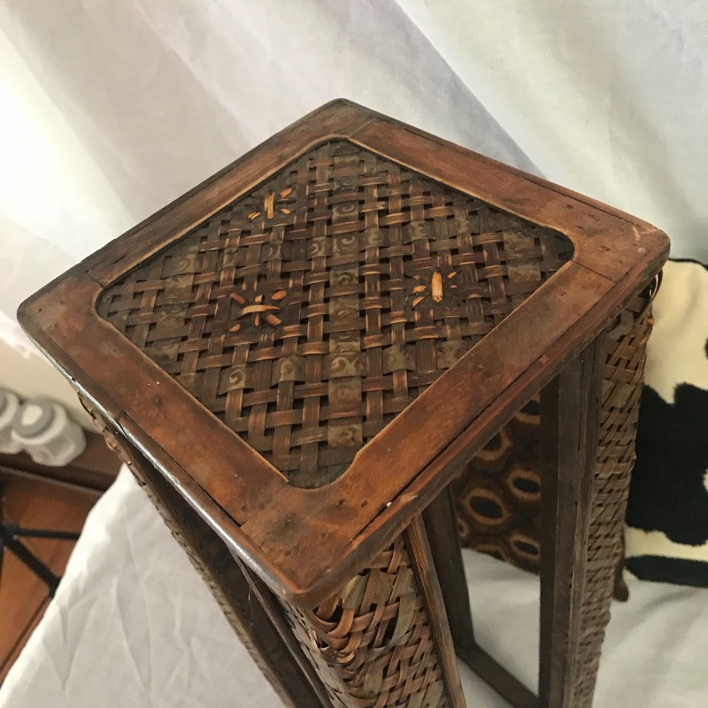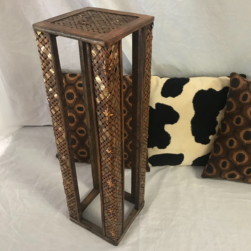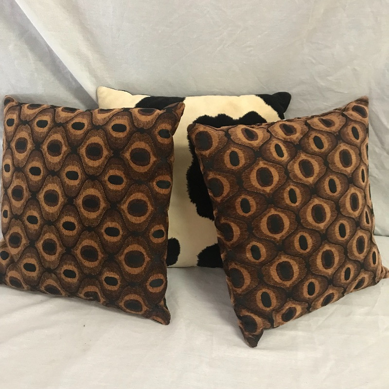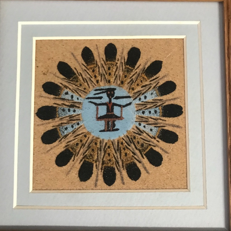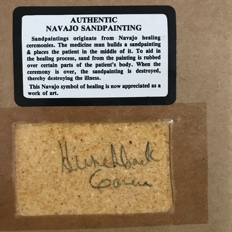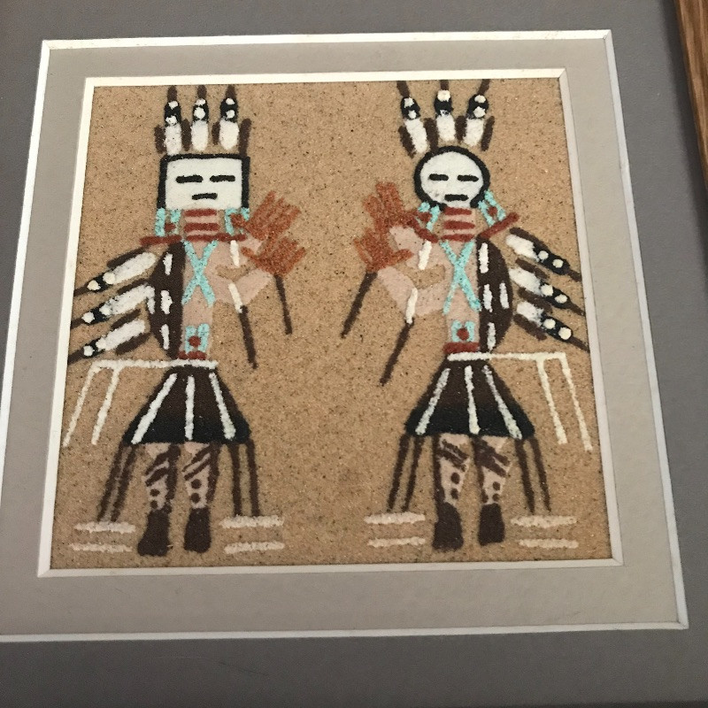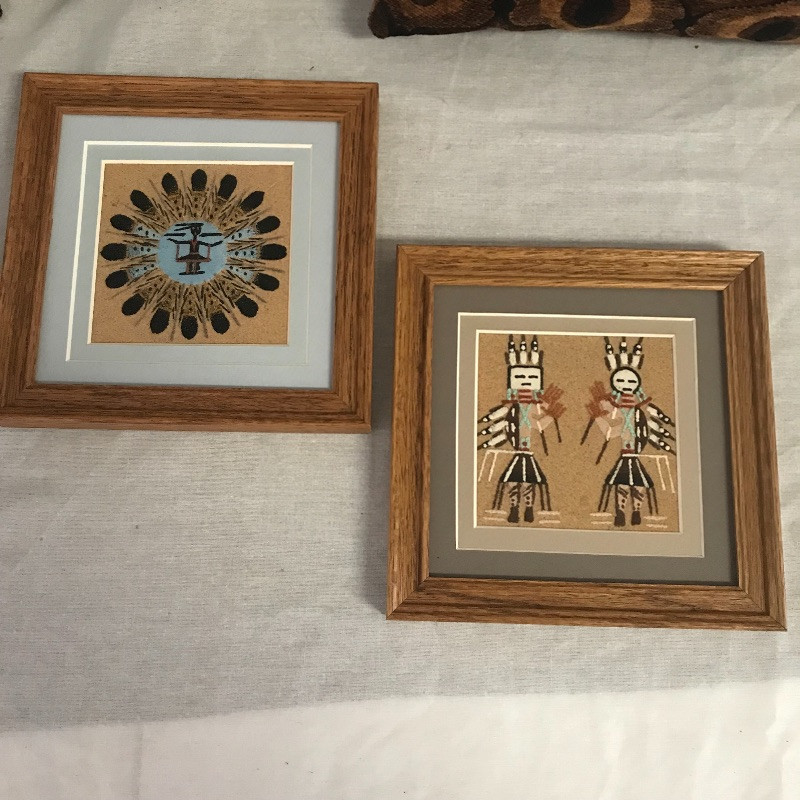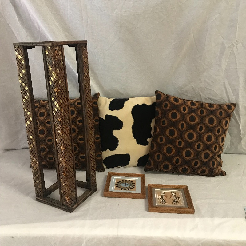 Two sweet Navajo sand art pieces matted and framed with story of origin on the back. Each frame measures 7.5” x7.5”. To accompany these pieces we have added a woven plant stand that stands 26” tall. Two black, brown and gold throw pillows and a black and white cattle print pillow. Local pick up only.