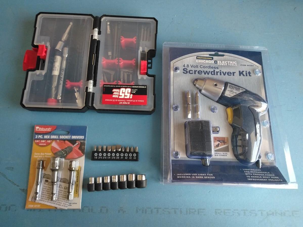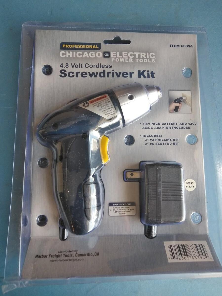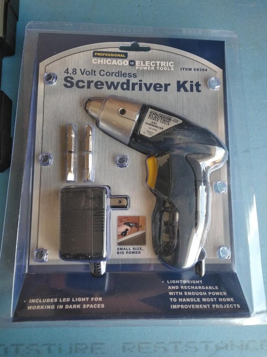 NEW CHICAGO ELECTRIC SCREWDRIVER KIT, WITH EXTRA BITS AND ACCESSORIES.