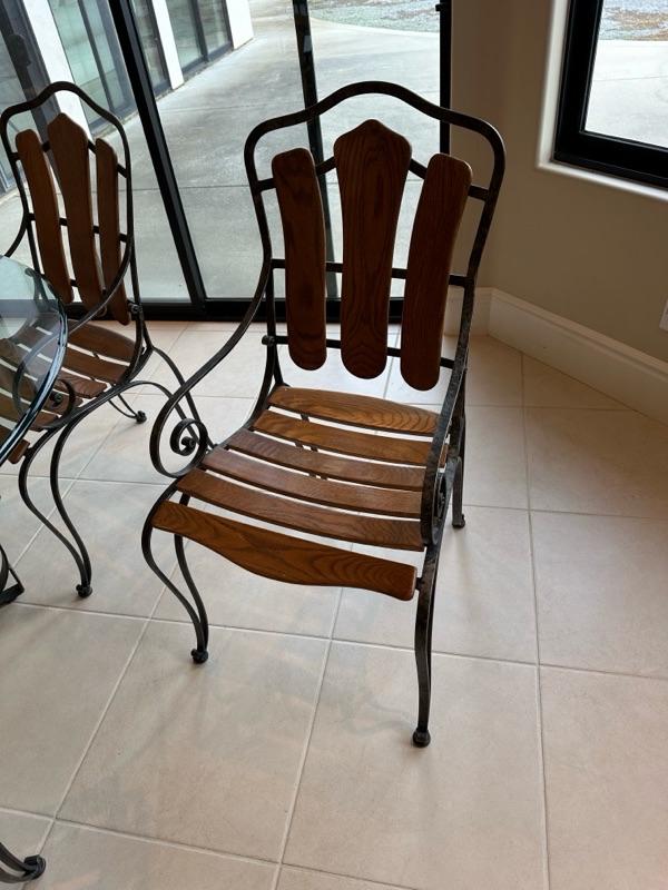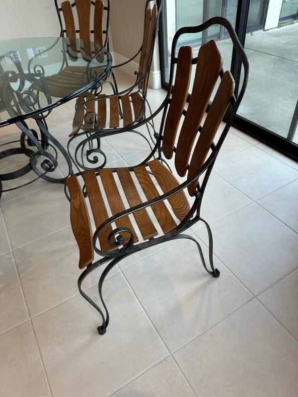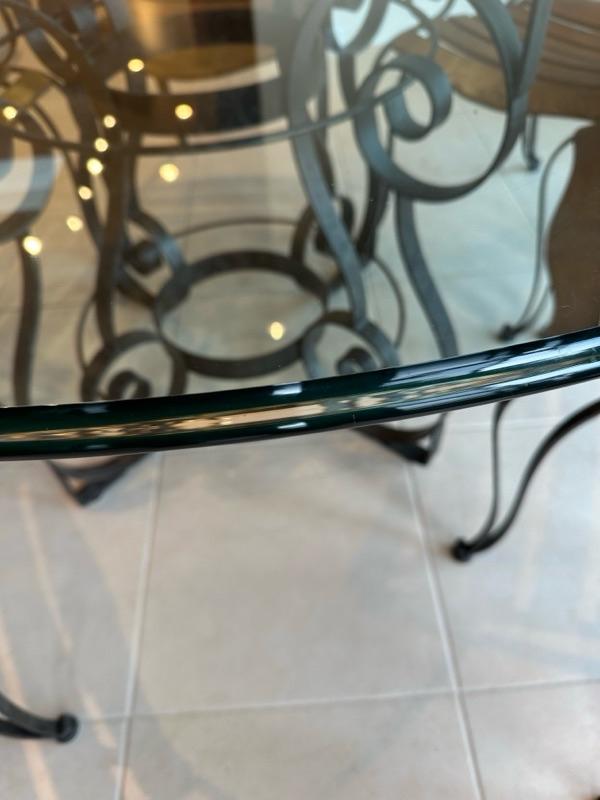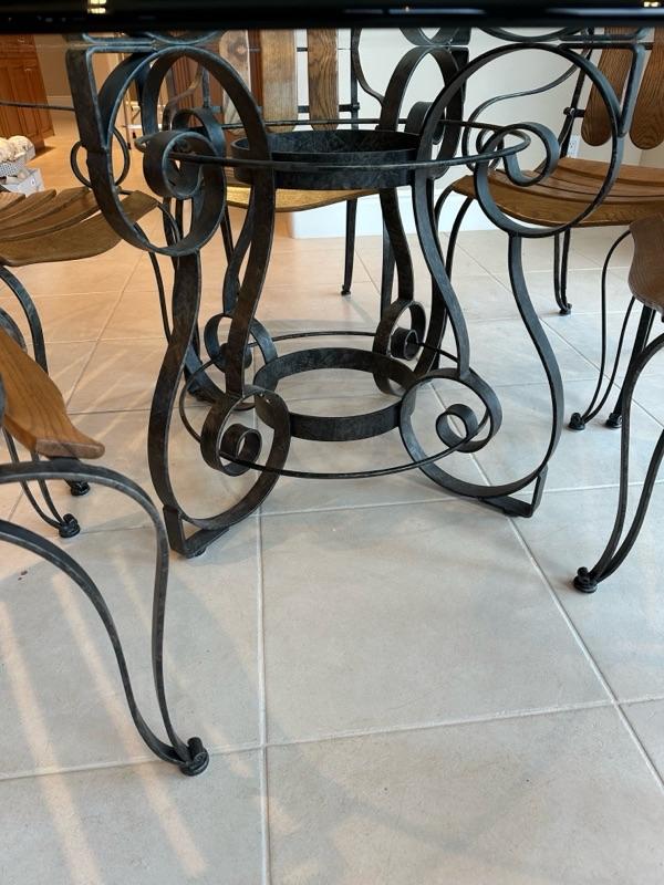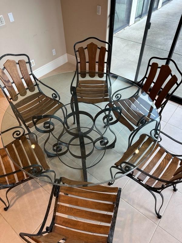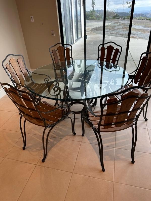 Round glass and metal dining set with six chairs chairs are made of metal and wood glass table top is 5 feet across