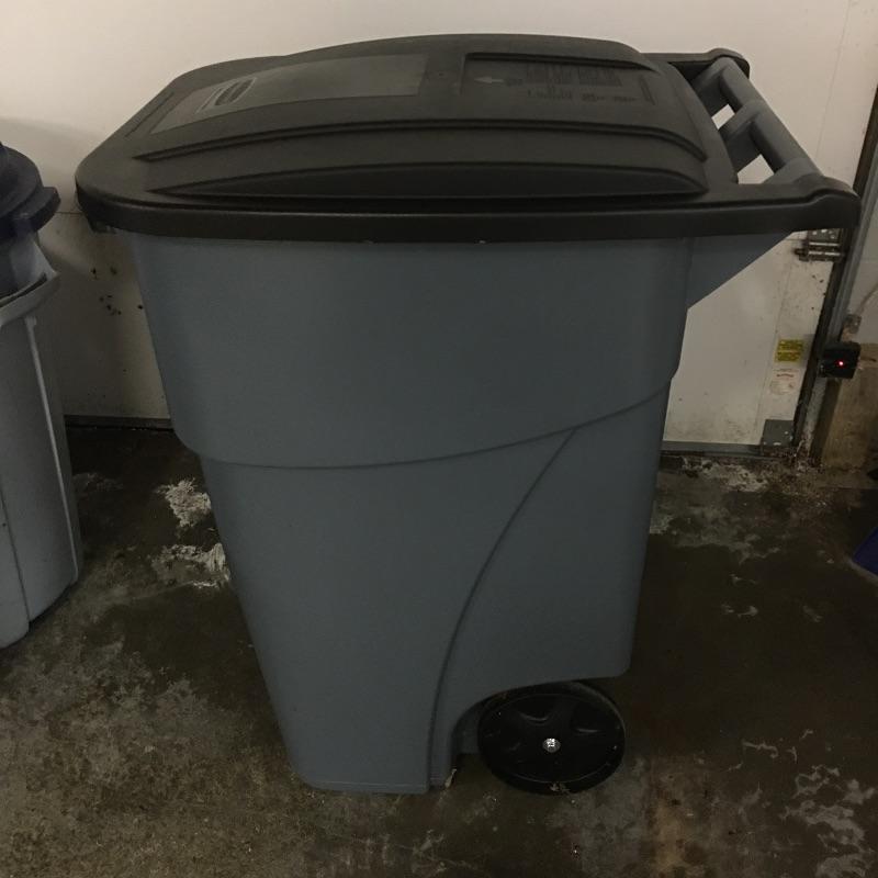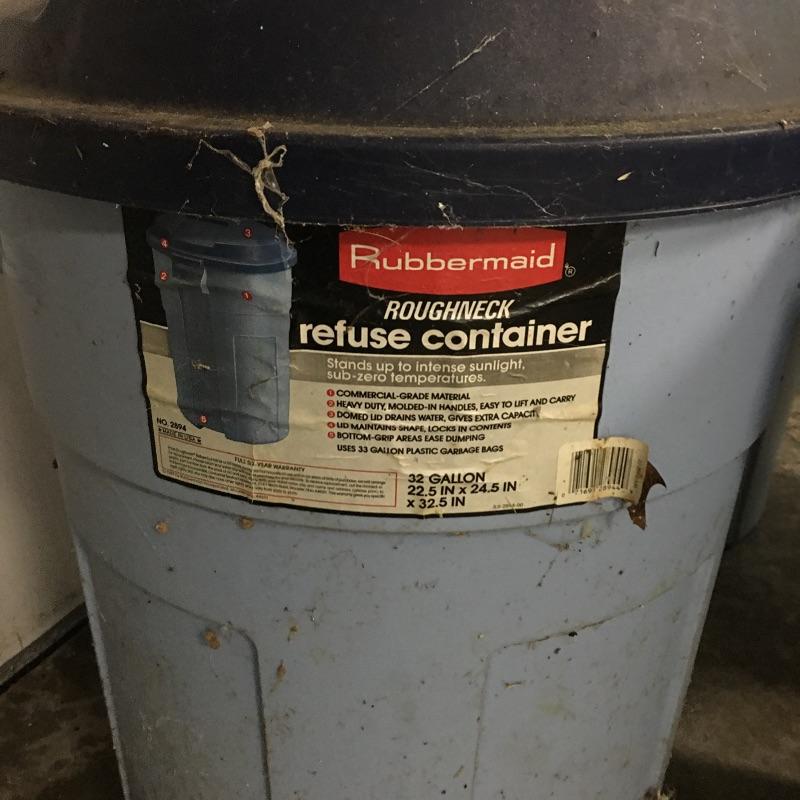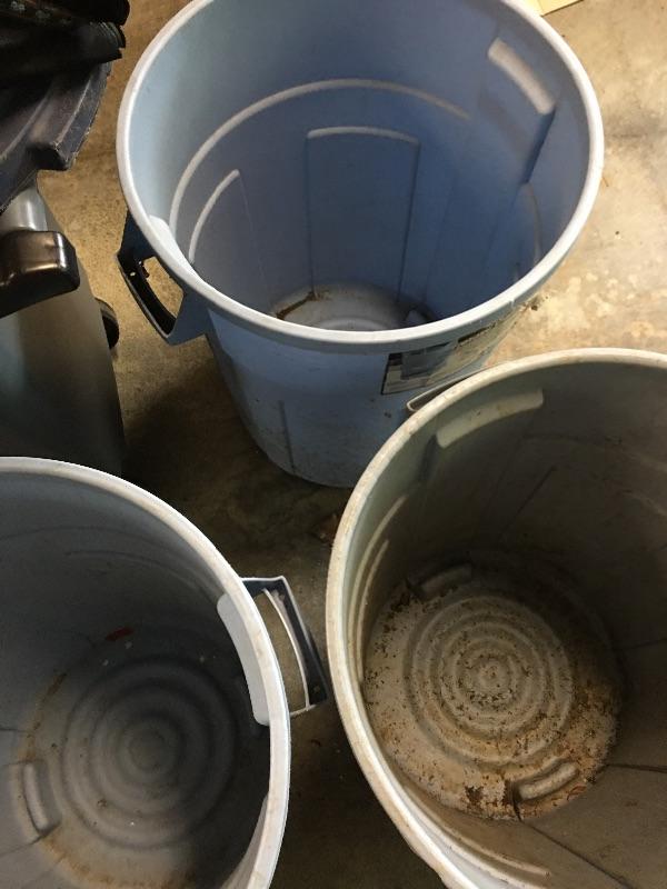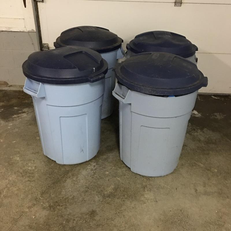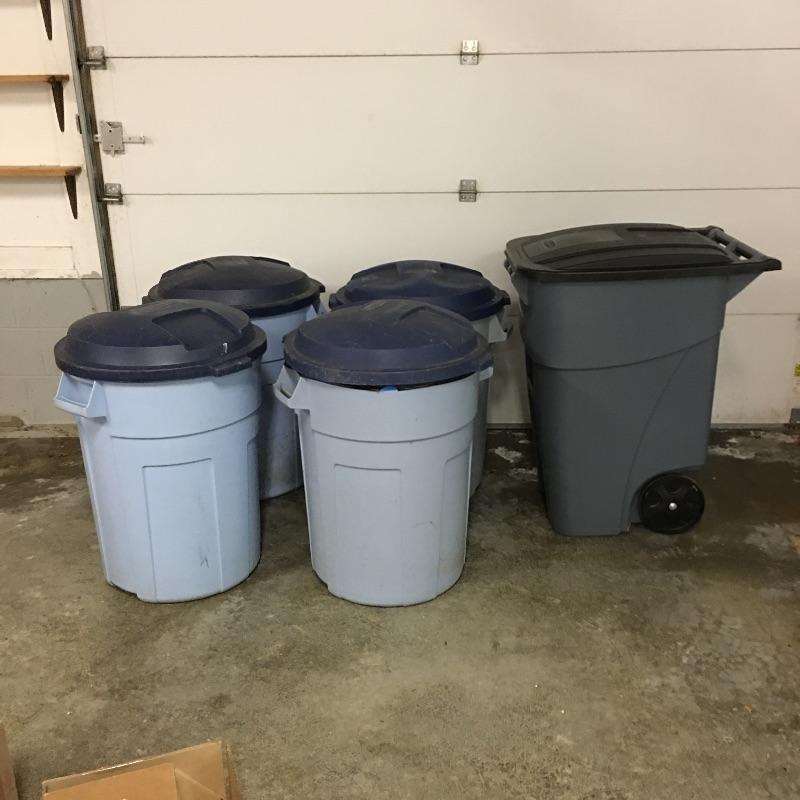 Rubbermaid refuse containers includes four 32 gallon containers and one larger wheeled container.