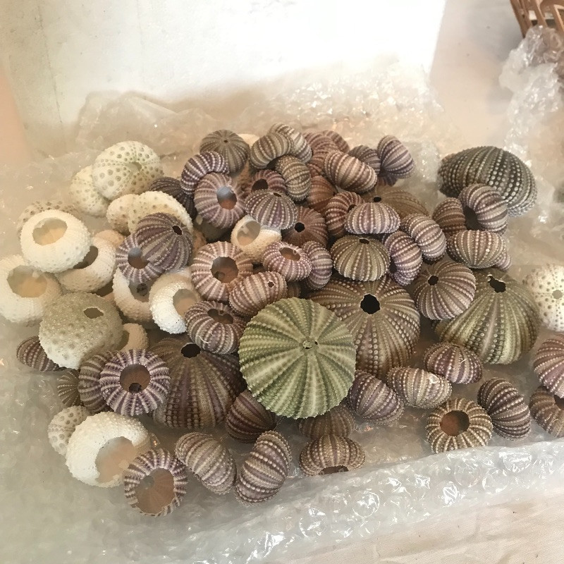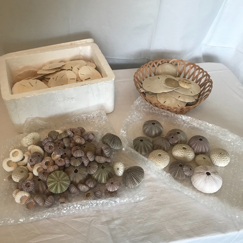 This is a great collection of well preserved sand dollars and sea urchins. These are the most fragile of all and look how many there are!!! The sand dollars in the basket have glitter on them. Local pick up only.