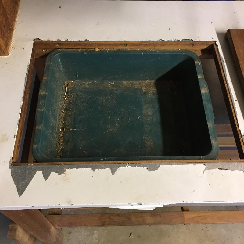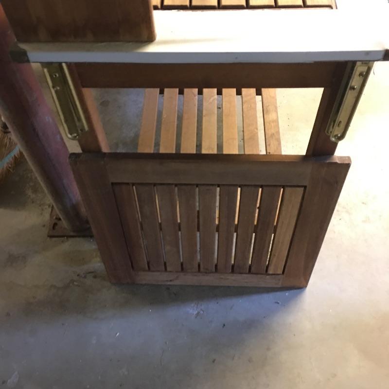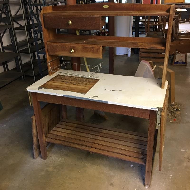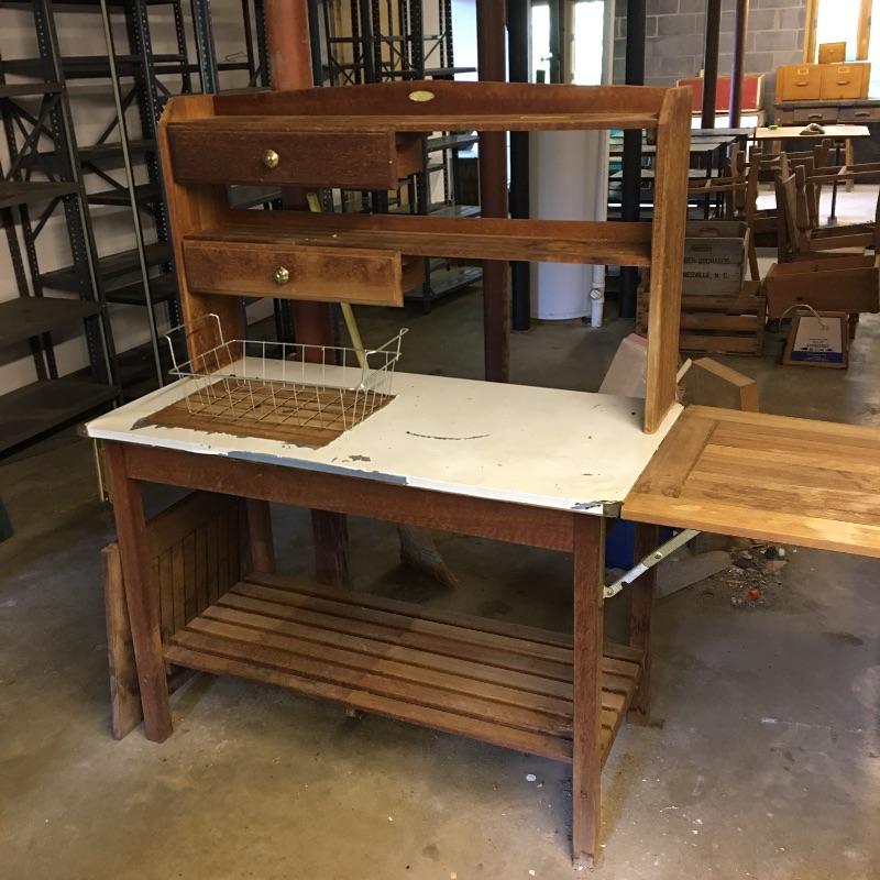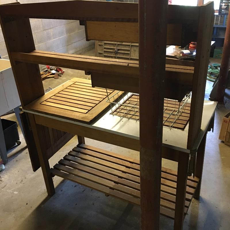This cedar table is perfect for the gardener in your life. This potting table has two drawers, two shelves on top, a shelf underneath, drop leaf side covered potting dry sink. One side on table has not had the drop leaf attached, but it is there. This table has an easy to clean painted metal surface, which has some peeling paint in place, see images.
