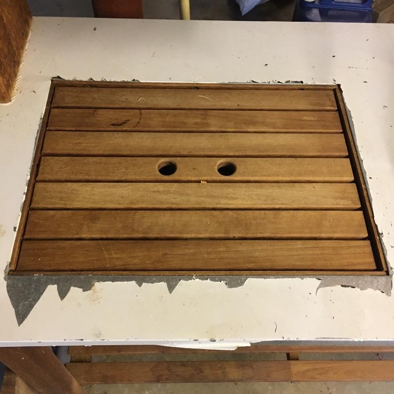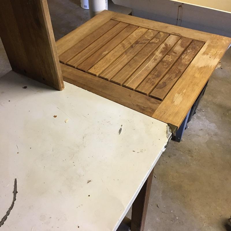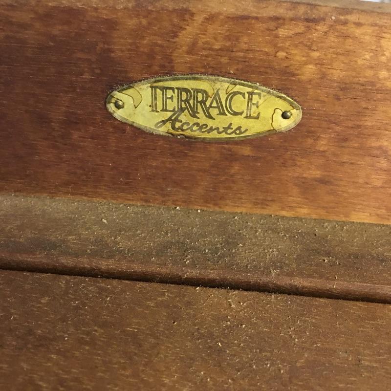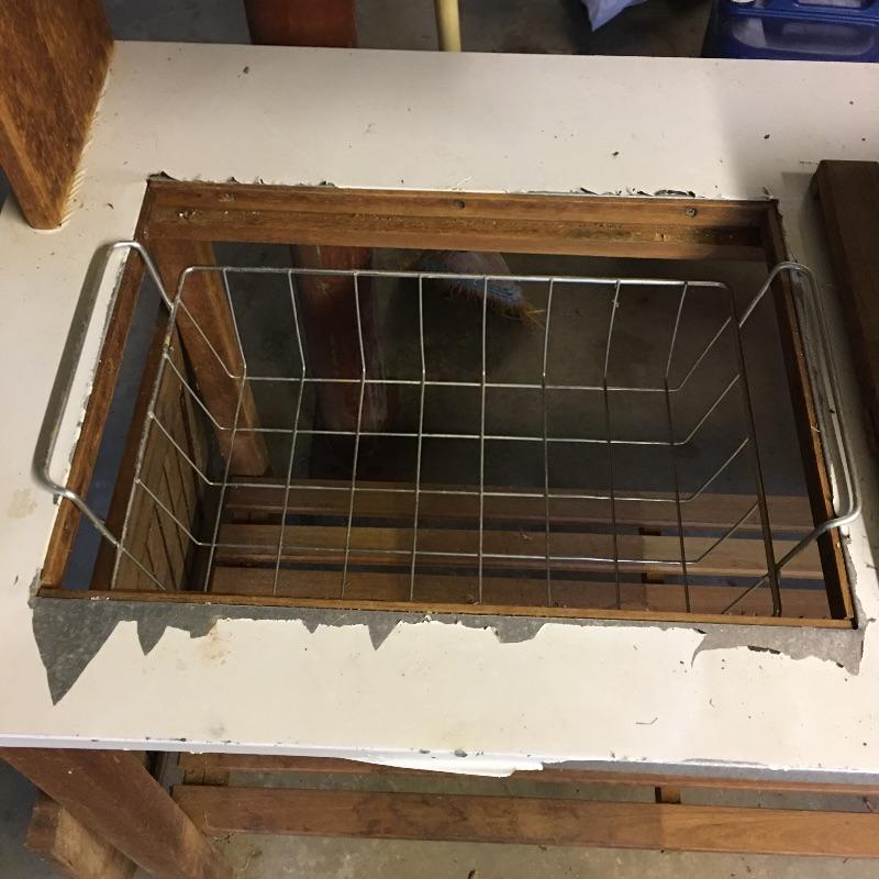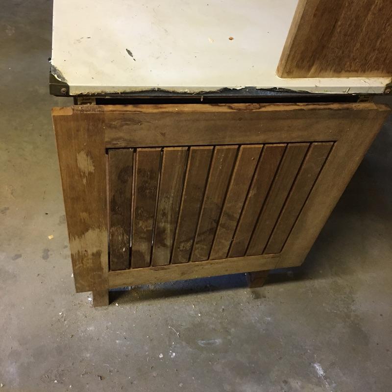 This cedar table is perfect for the gardener in your life. This potting table has two drawers, two shelves on top, a shelf underneath, drop leaf side covered potting dry sink. One side on table has not had the drop leaf attached, but it is there. This table has an easy to clean painted metal surface, which has some peeling paint in place, see images.