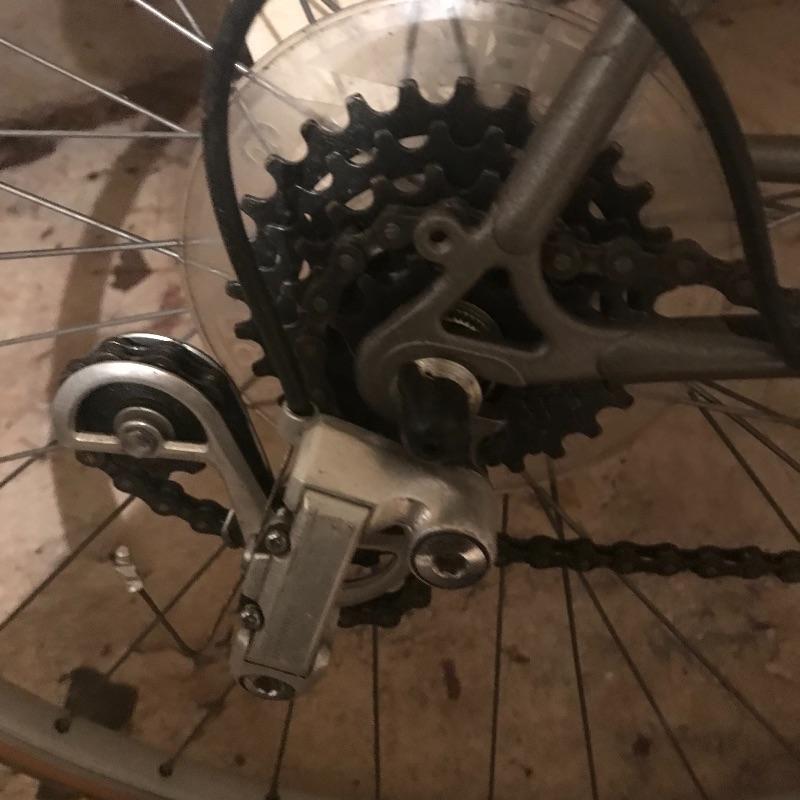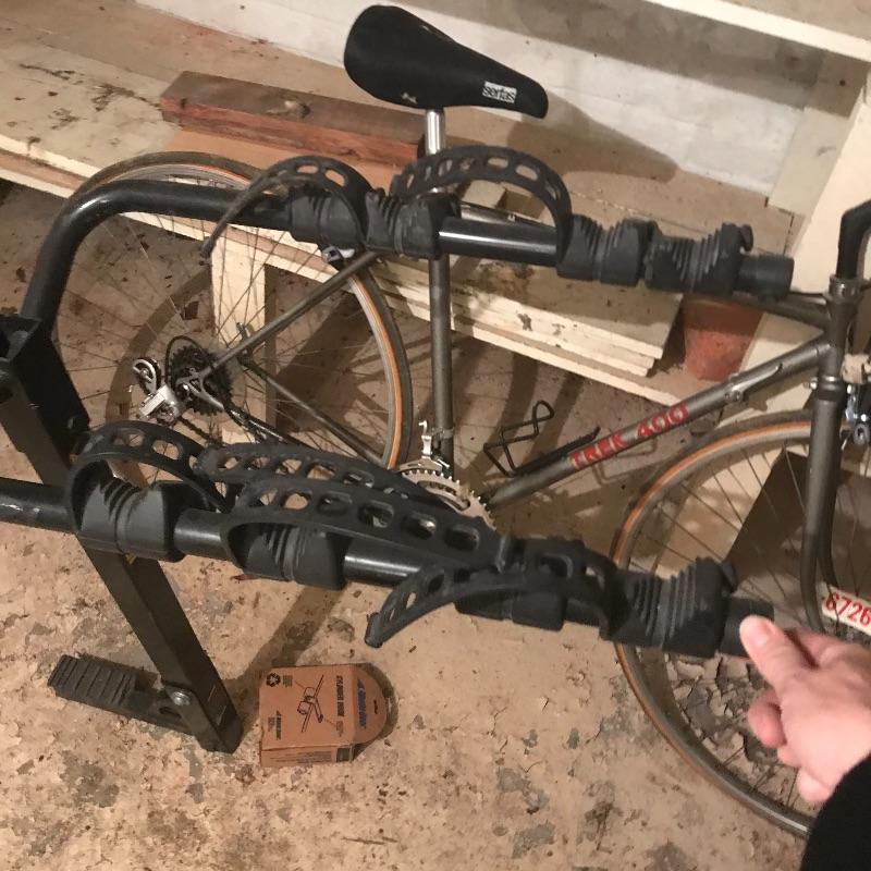 Road bike has Look clip in pedals and Exage Action brakes. Chain is off and both tires flat 27” rims. Appears to be in good condition but needs love. Rhode Gear hitch bike rack can hold four bikes with two straps broken. Needs a hitch pin but otherwise ready for transport. Local pick up only.